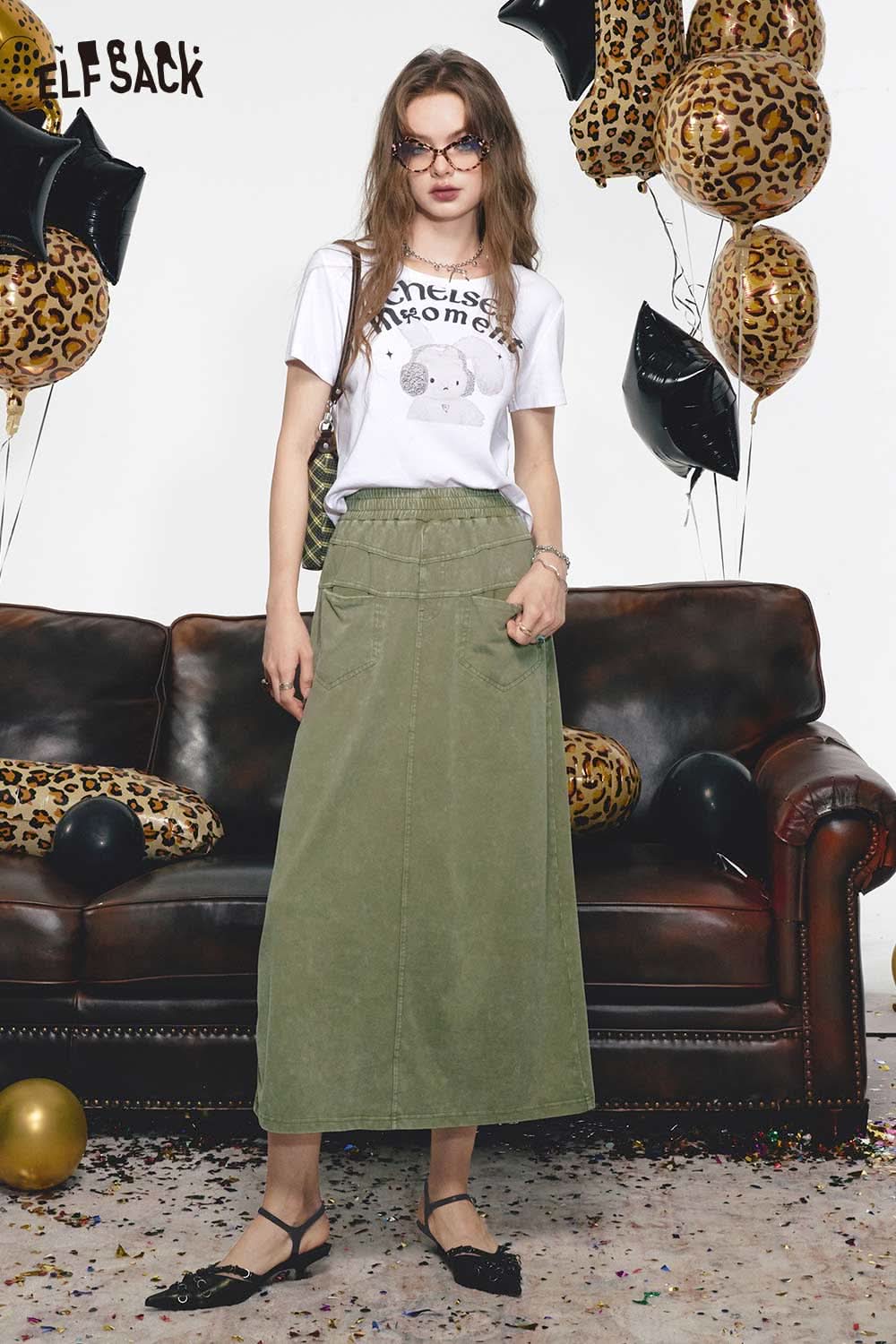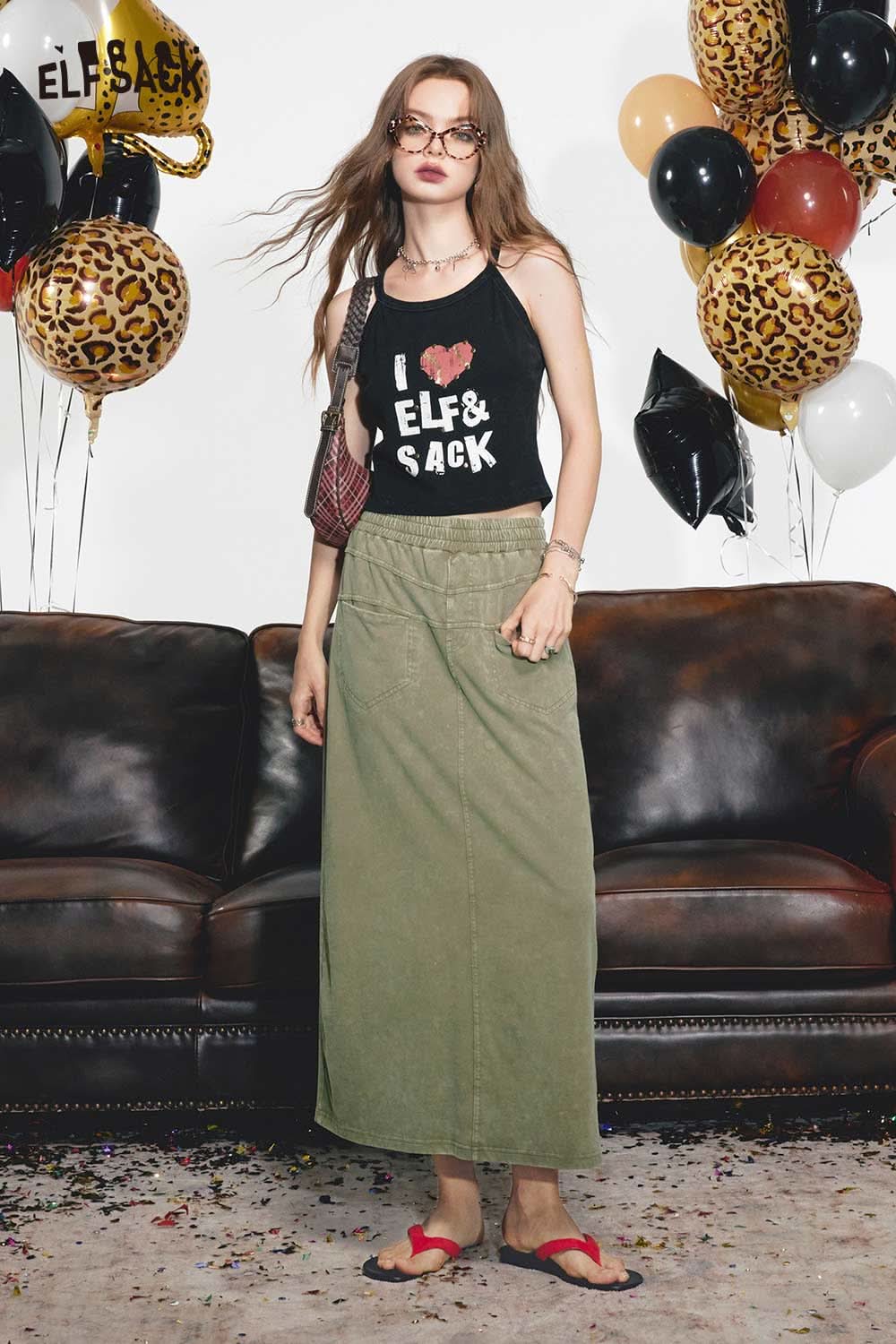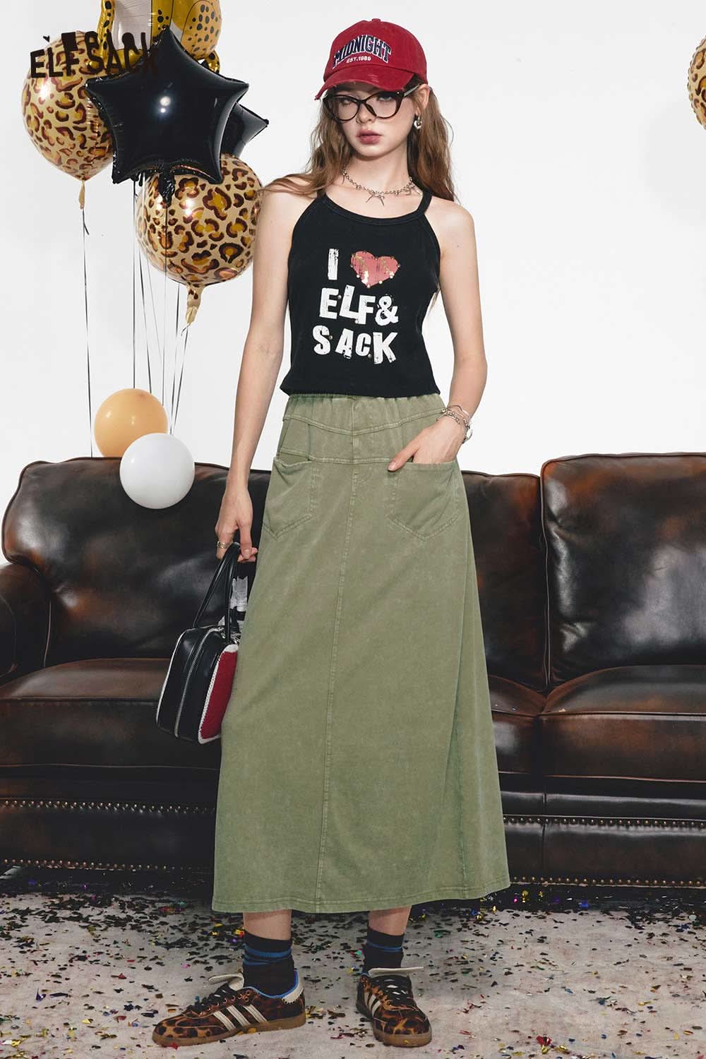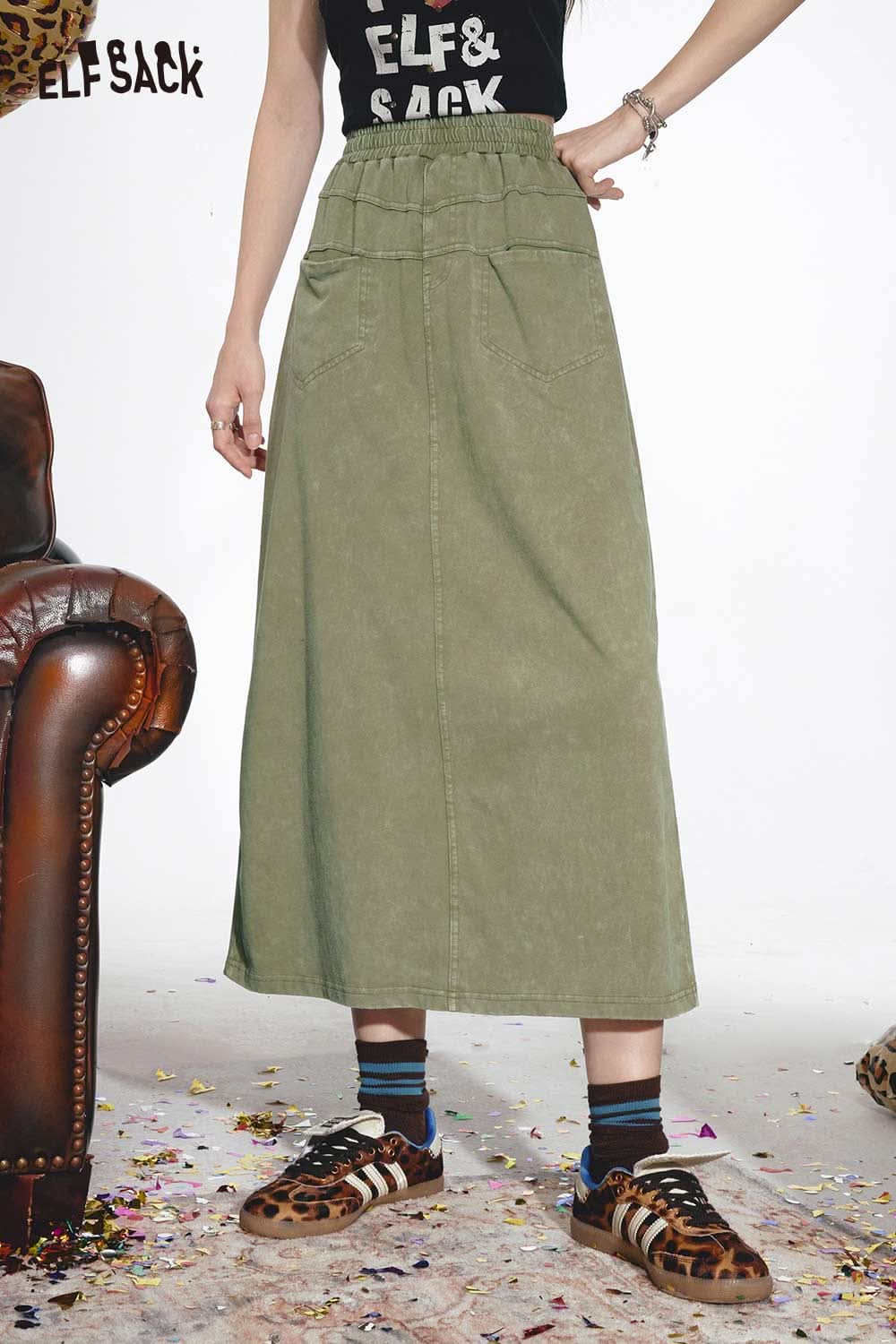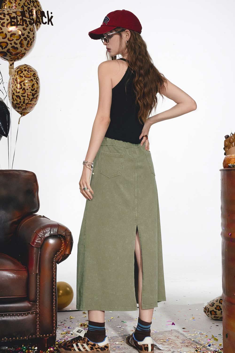 Breathable Washed Army Green Denim Elastic High Waist Long Skirt