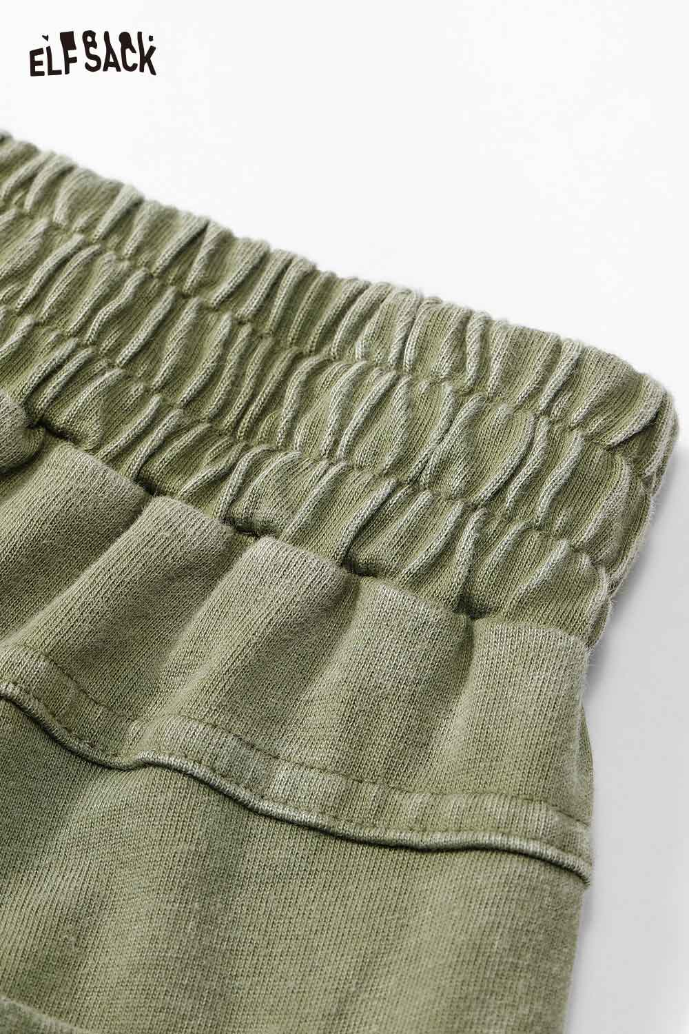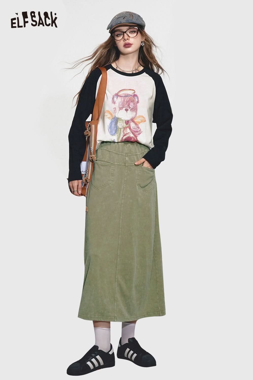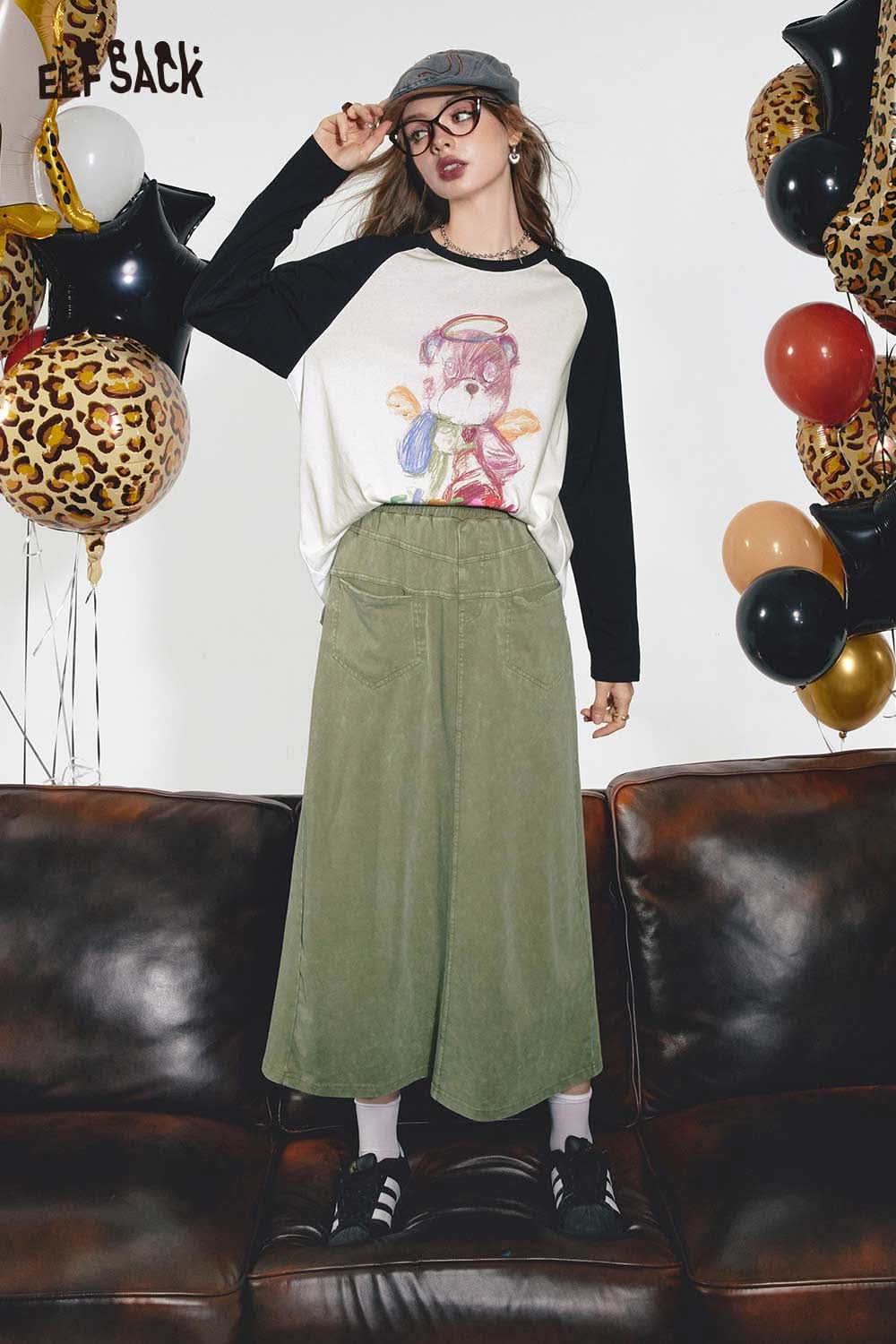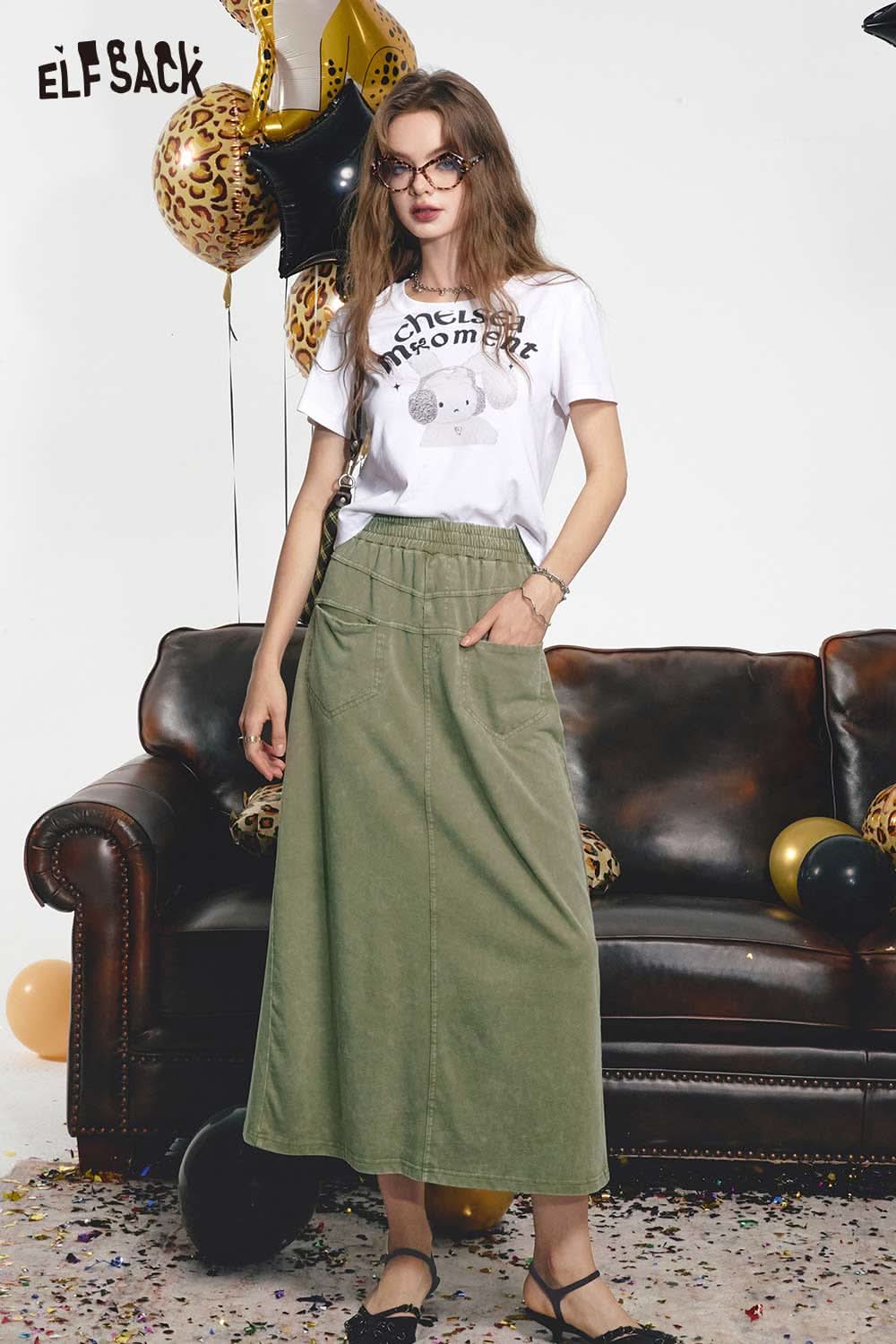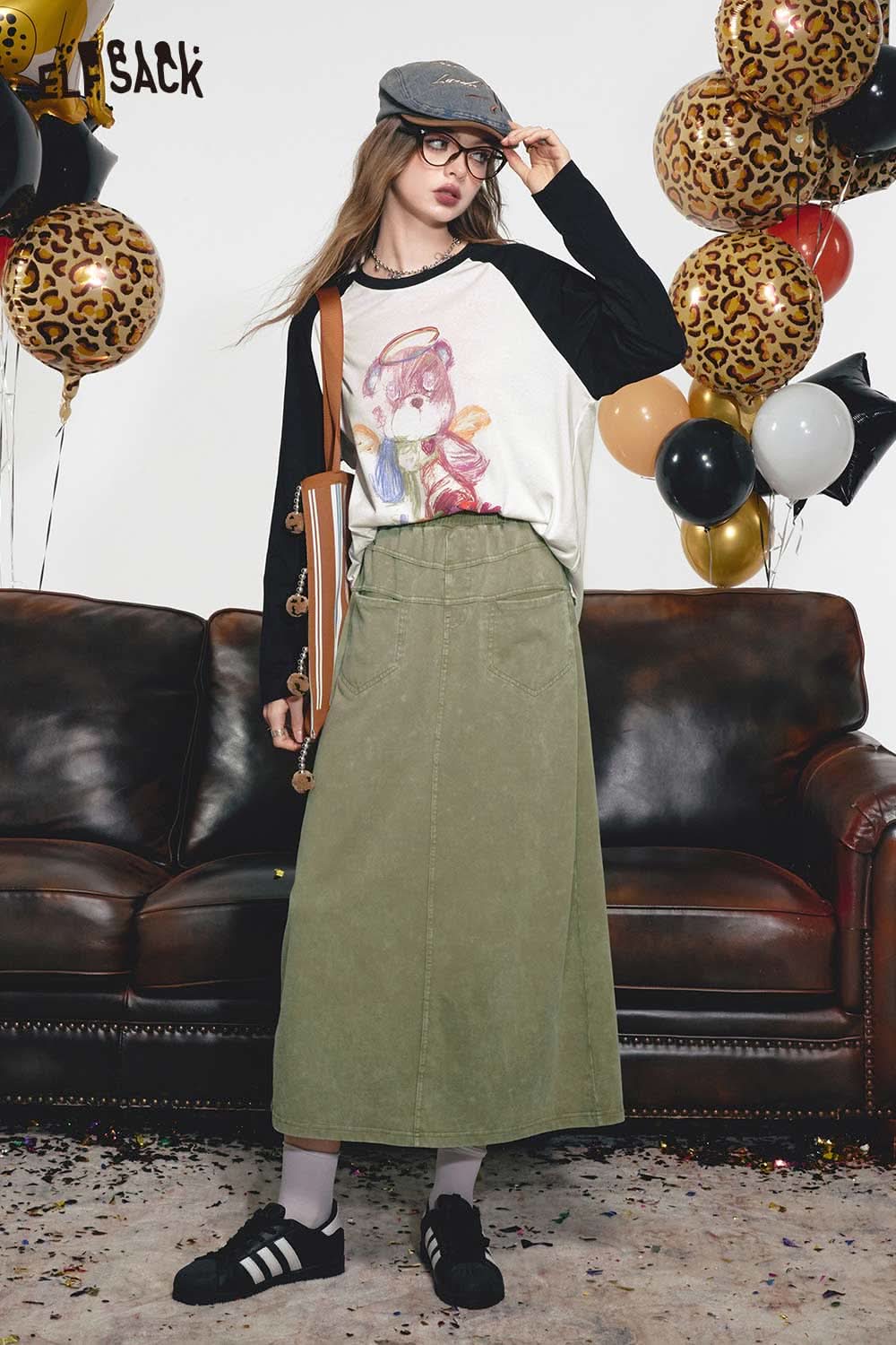 Breathable Washed Army Green Denim Elastic High Waist Long Skirt