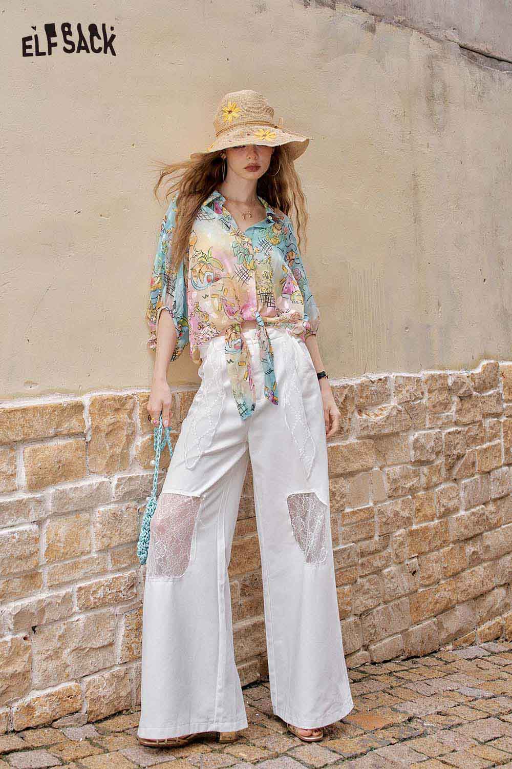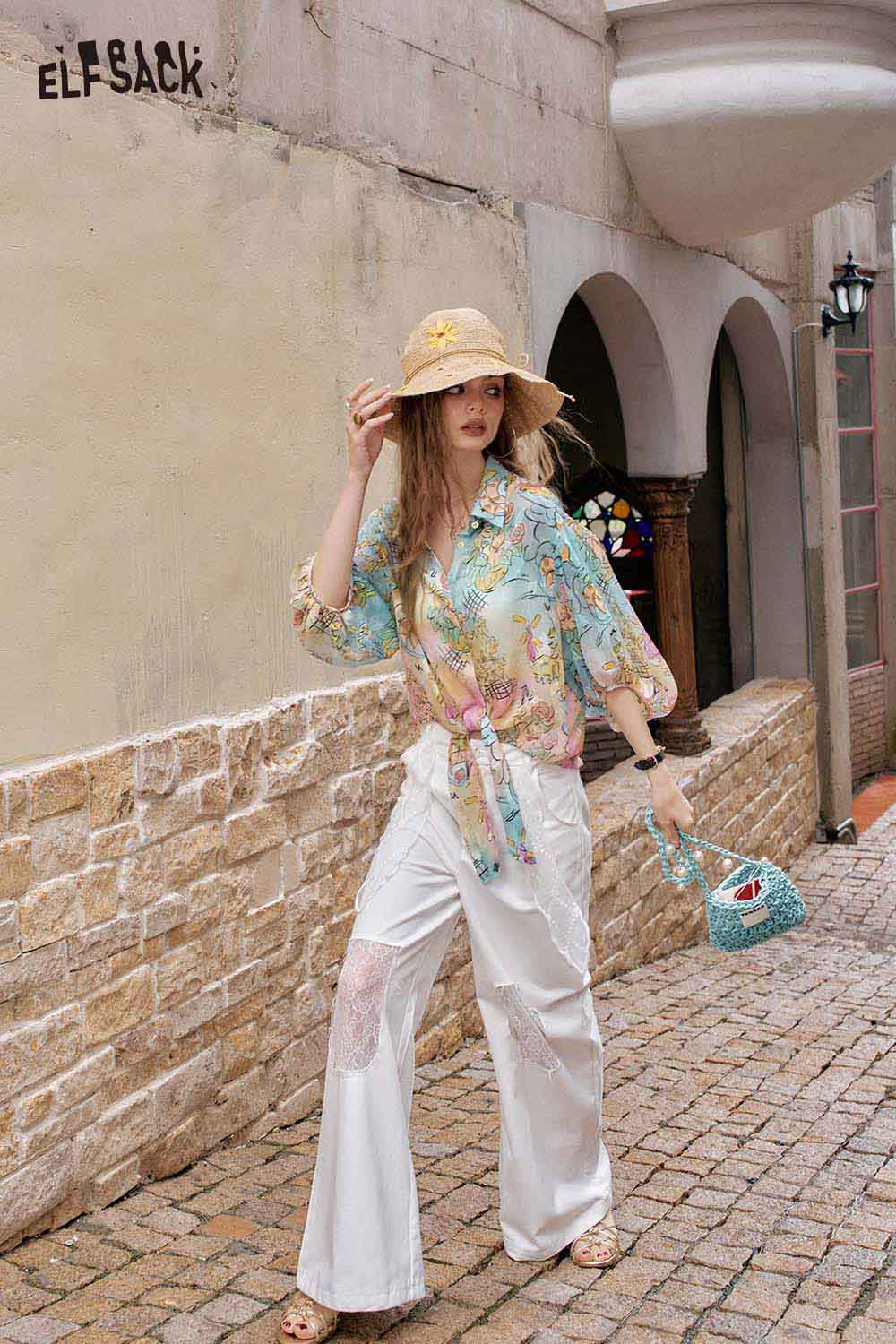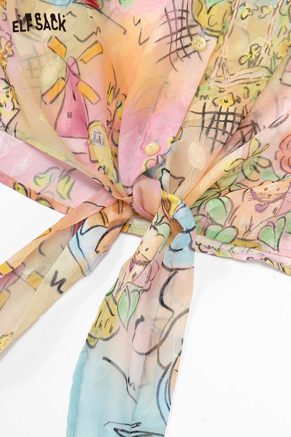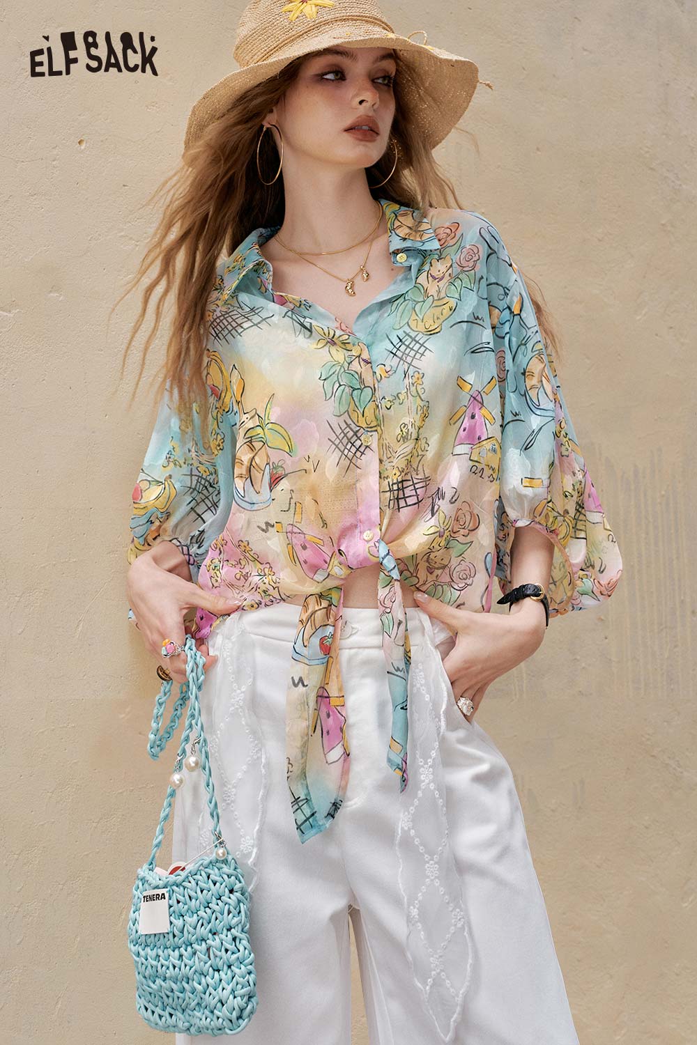 All Over Print Tie Front Long Sleeve Shirt Resort Wear