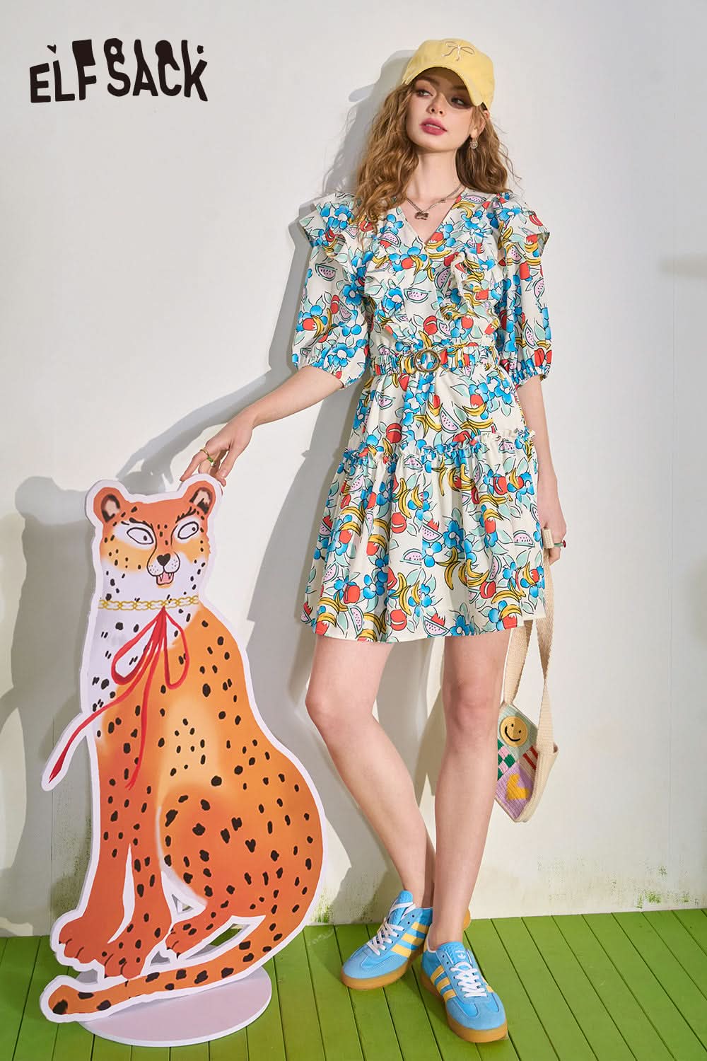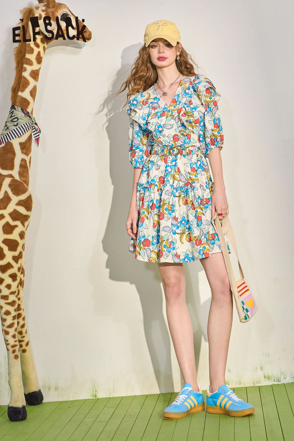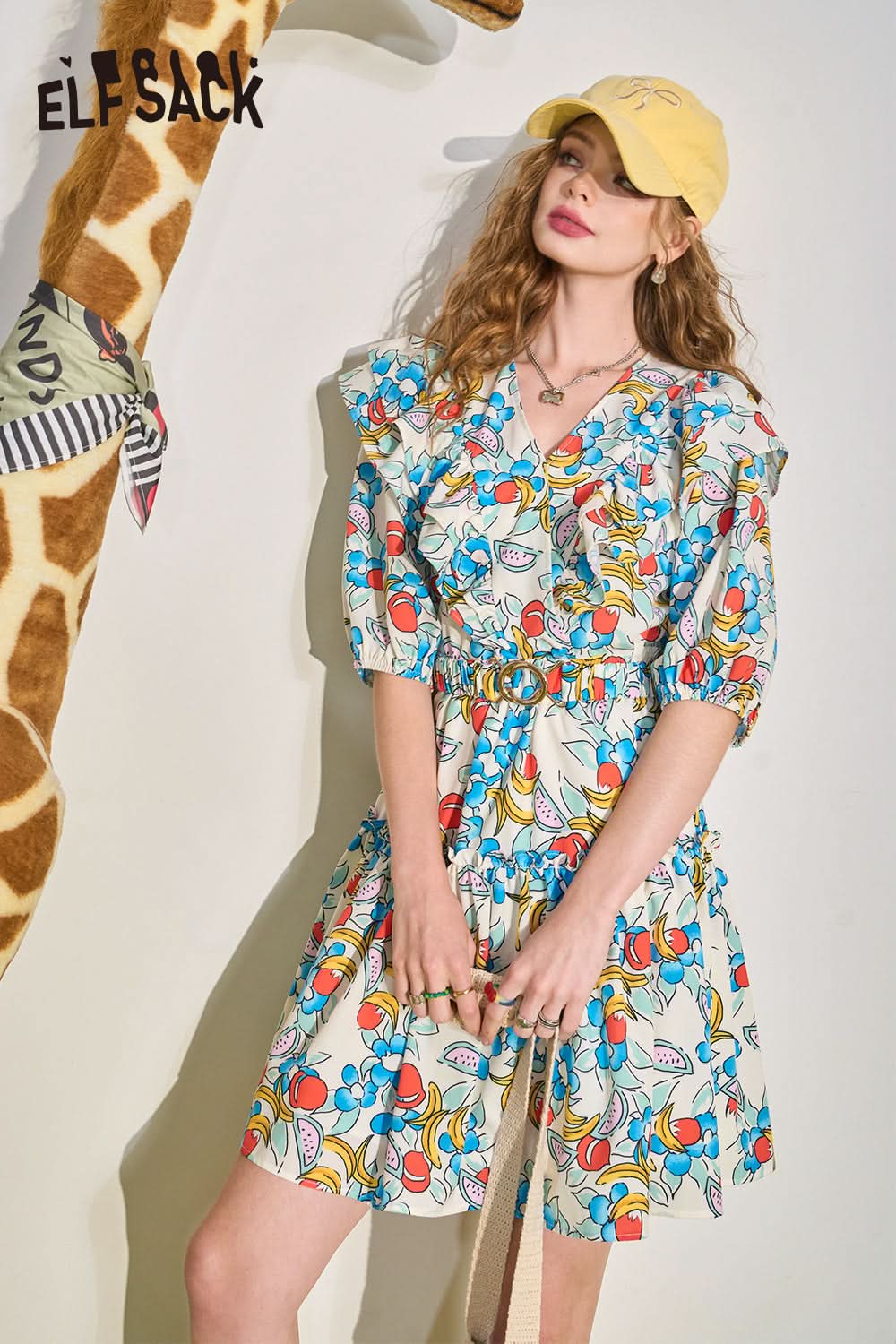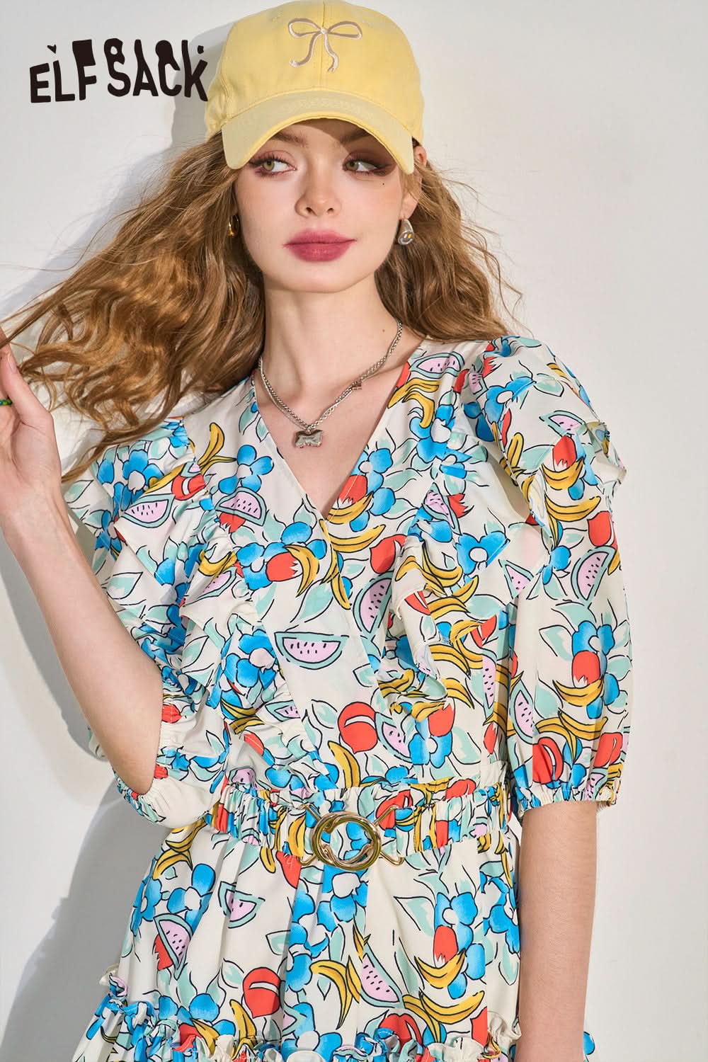 Mushroom Edge V-Neck Waist Wrapped Dress's Slim and Fragmented Flower Skirt