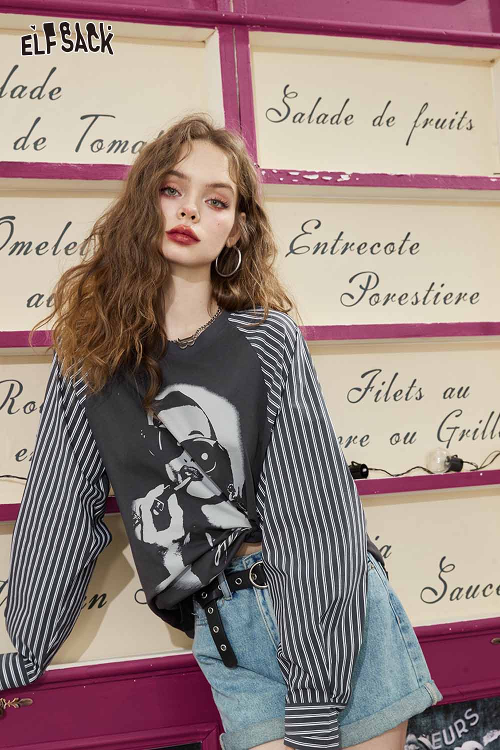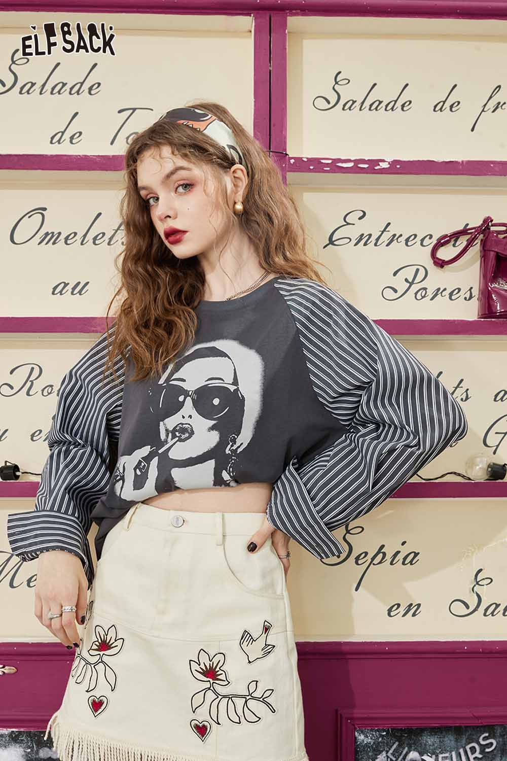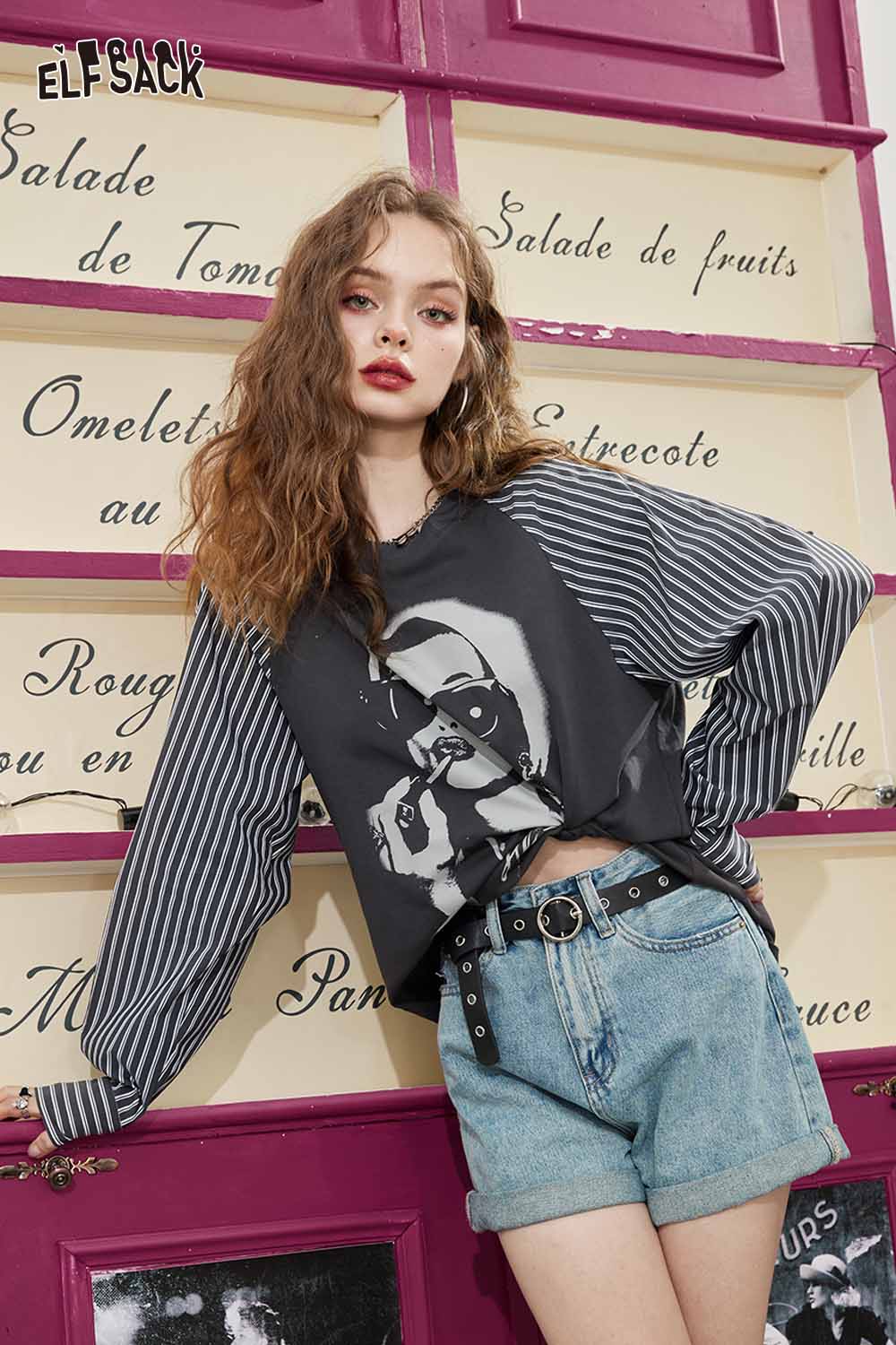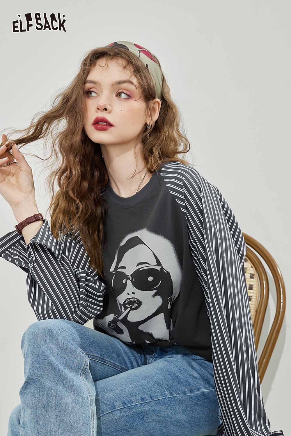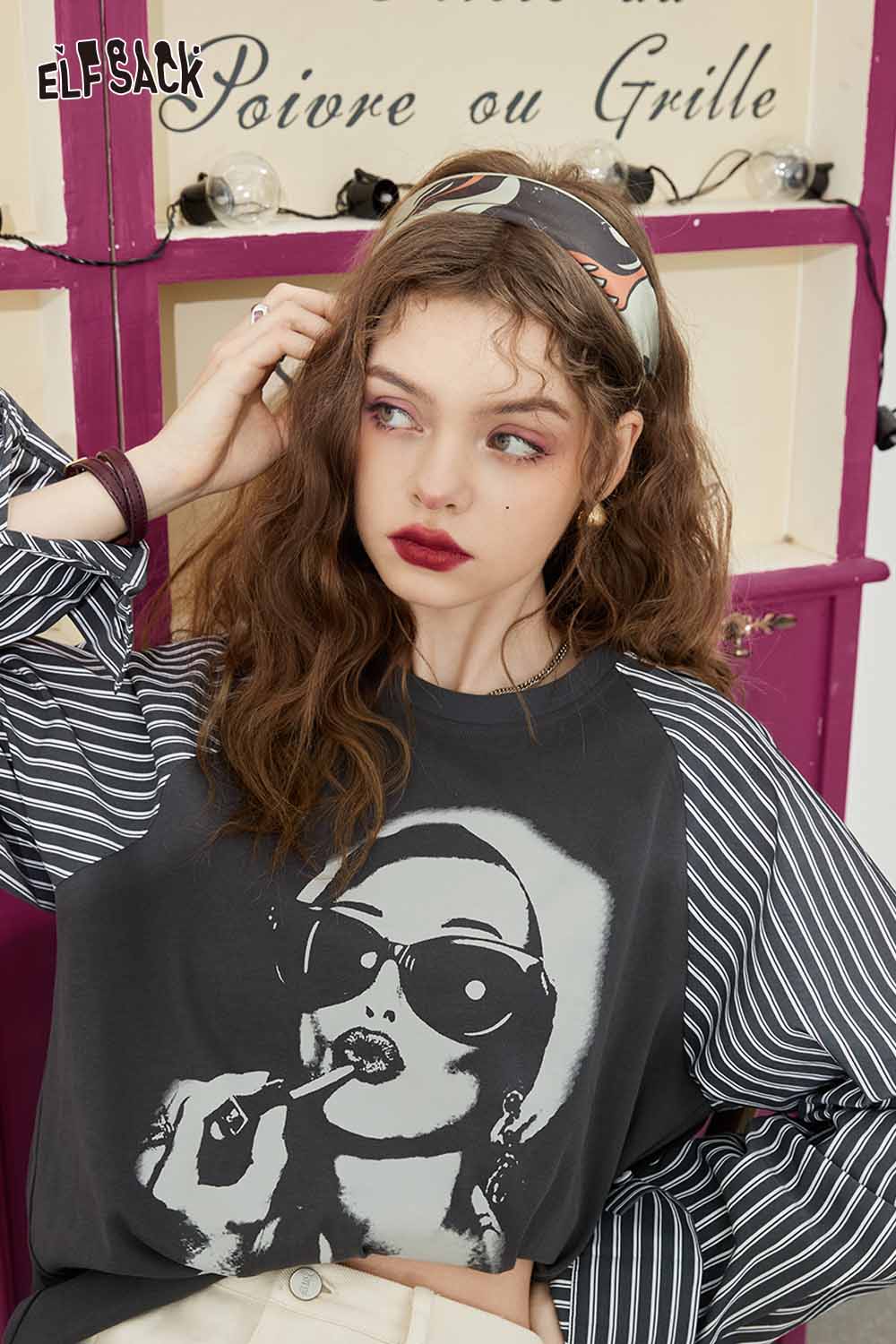 Loose Stripe Patchwork Raglan Sleeve Graphic Tshirt