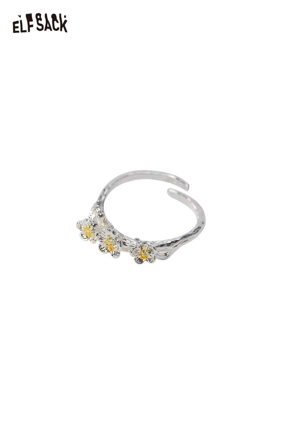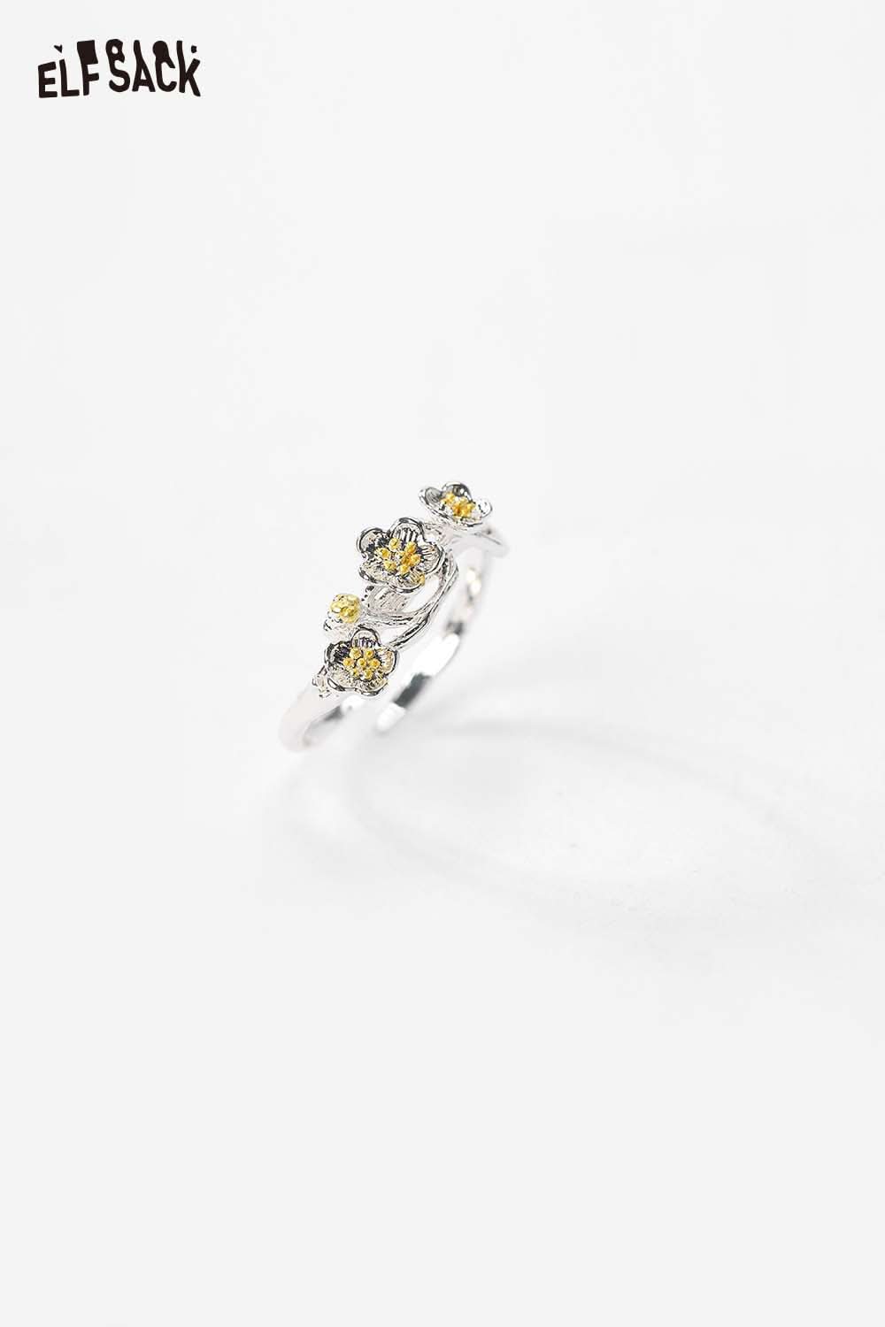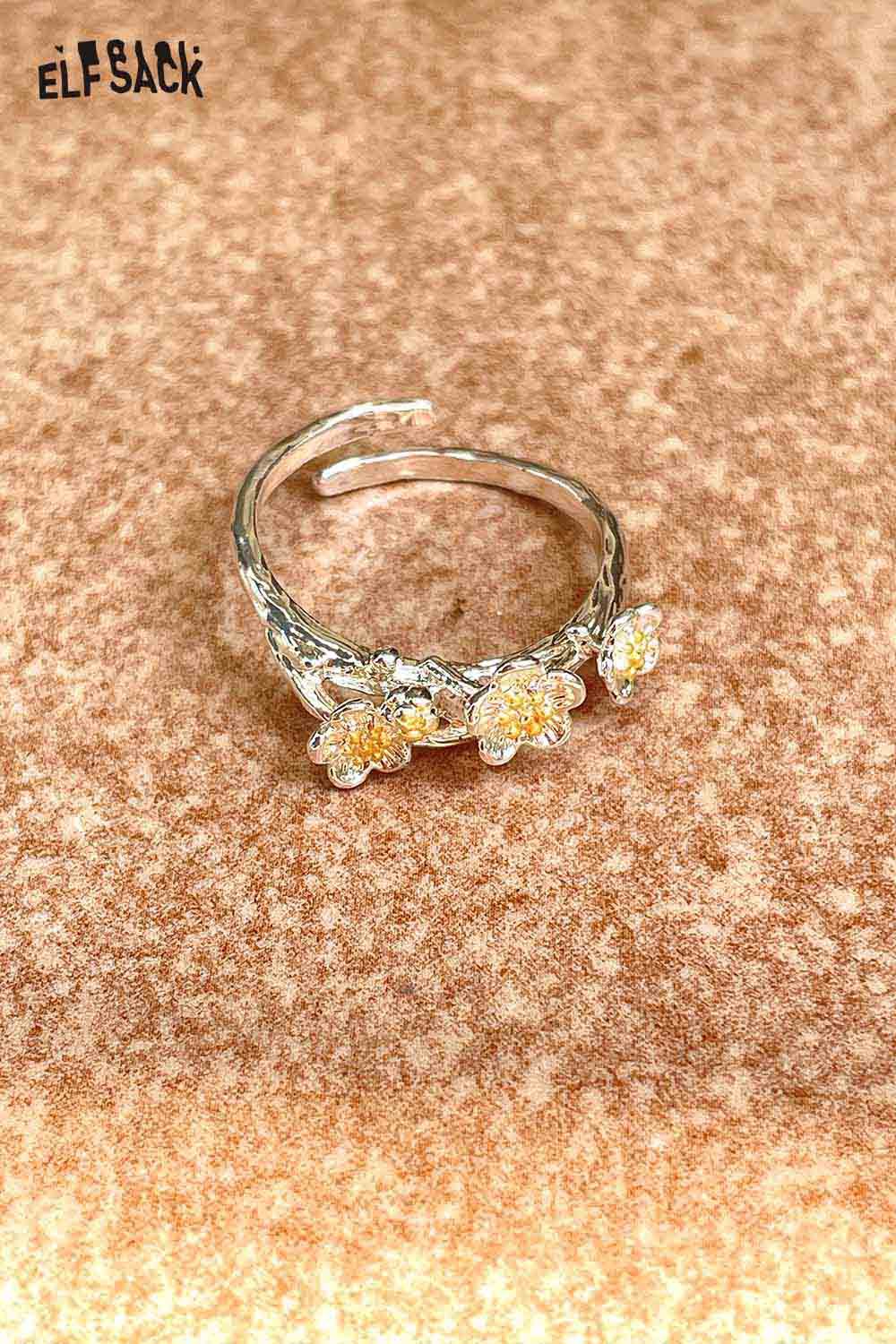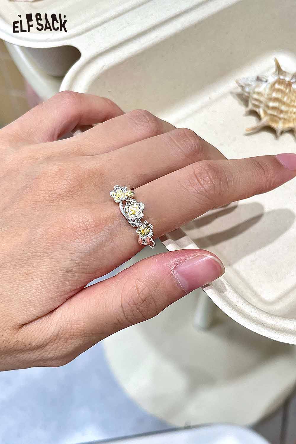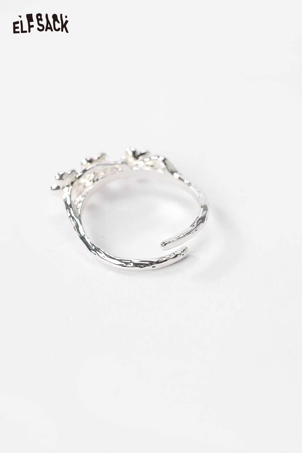 Silver Colored Diamond Inlaid Flower Receptacle-Shaped Adjustable Open Ring