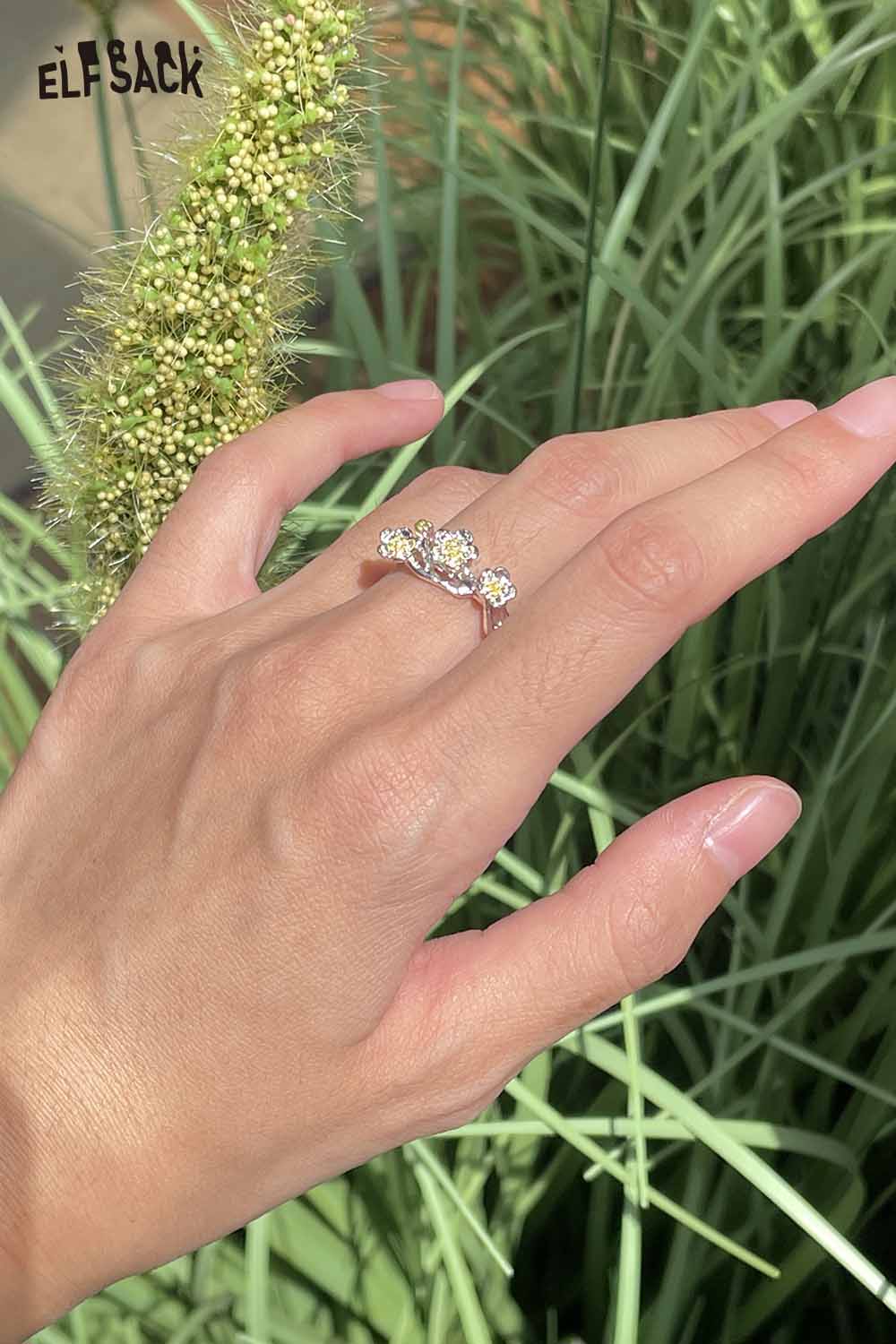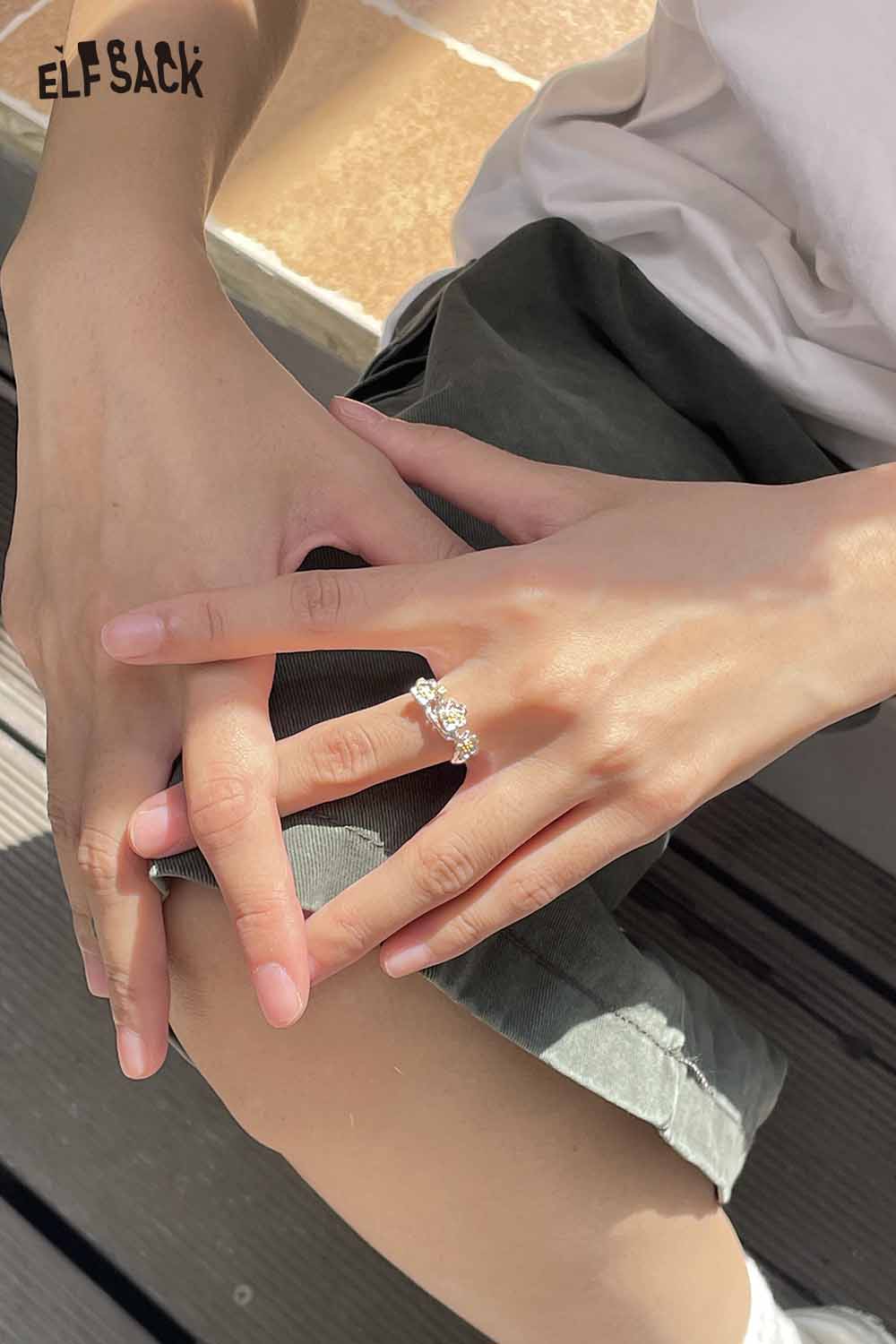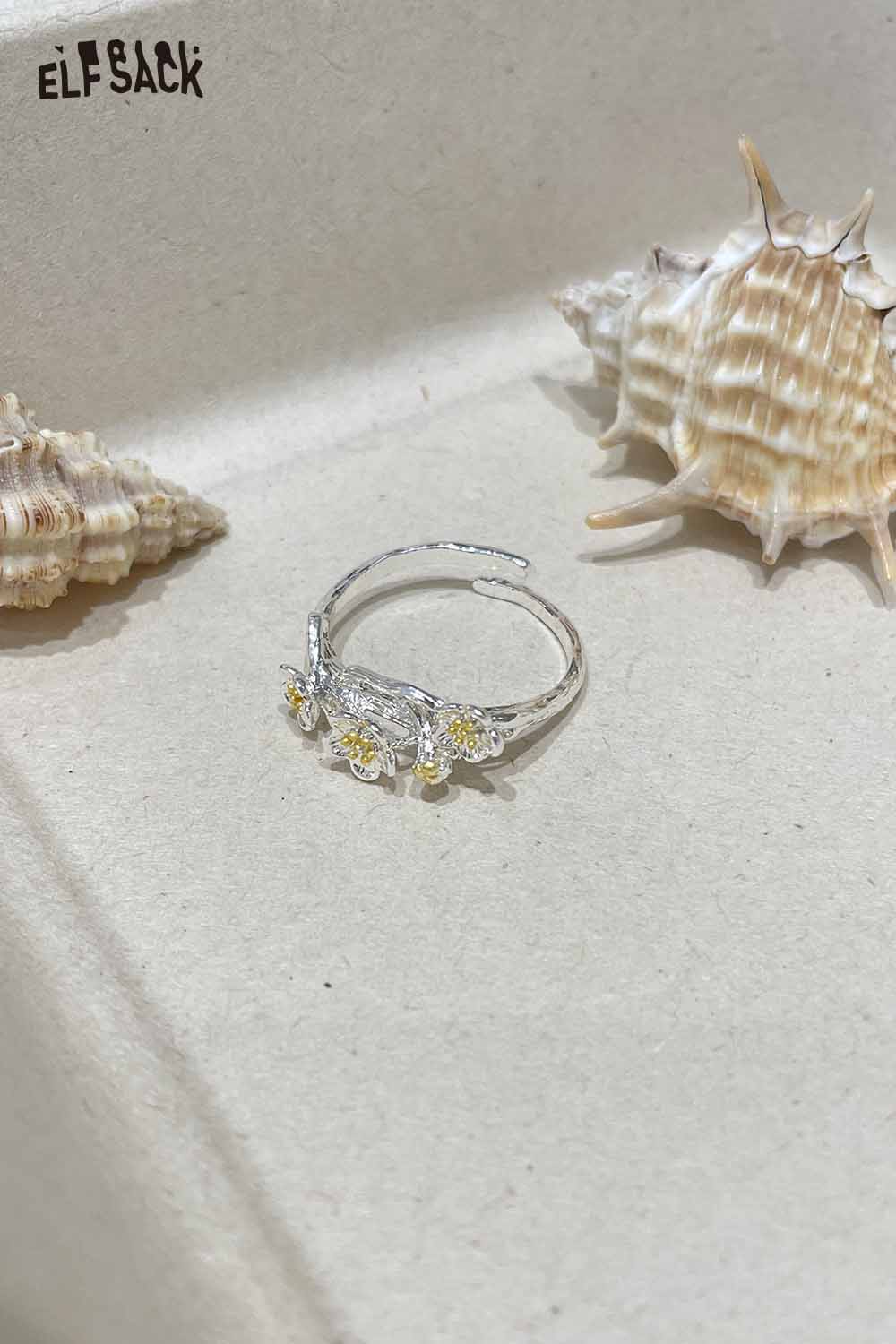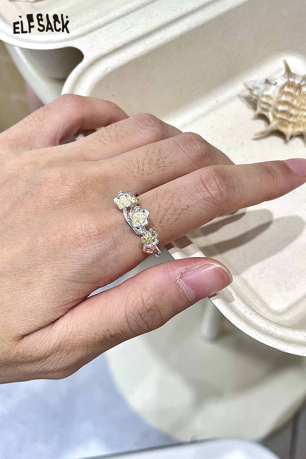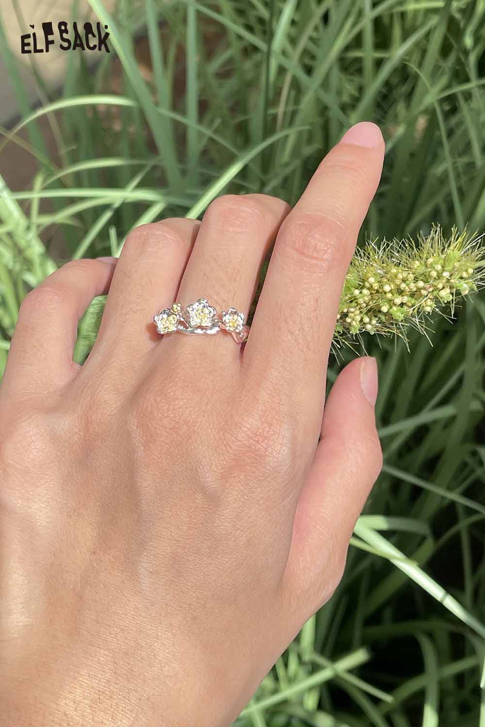 Silver Colored Diamond Inlaid Flower Receptacle-Shaped Adjustable Open Ring