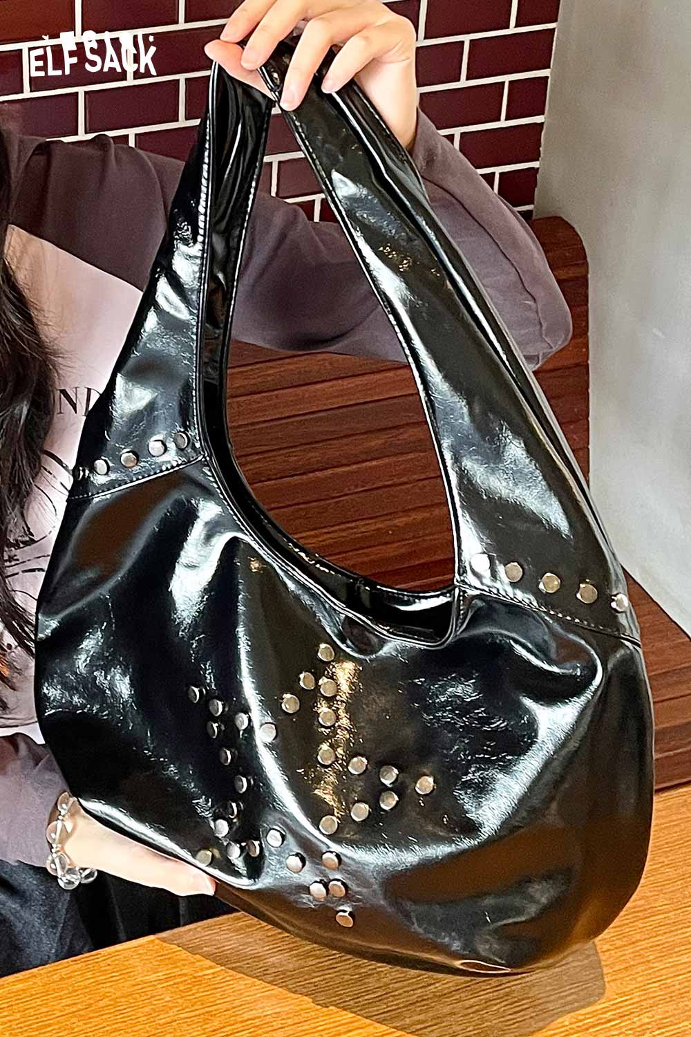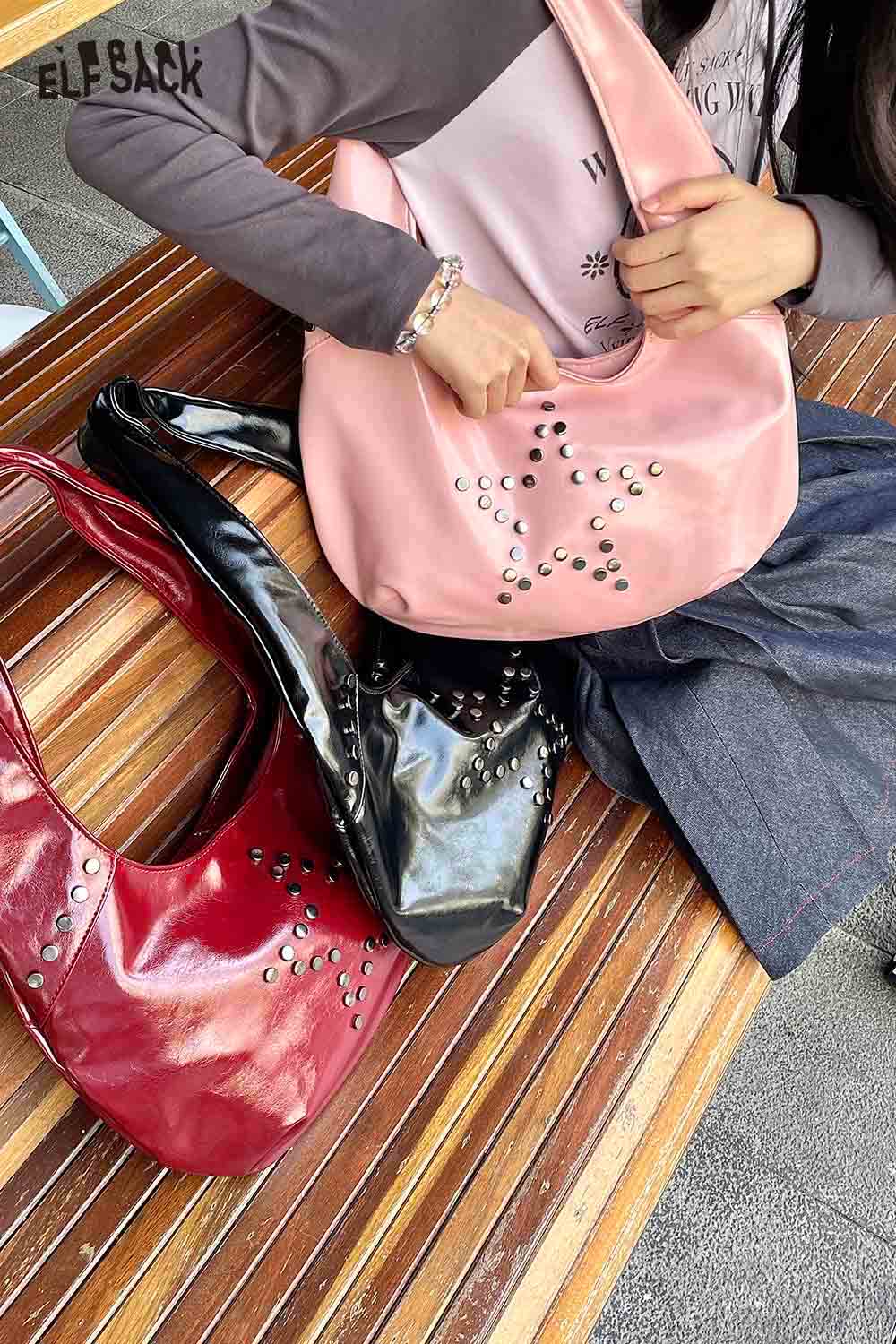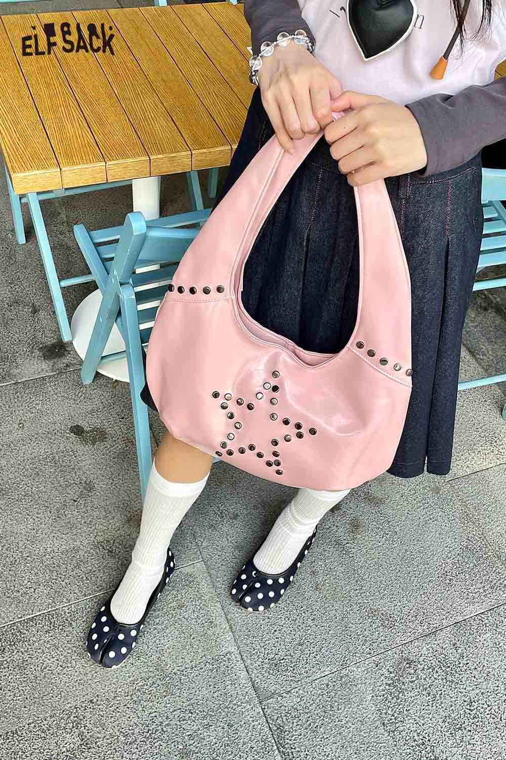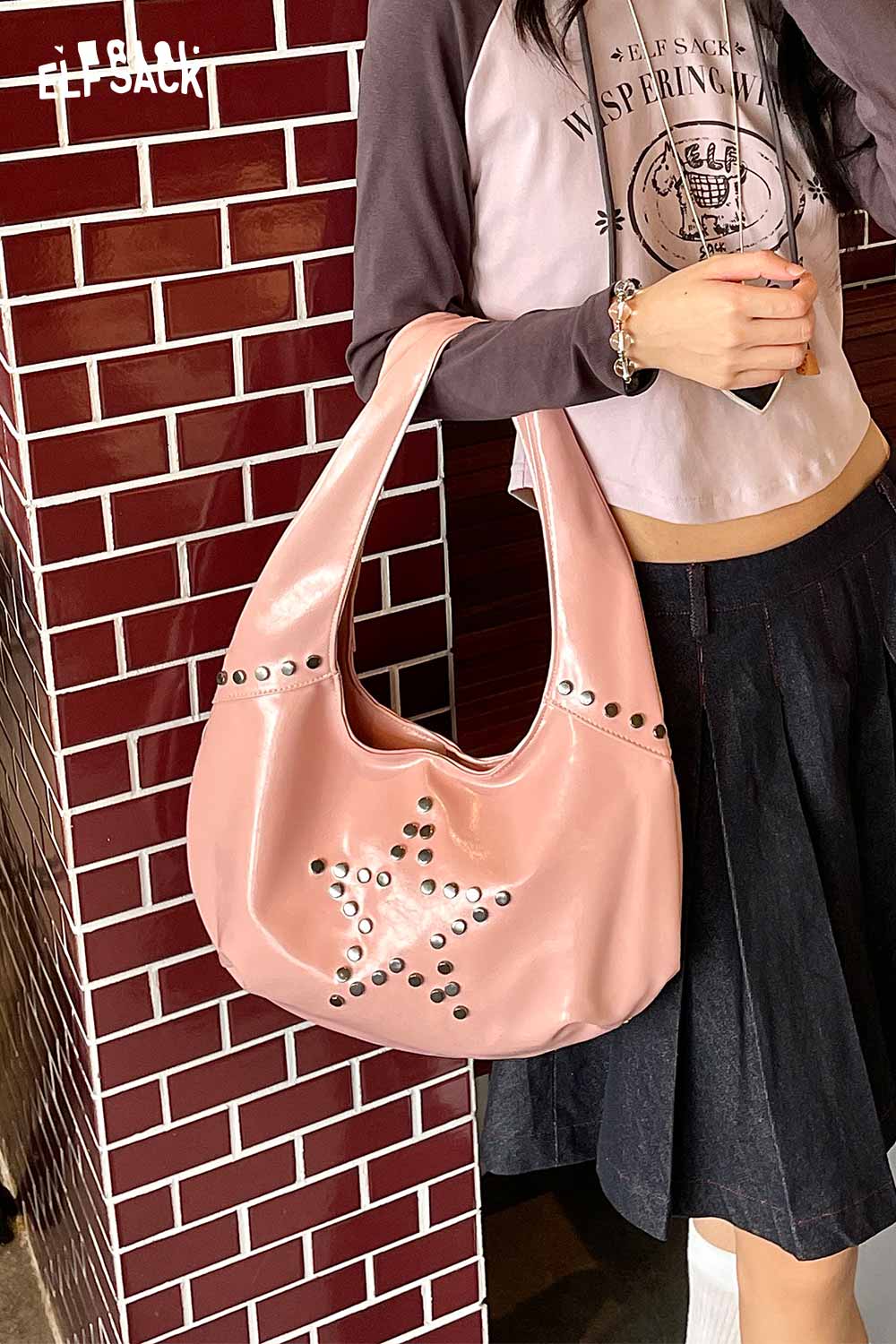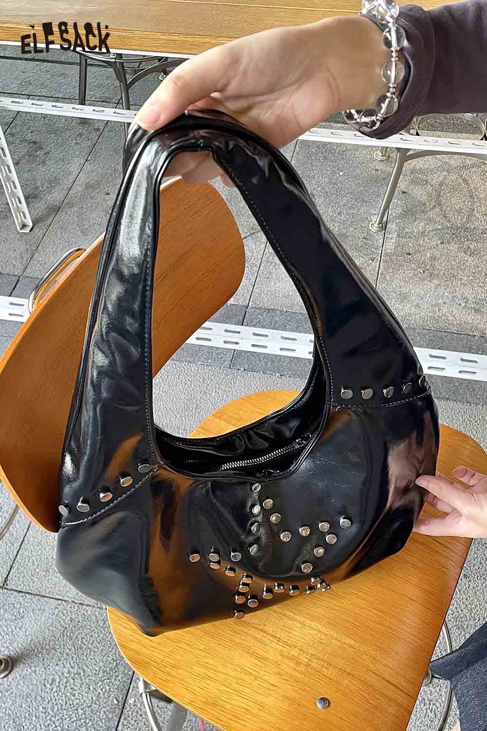 PU Leather Glossy Finish Star Shaped Studded Top Handle Bag