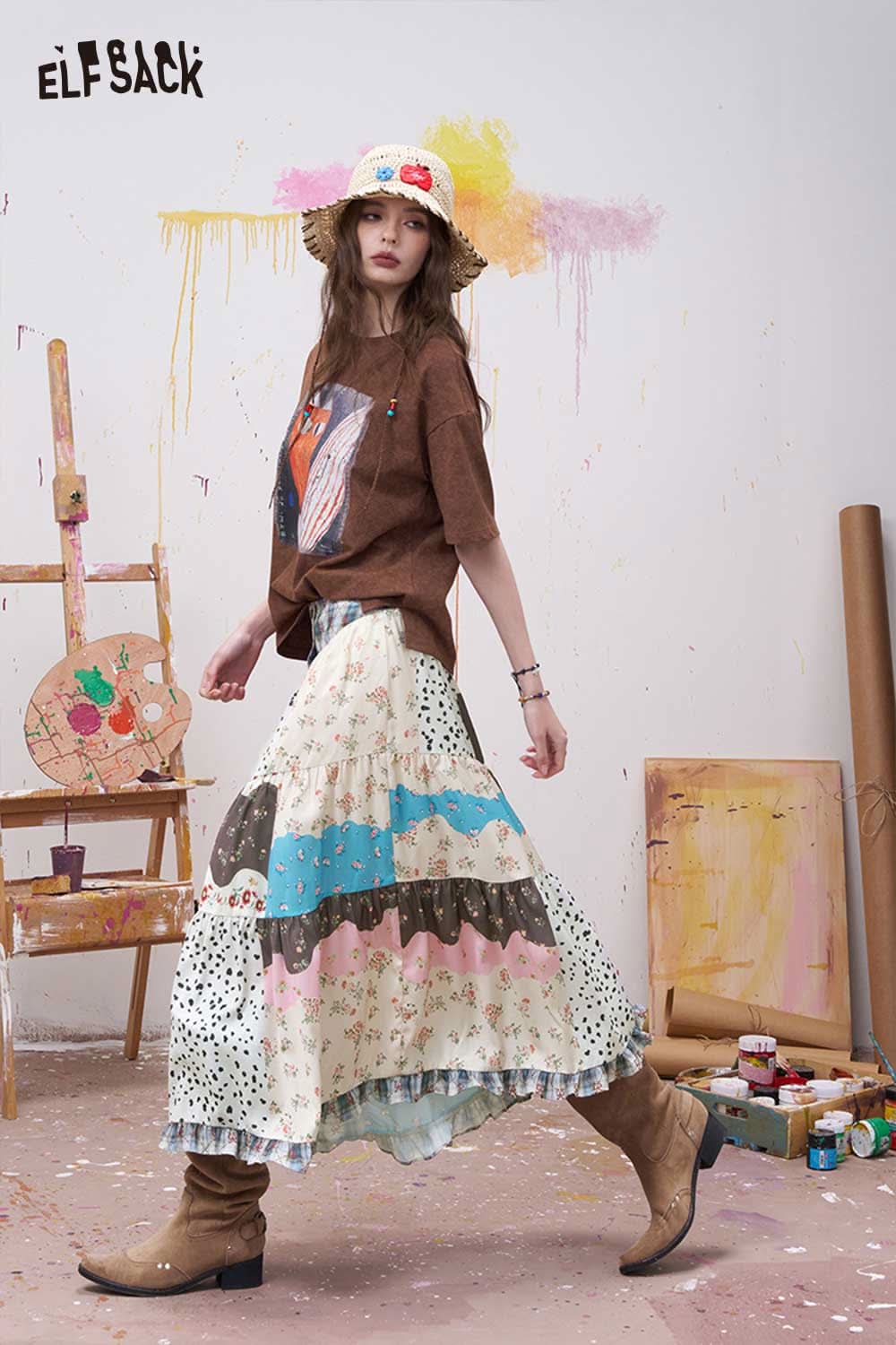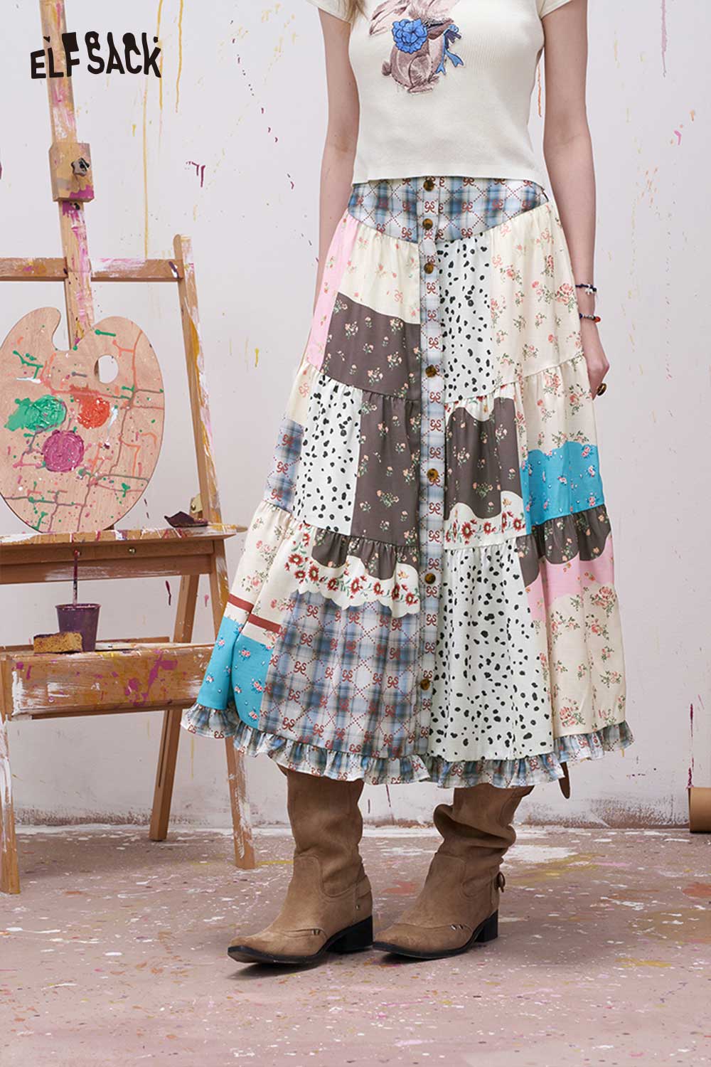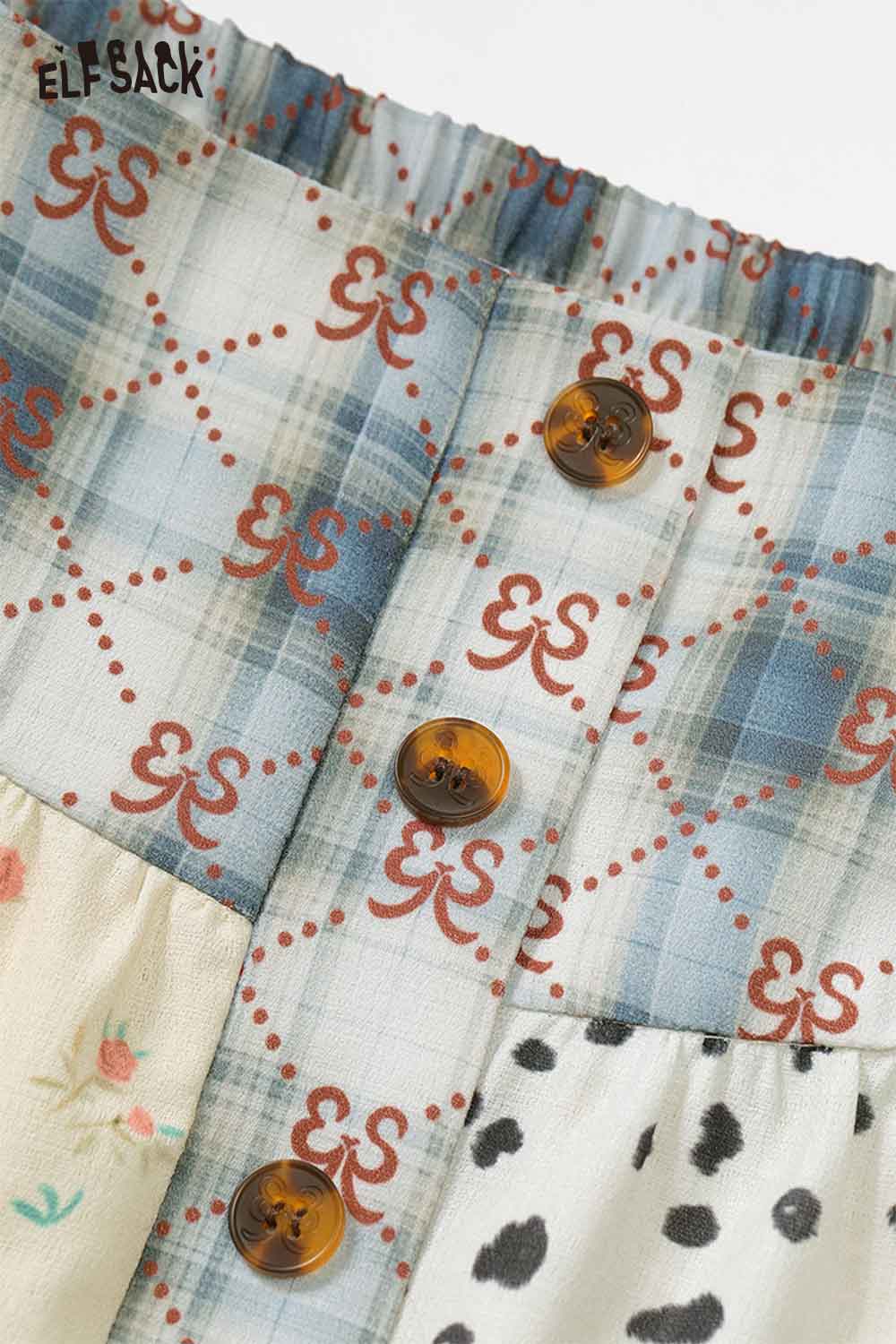 Patchwork Tiered Maxi Skirt with Buttons