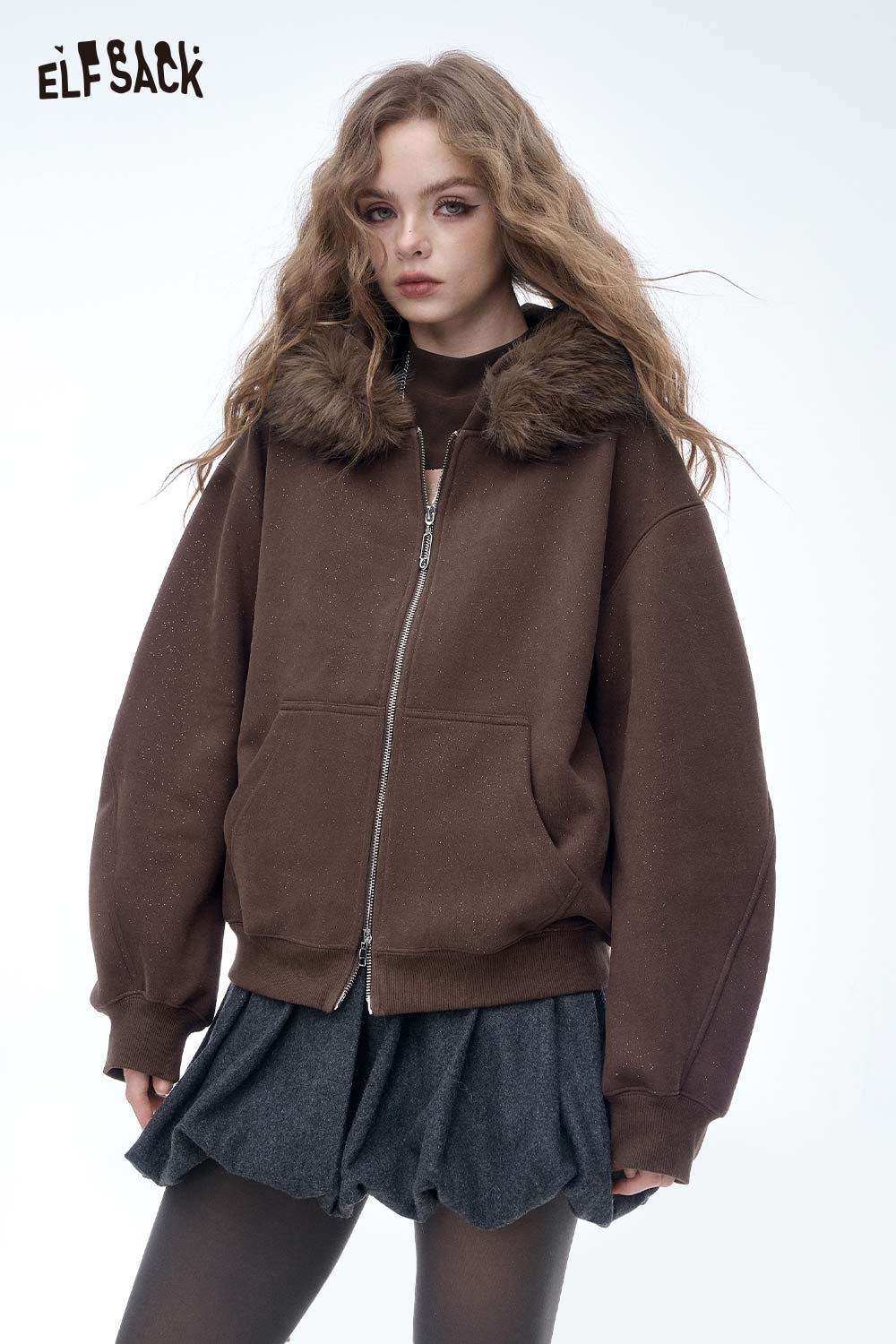 Soft Loose Double Zip Large Plush Hood Solid Sweatshirt