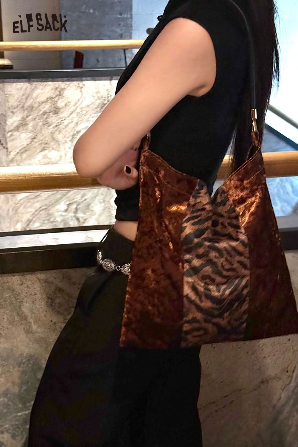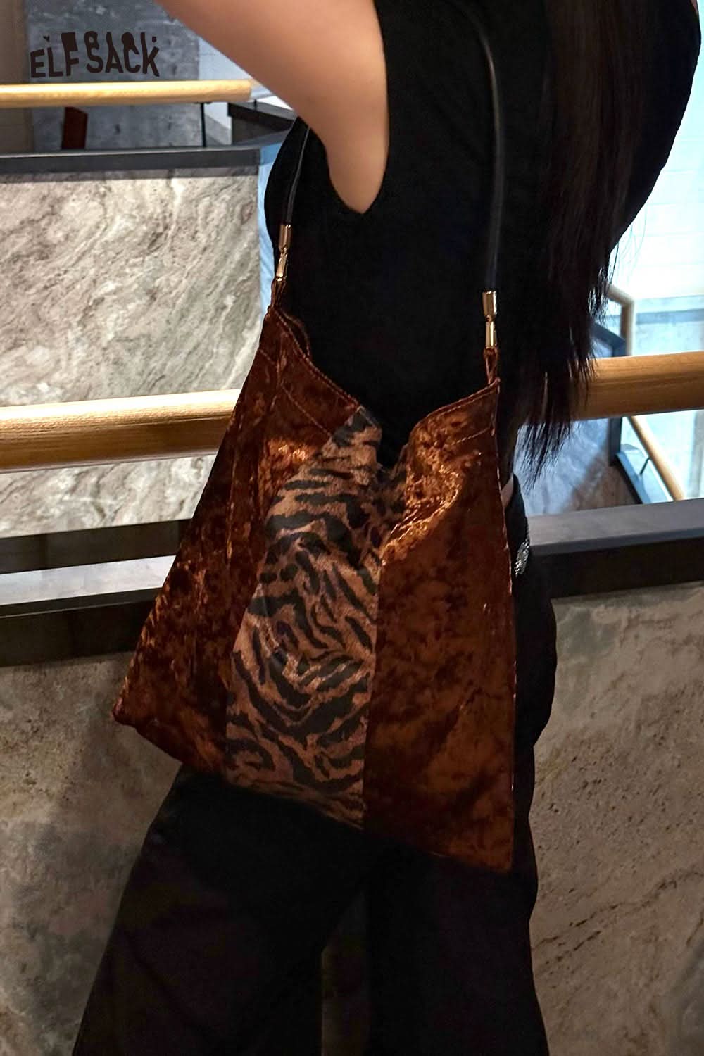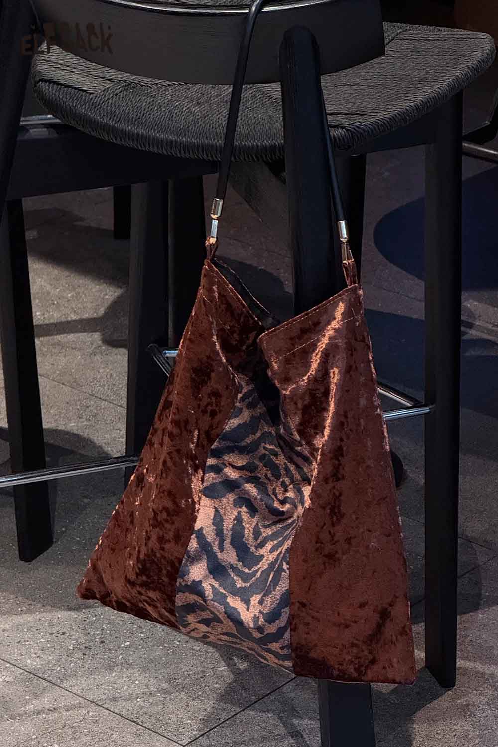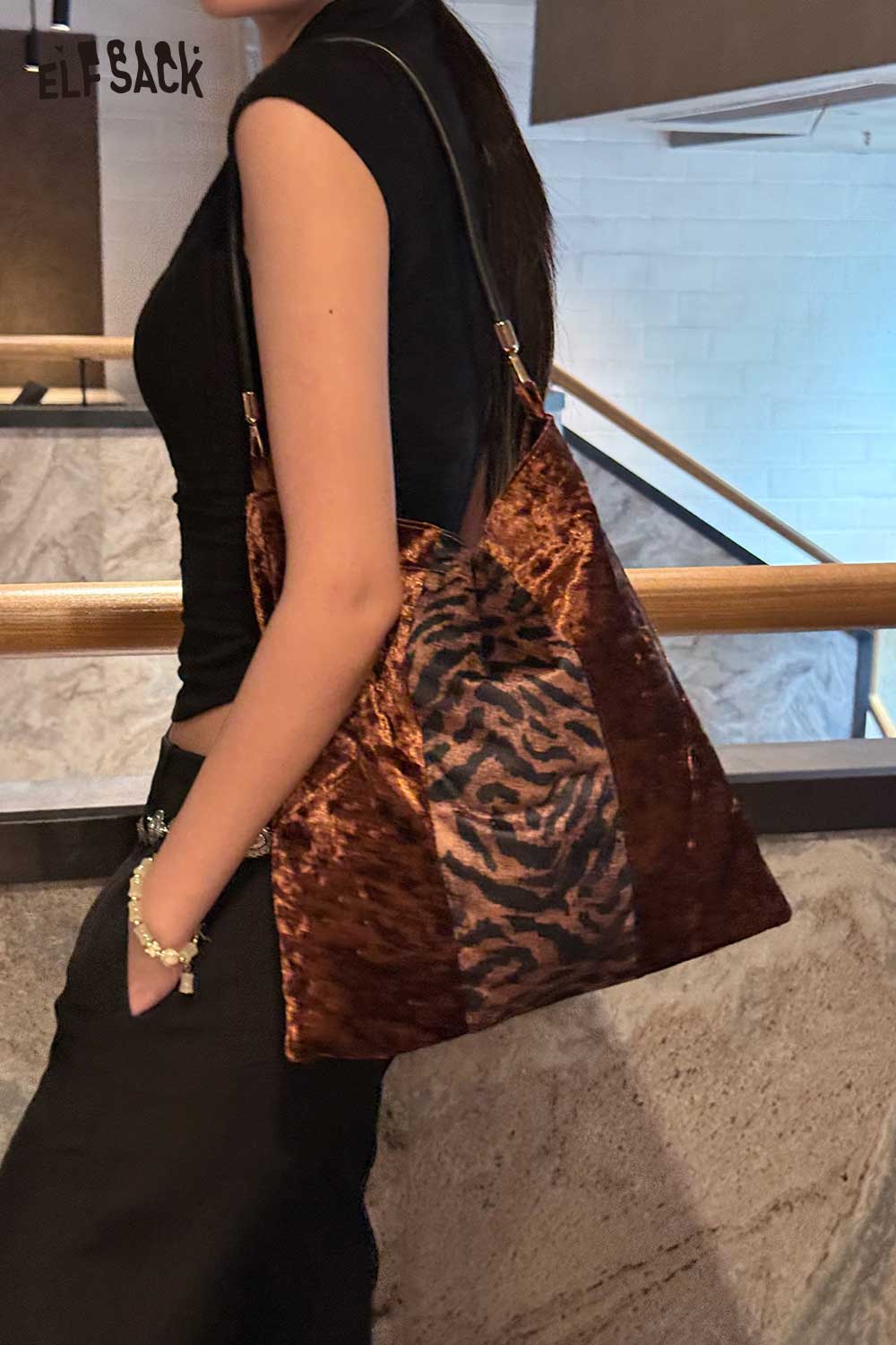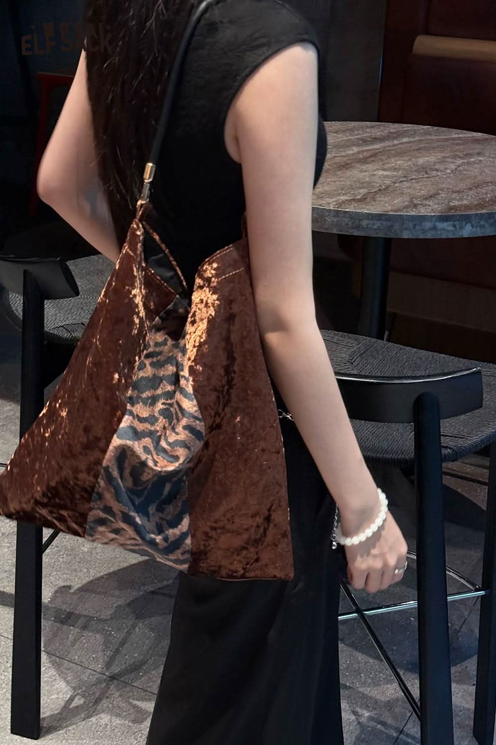 Faux Suede Leopard Print with Flock Detailing Contrast Panel Shoulder Bag