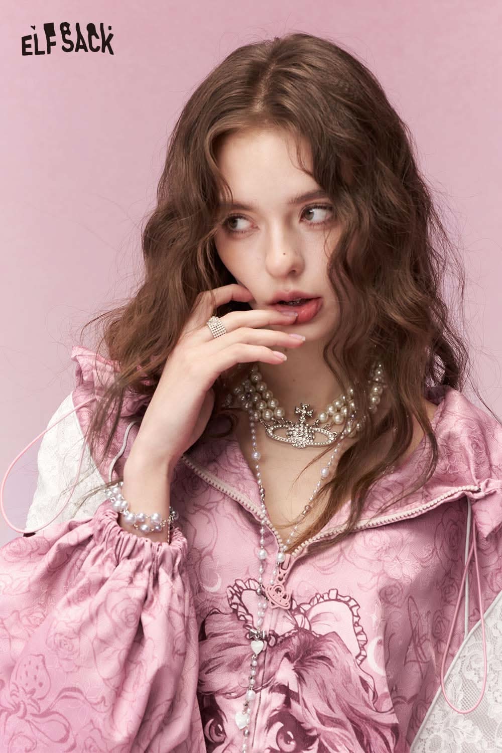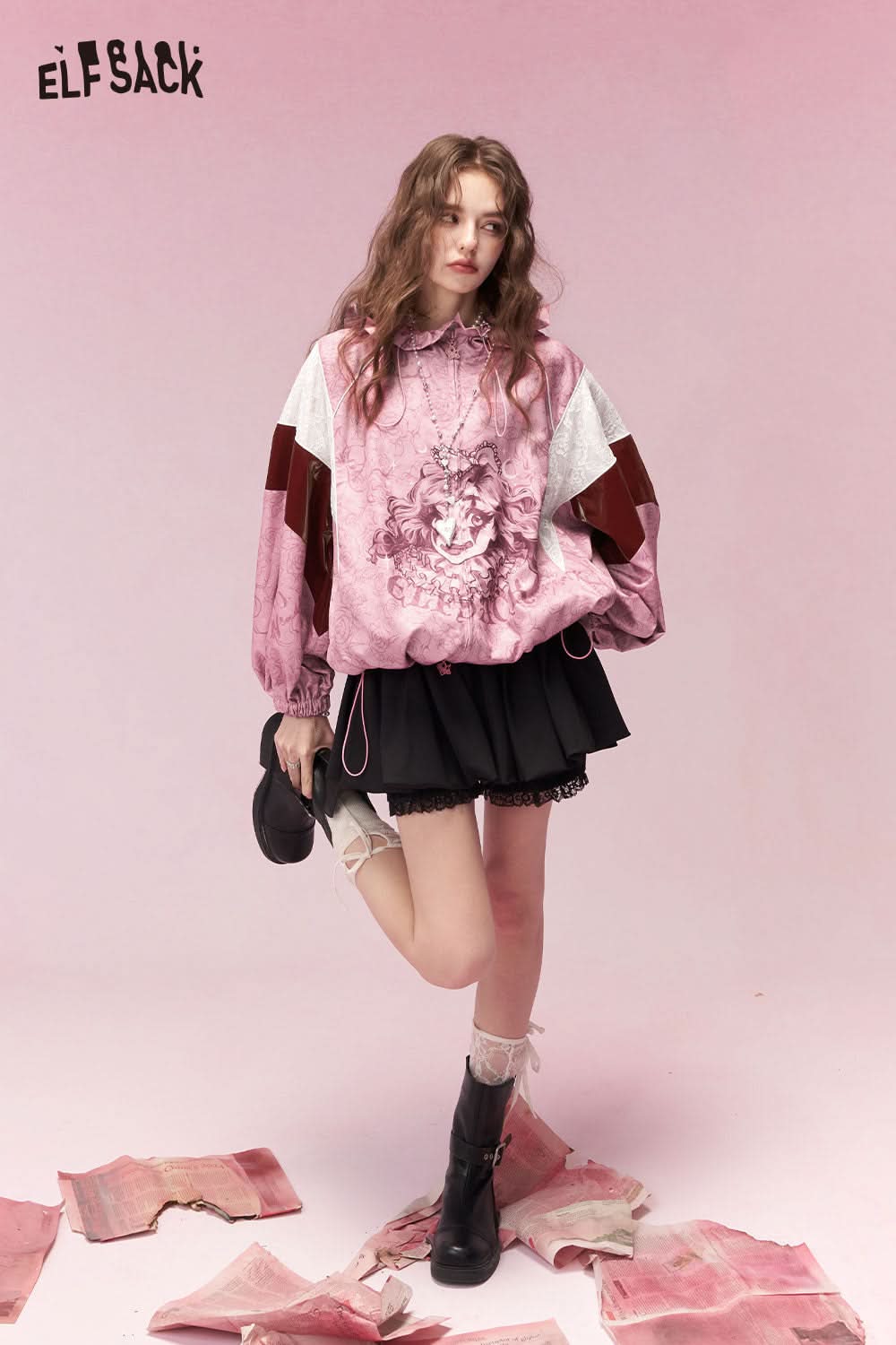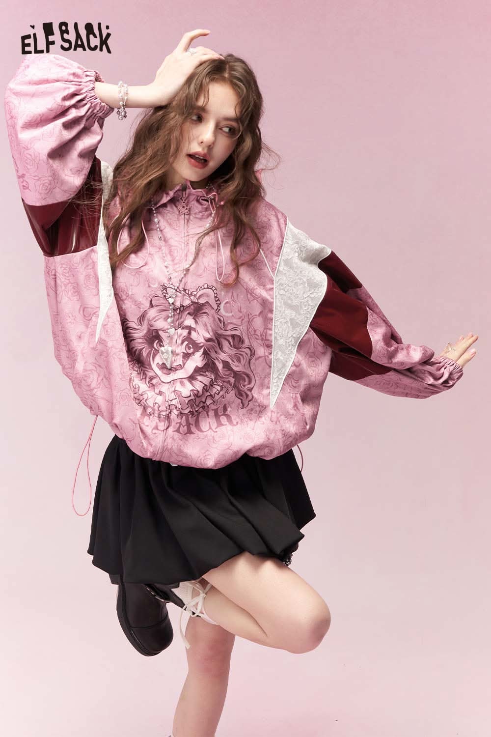 ELFSACK clown girl print hooded jacket in pink with unique lion design and stylish sleeves