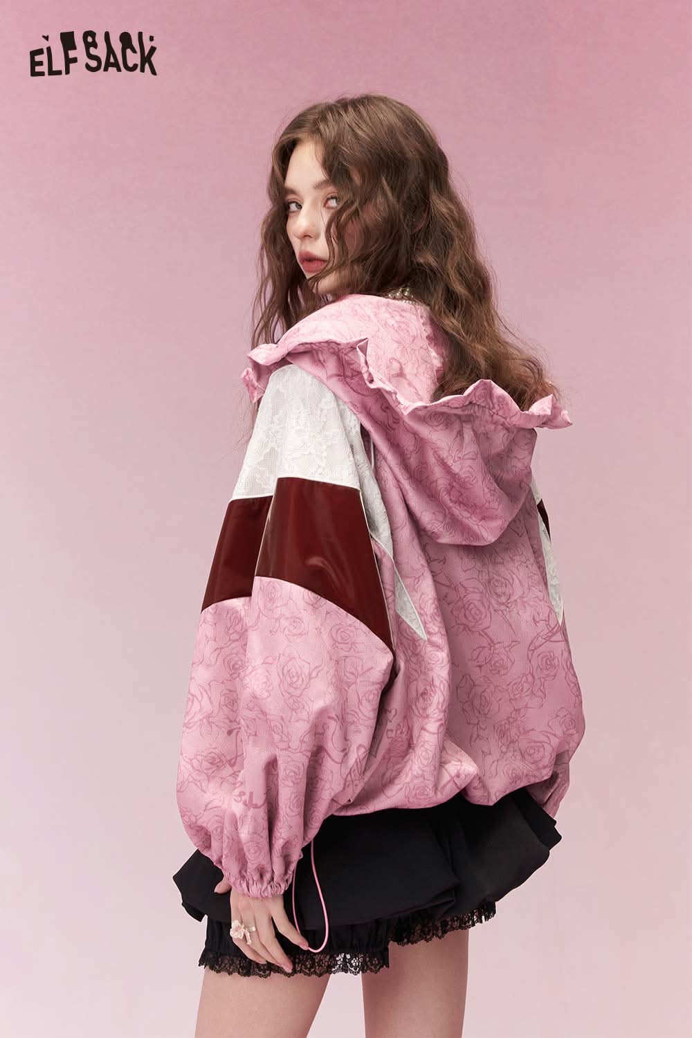 ELFSACK clown girl print hooded jacket in pink with floral details, paired with wide-leg gray pants