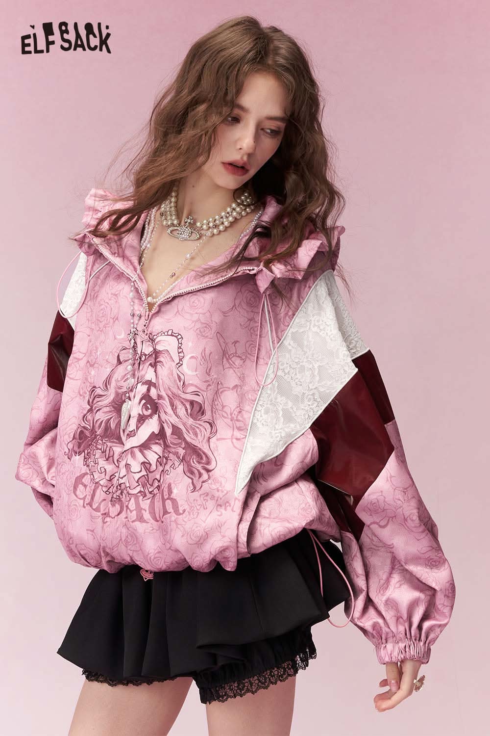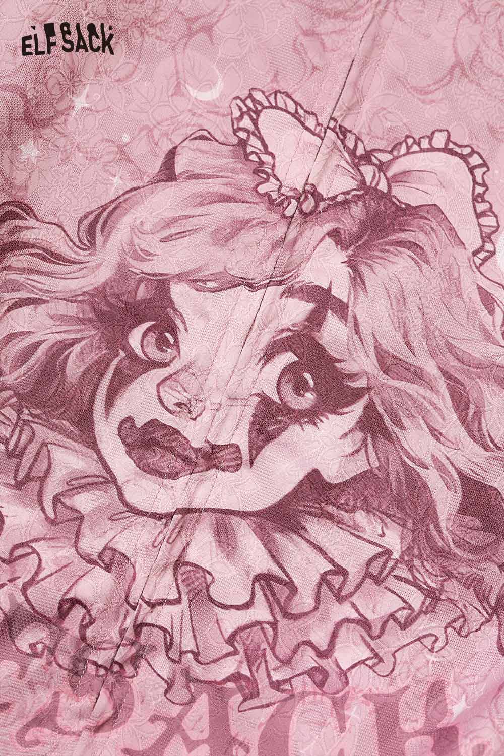 ELFSACK clown girl print hooded jacket in pink with artistic design for trendy women's fashion