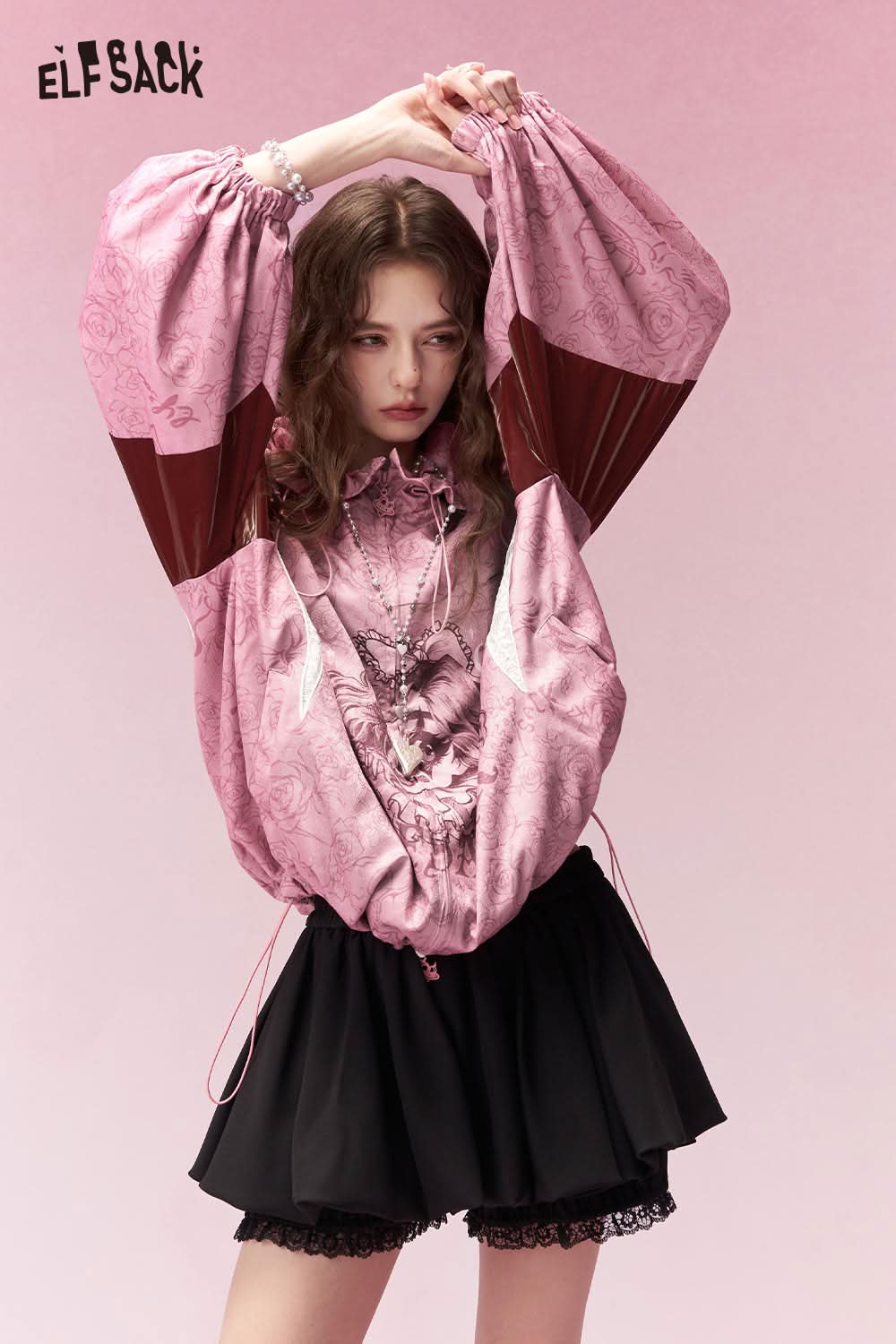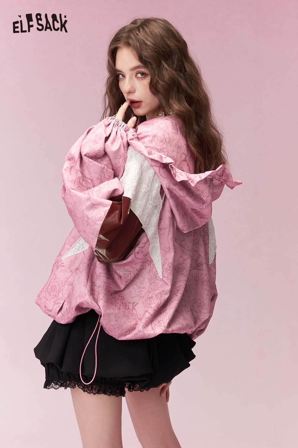 ELFSACK clown girl print hooded jacket in pink with unique balloon sleeves and stylish design