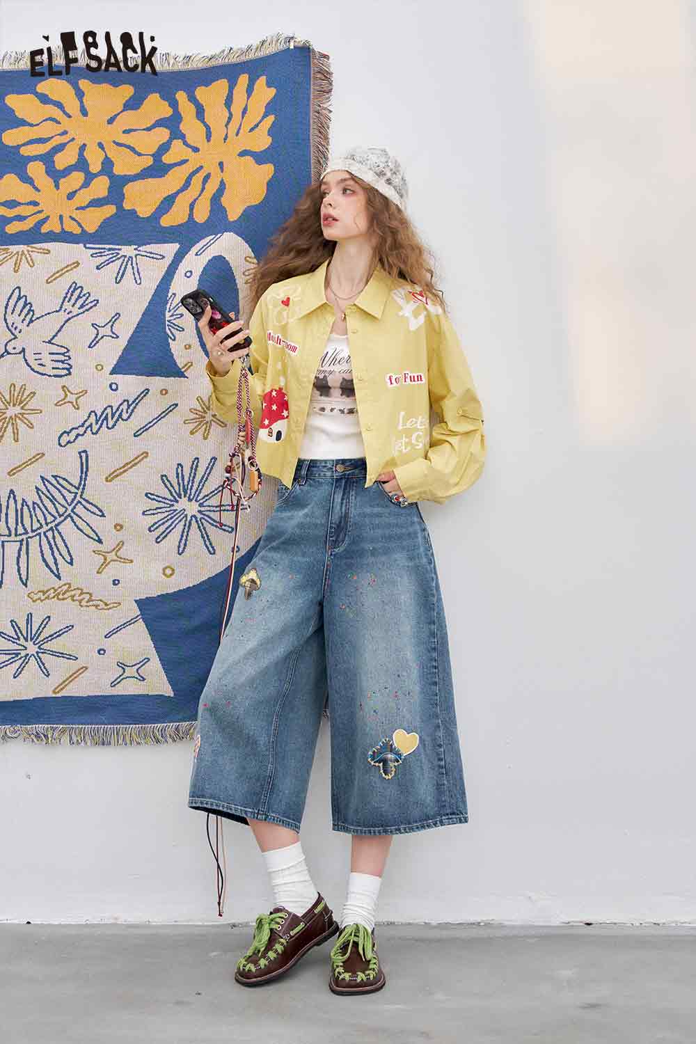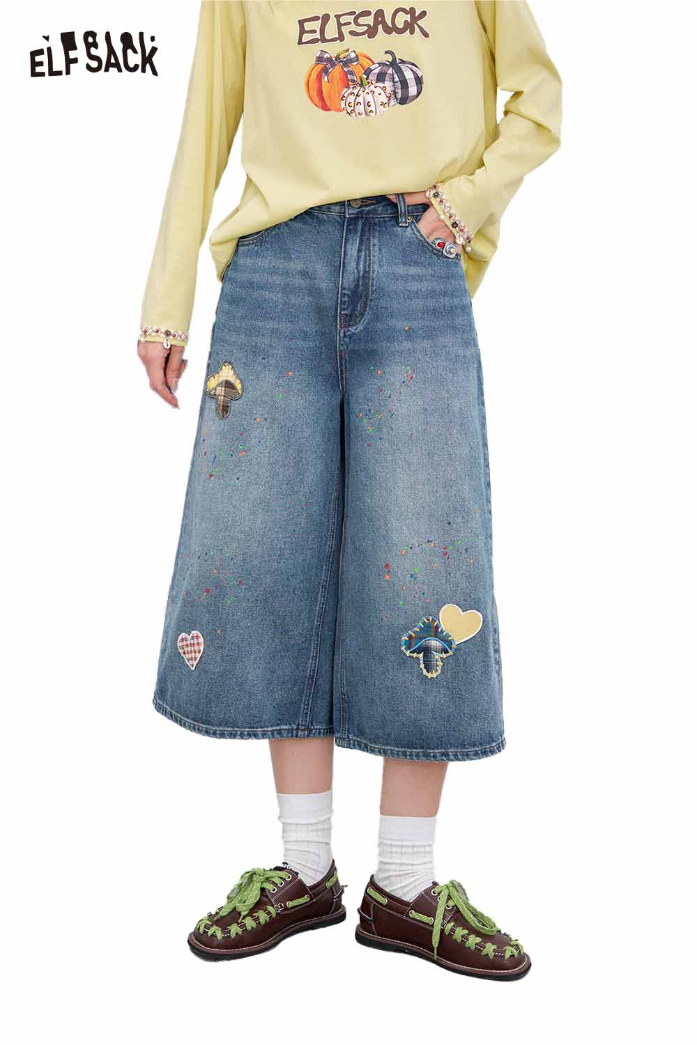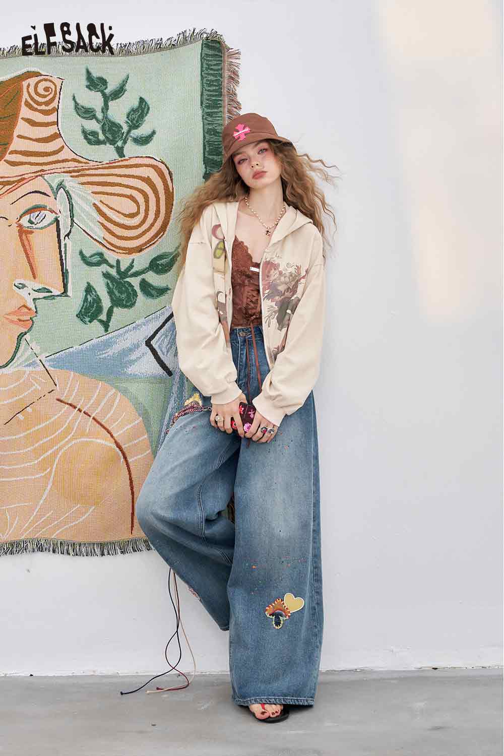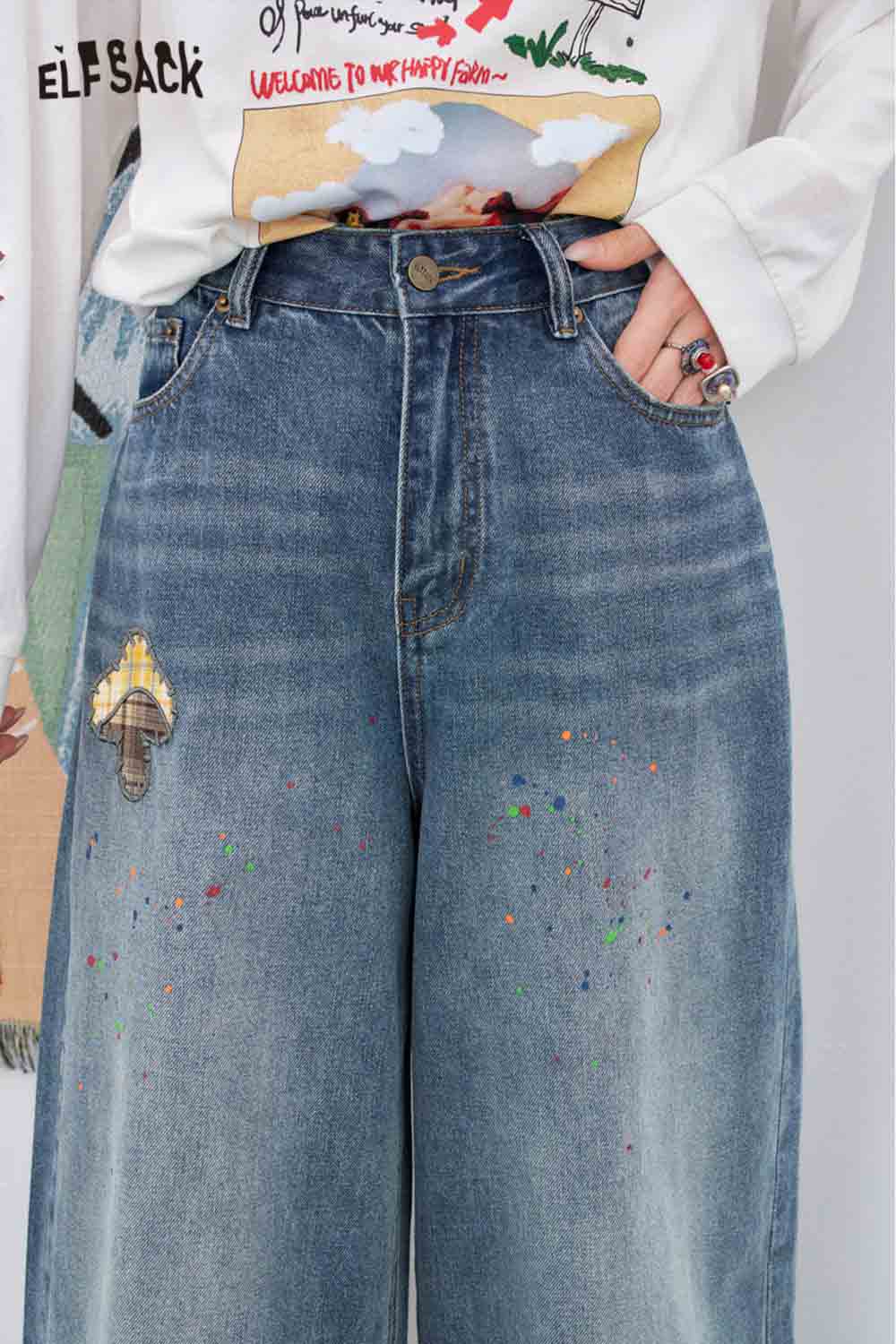 Cotton Vintage Mushroom Print High Waist Wide Leg Jeans Loose Fit Cropped Pants