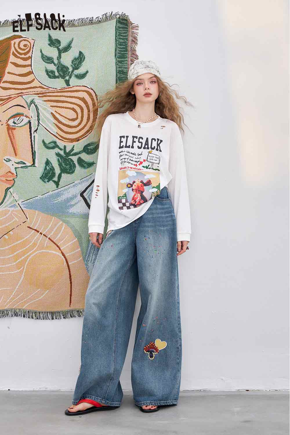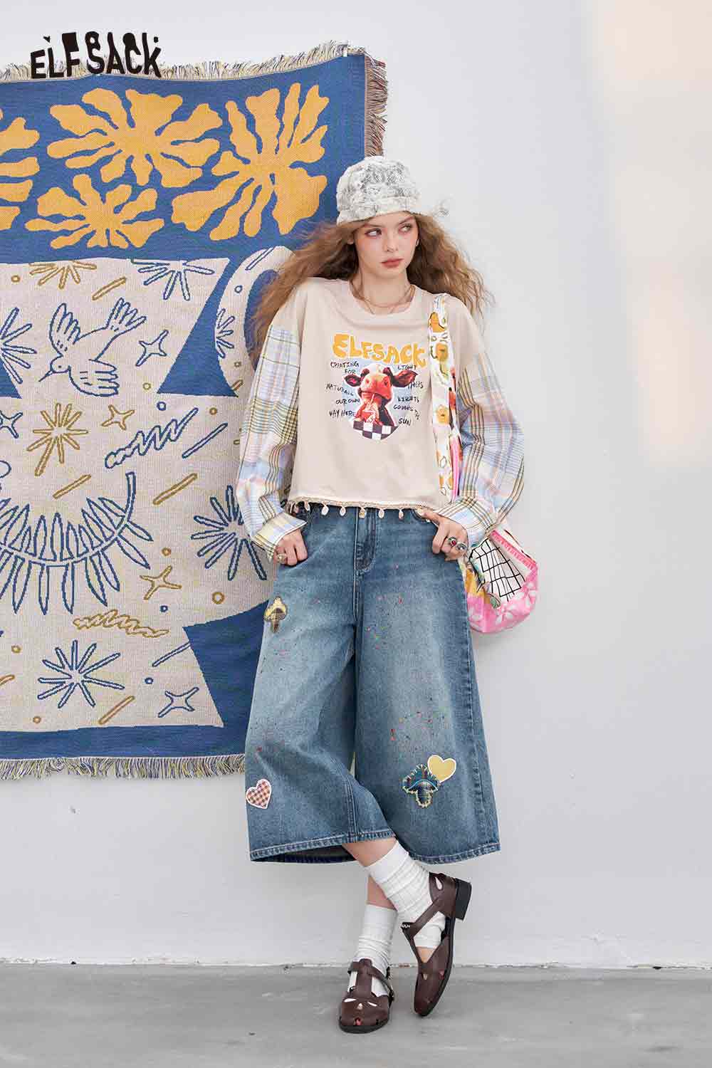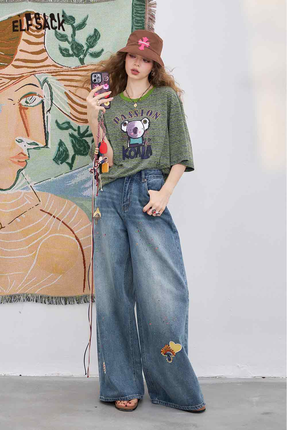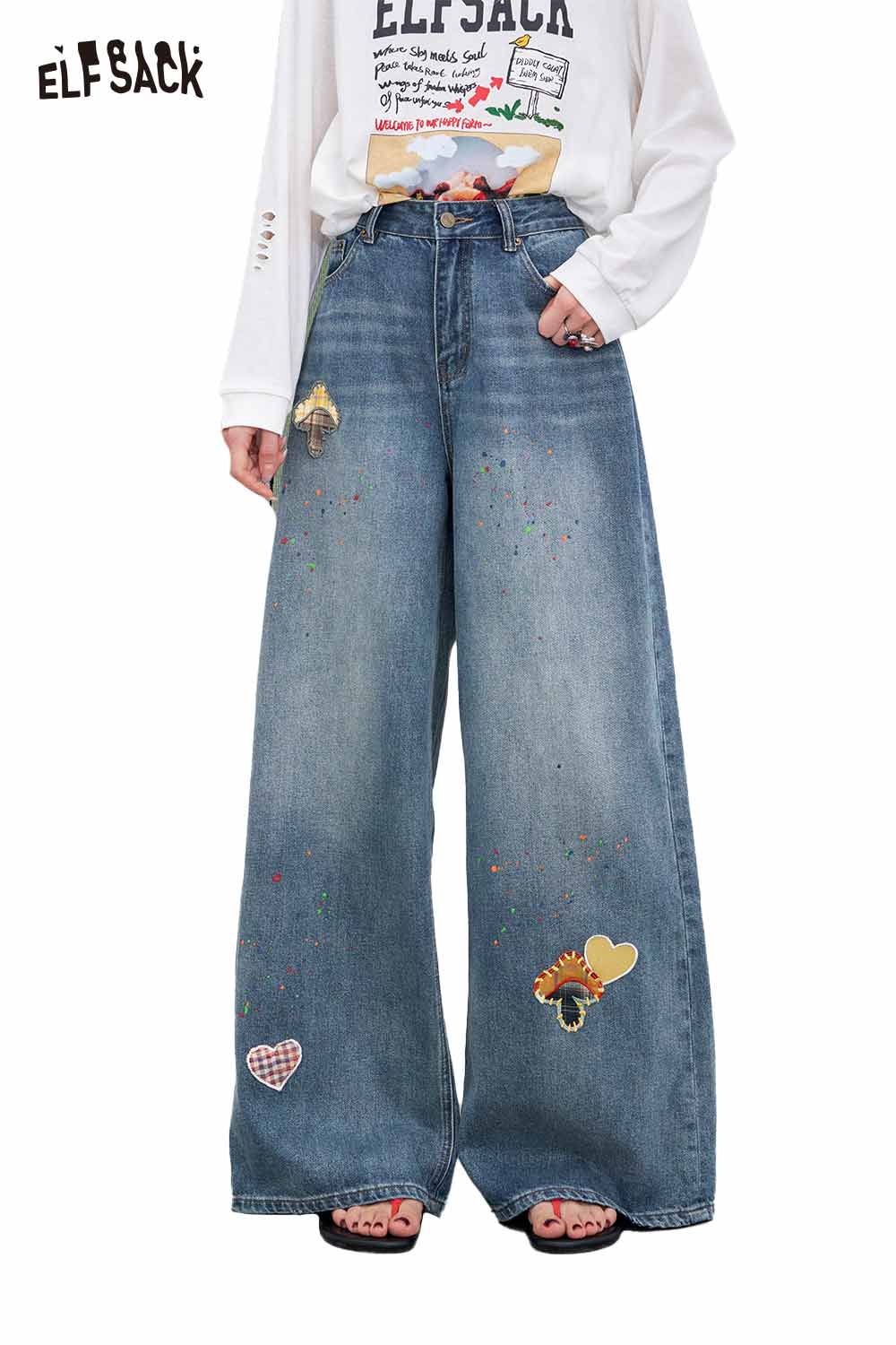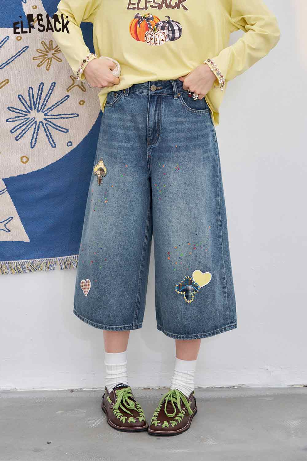 Cotton Vintage Mushroom Print High Waist Wide Leg Jeans Loose Fit Cropped Pants