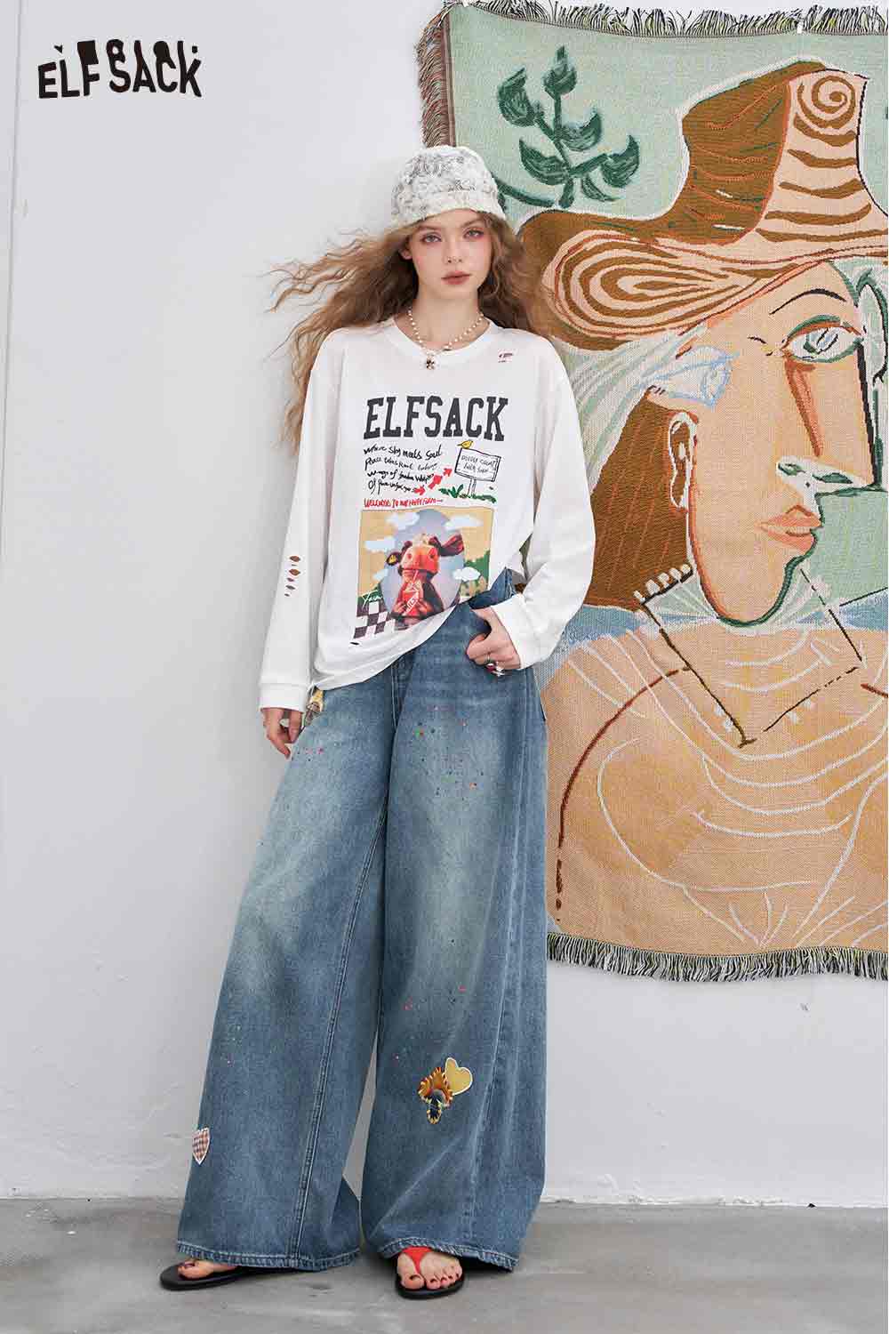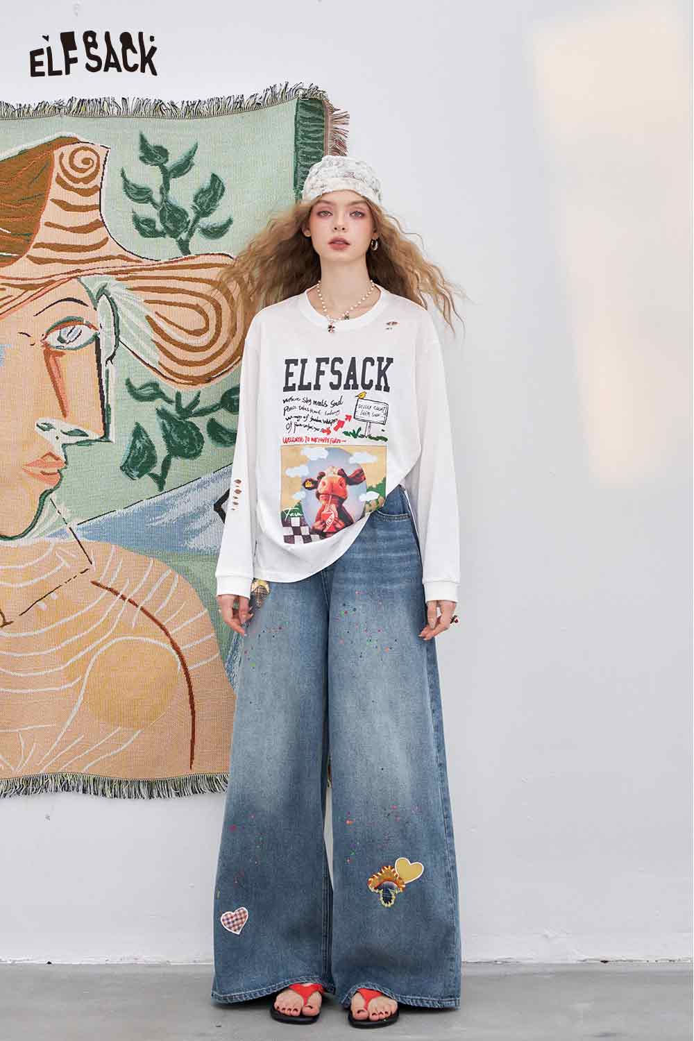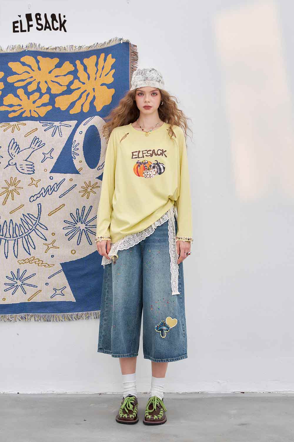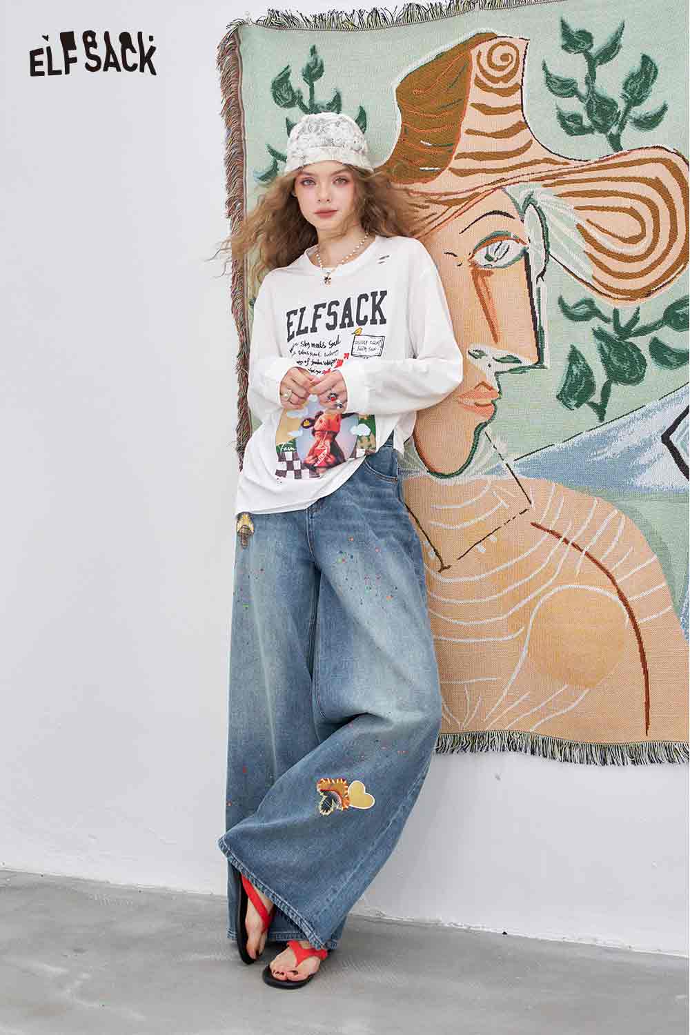Cotton Vintage Mushroom Print High Waist Wide Leg Jeans Loose Fit Cropped Pants