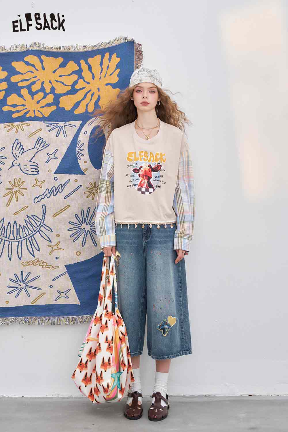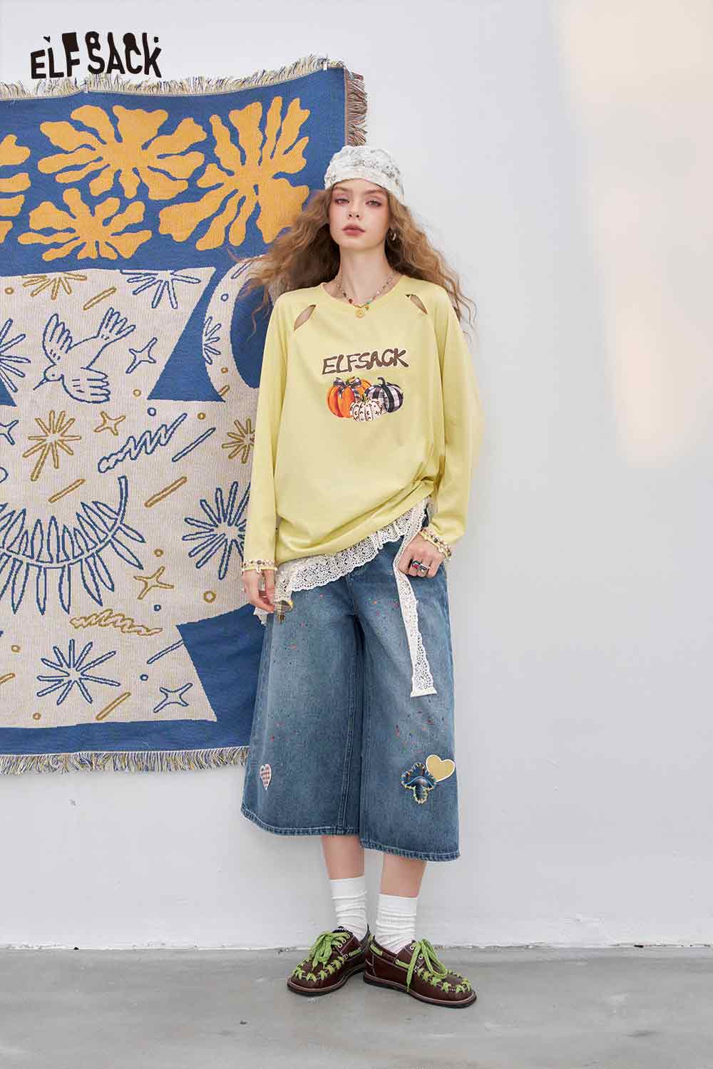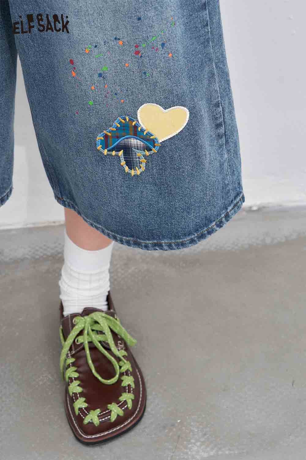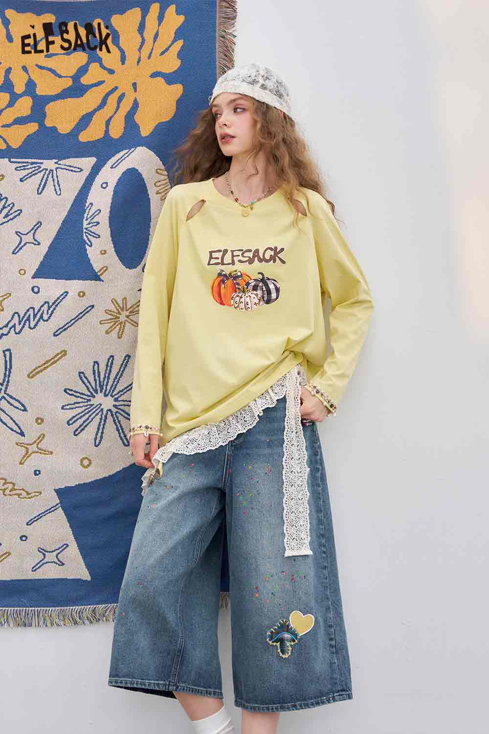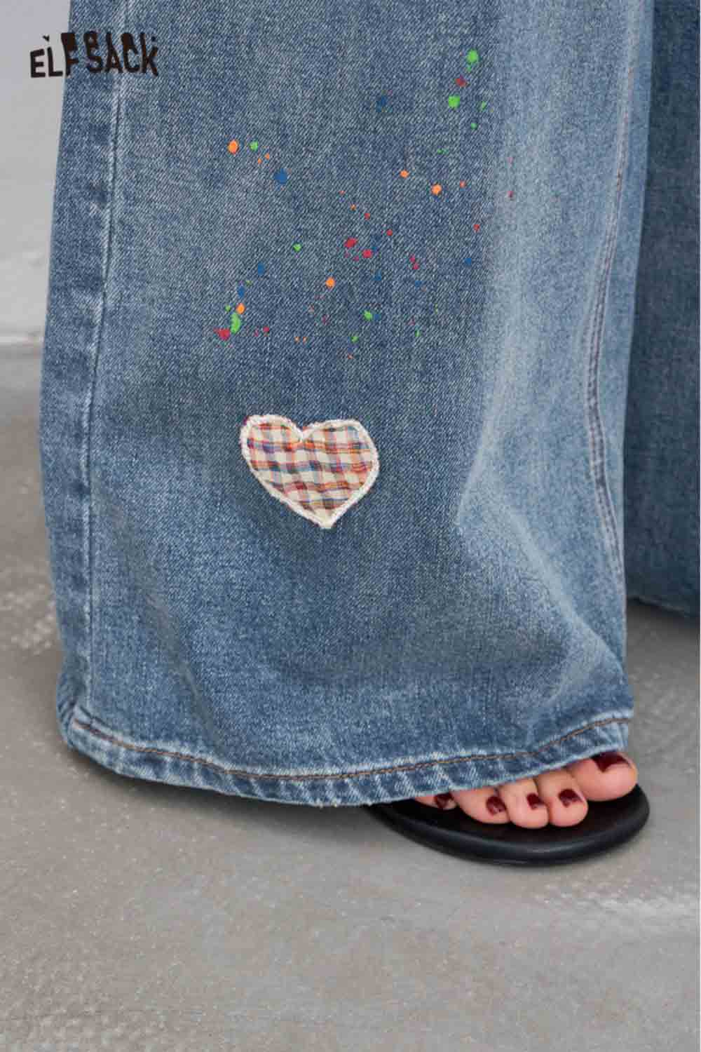 Cotton Vintage Mushroom Print High Waist Wide Leg Jeans Loose Fit Cropped Pants