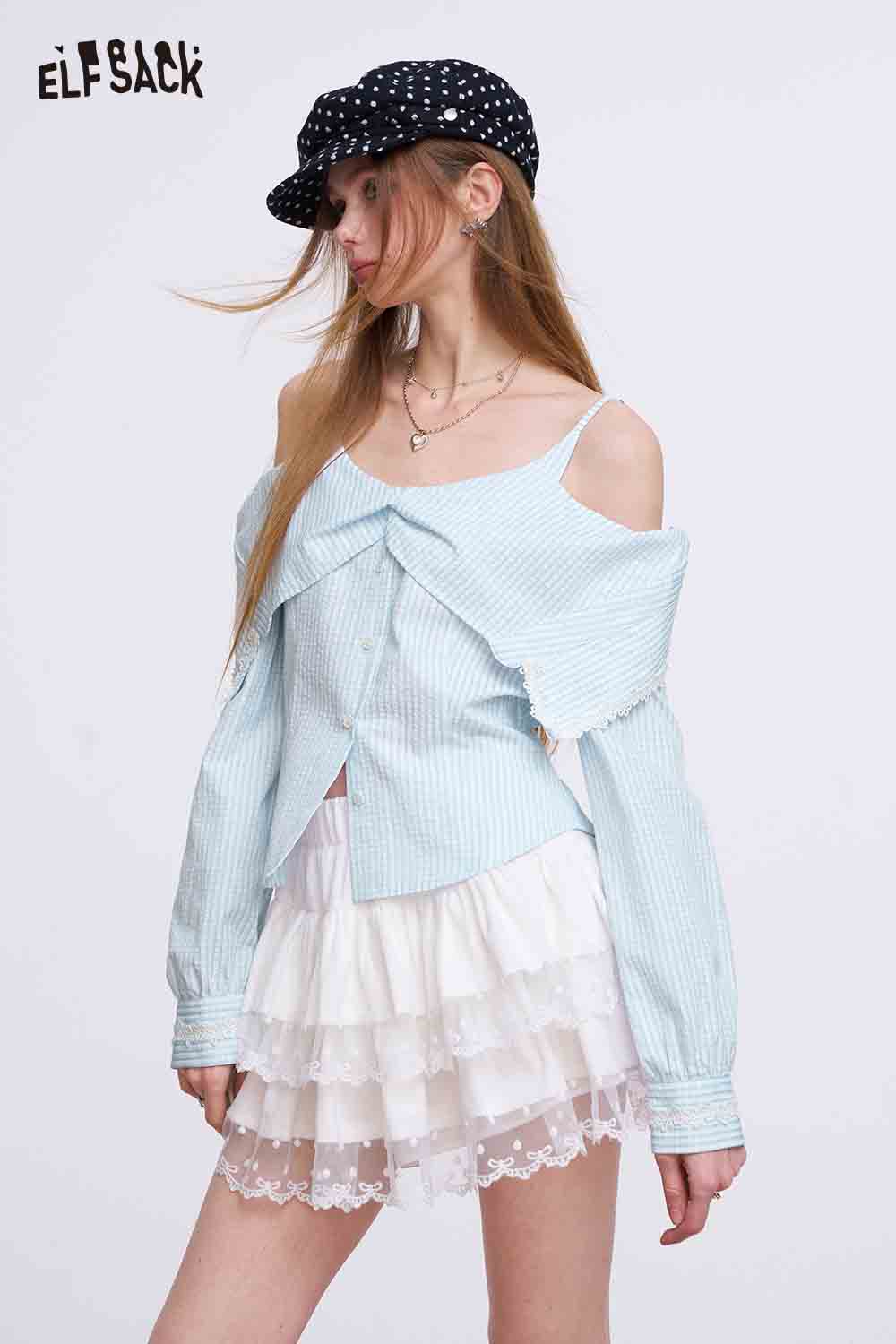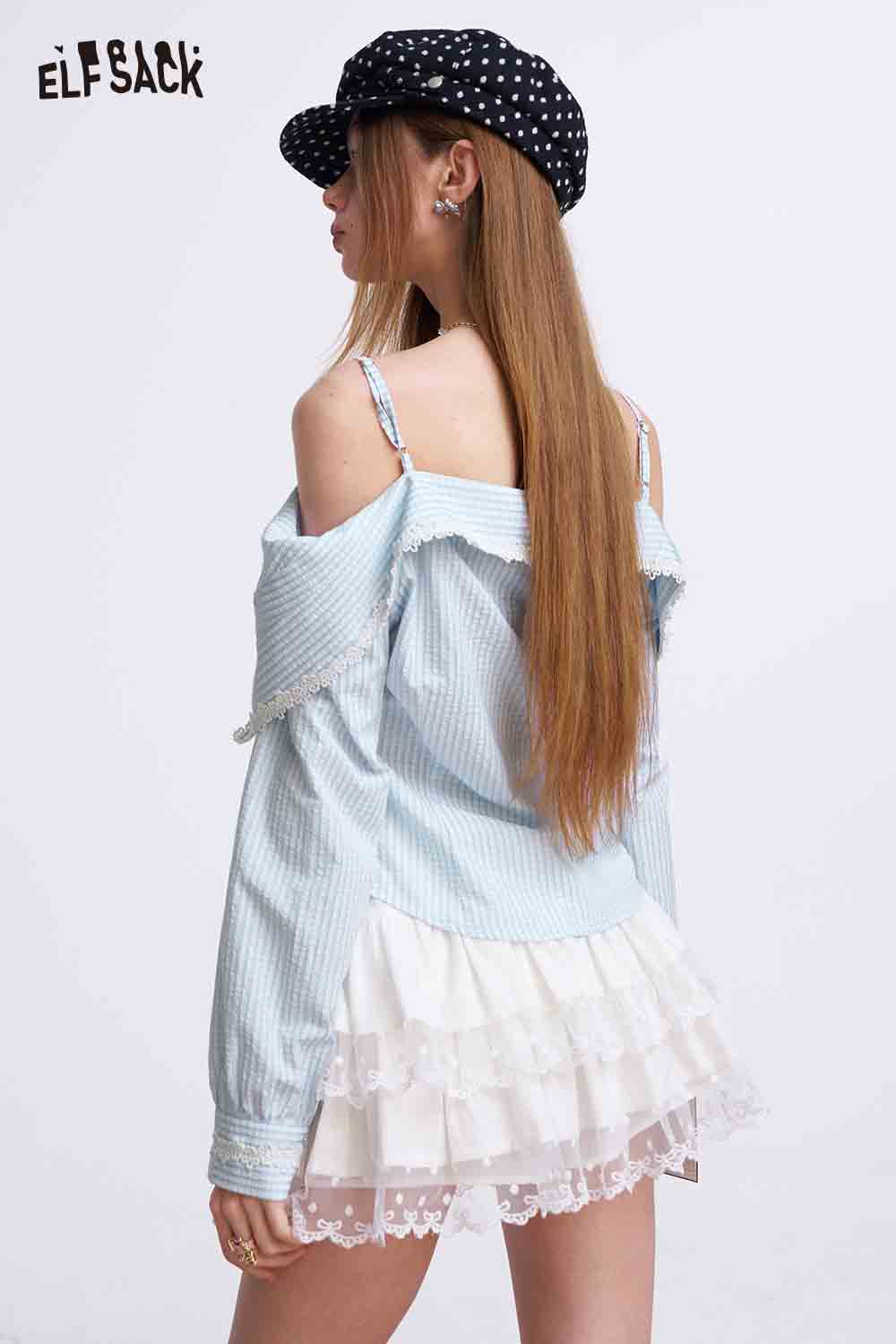 Gingham Cold Shoulder Lace Trim Blouse