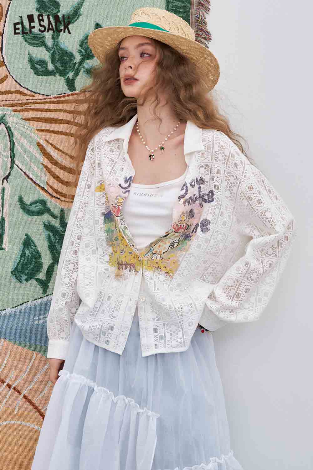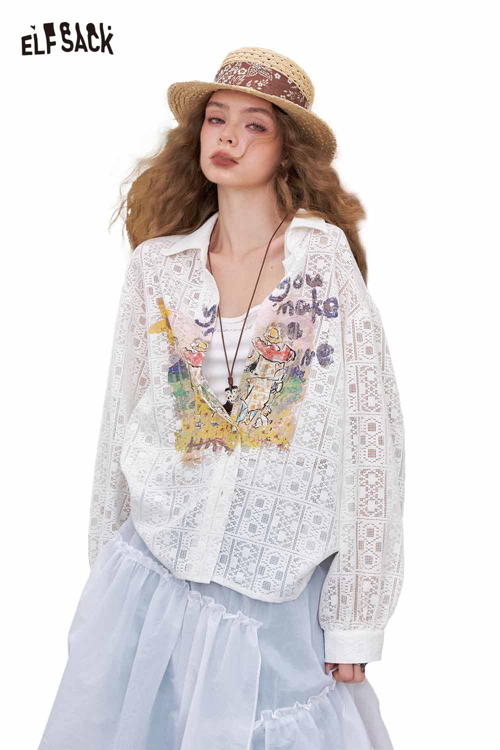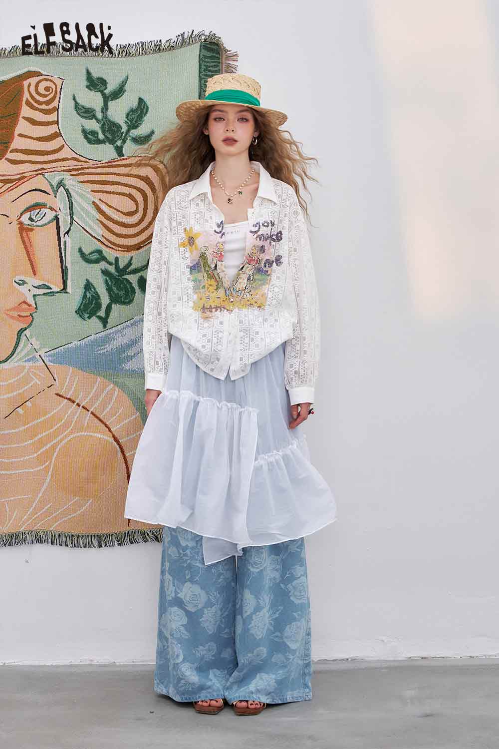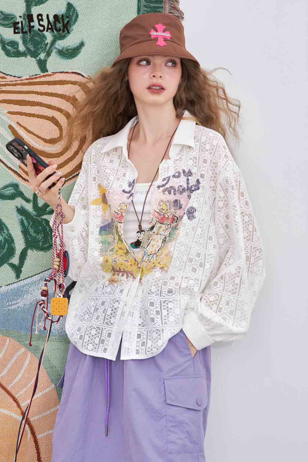 Light Loose Printed Openwork Long-Sleeved Shirt