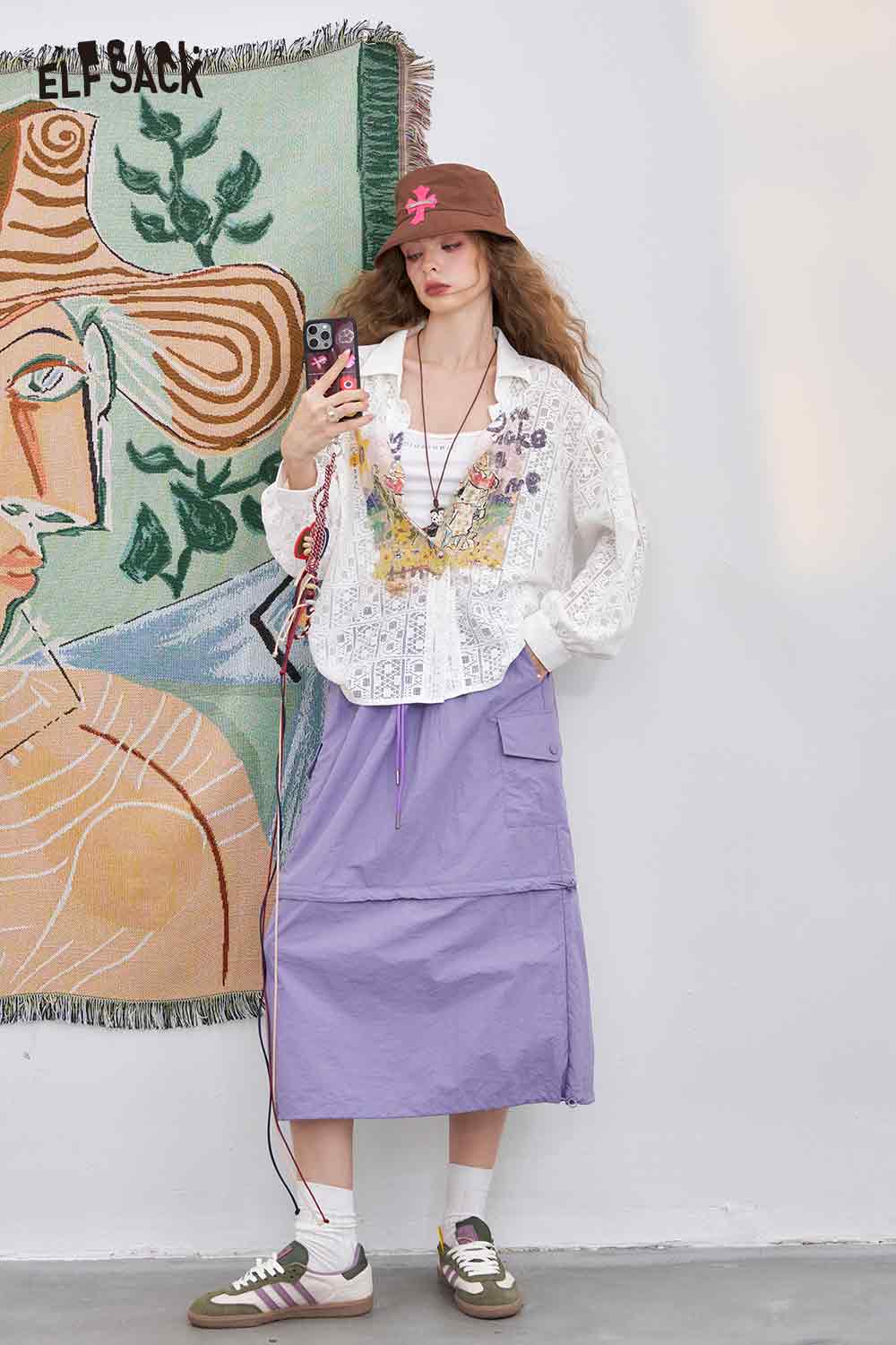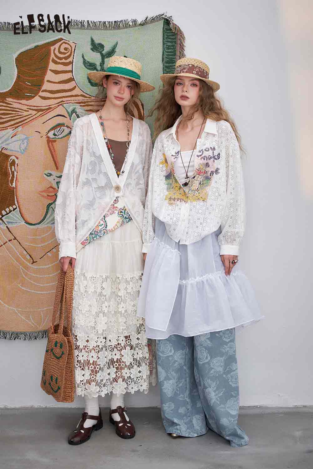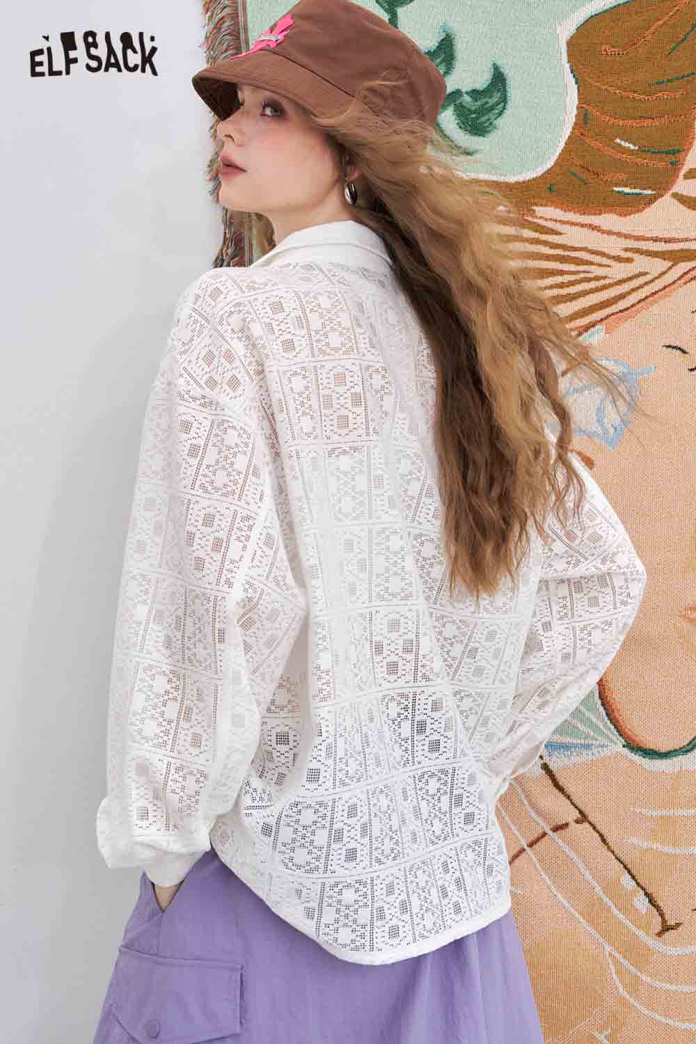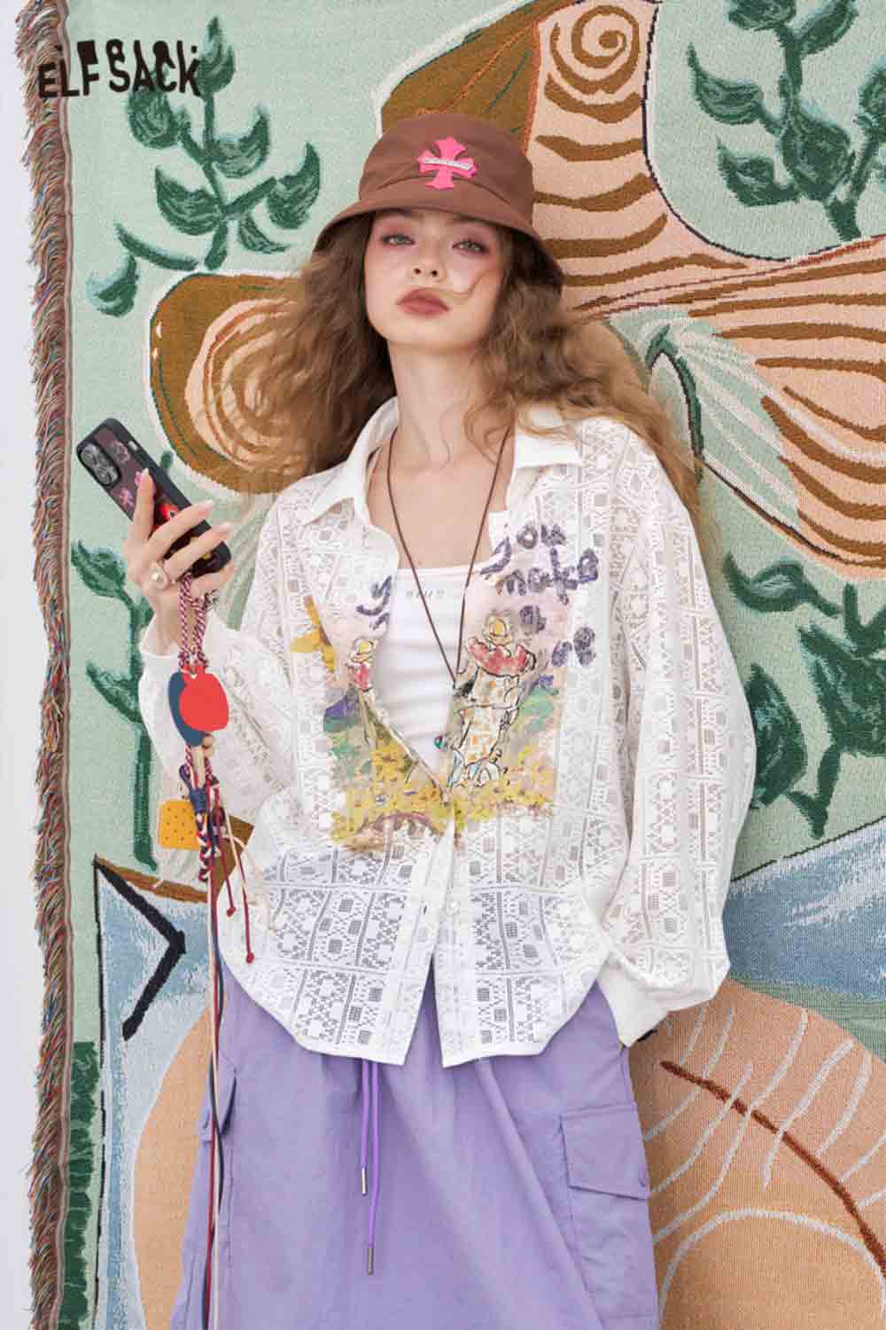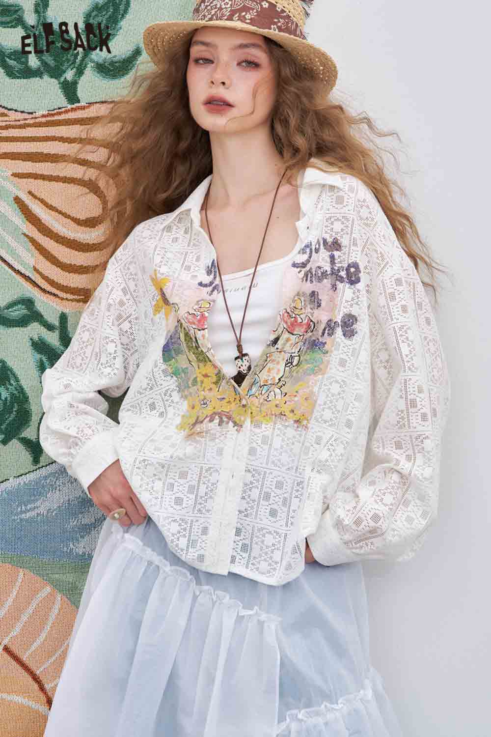 Light Loose Printed Openwork Long-Sleeved Shirt