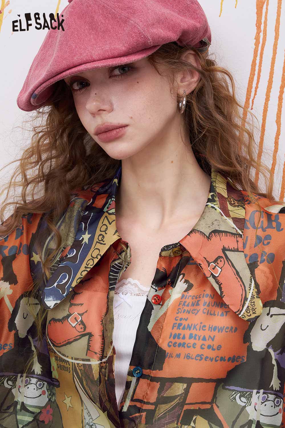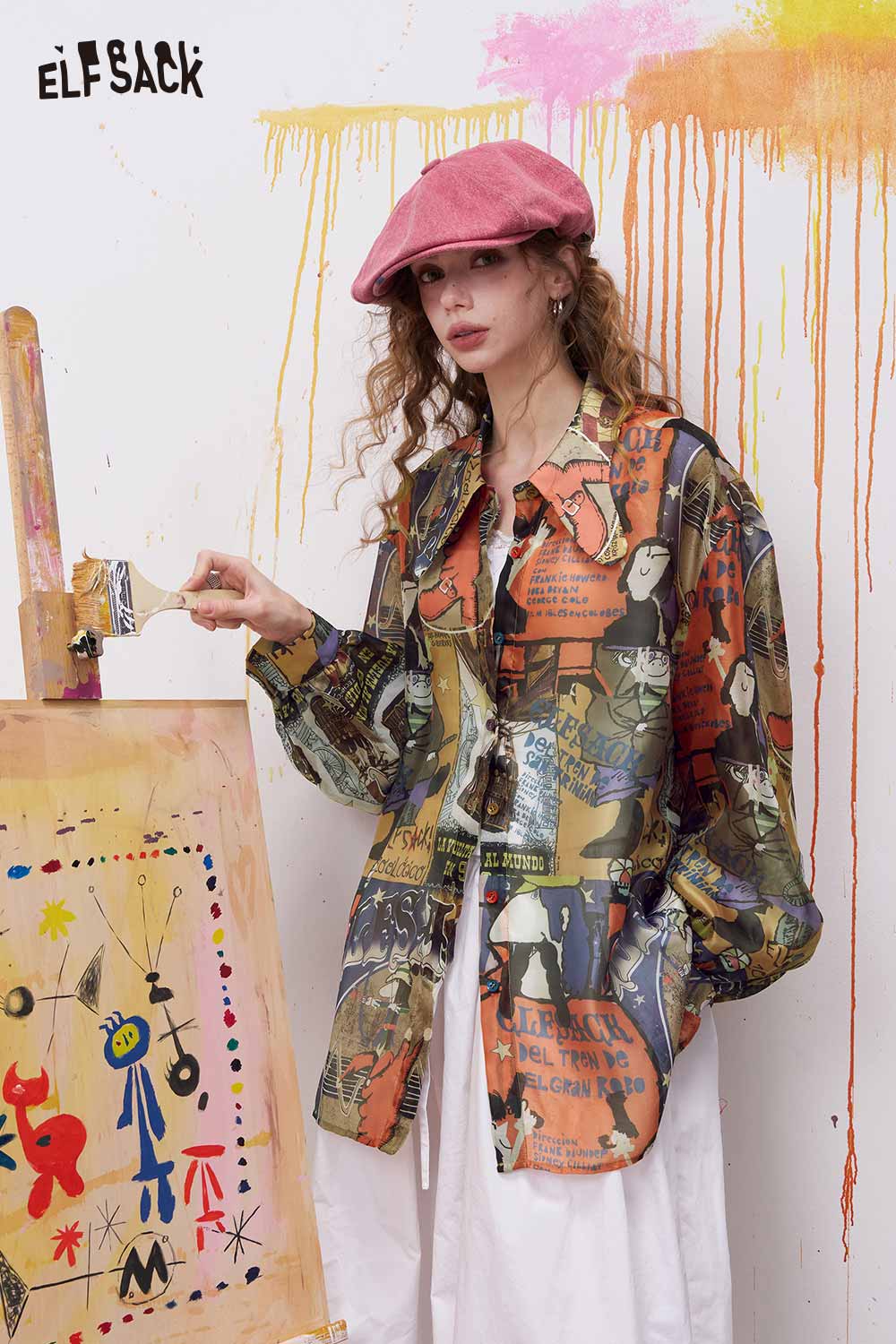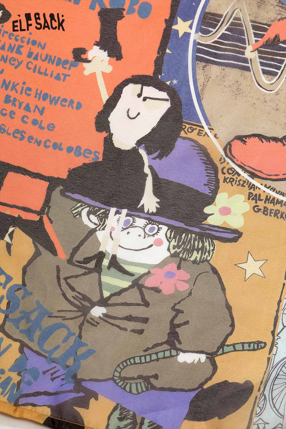 Oversized Novelty Print Shirt with Bow Tie Collar