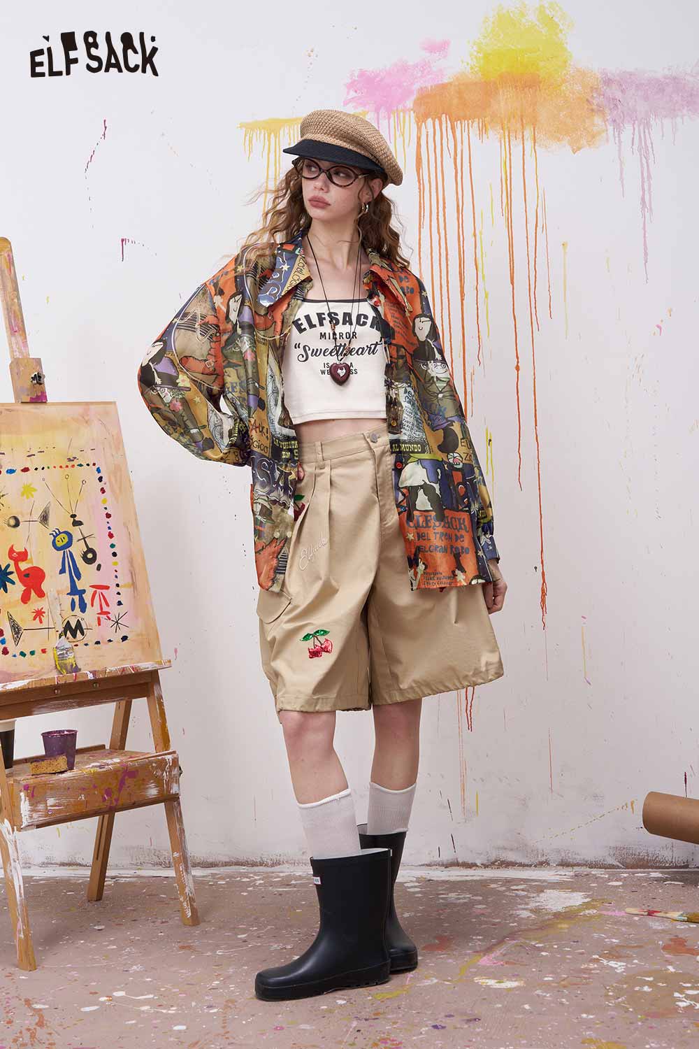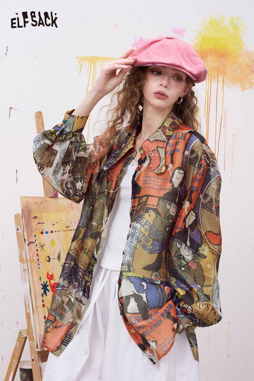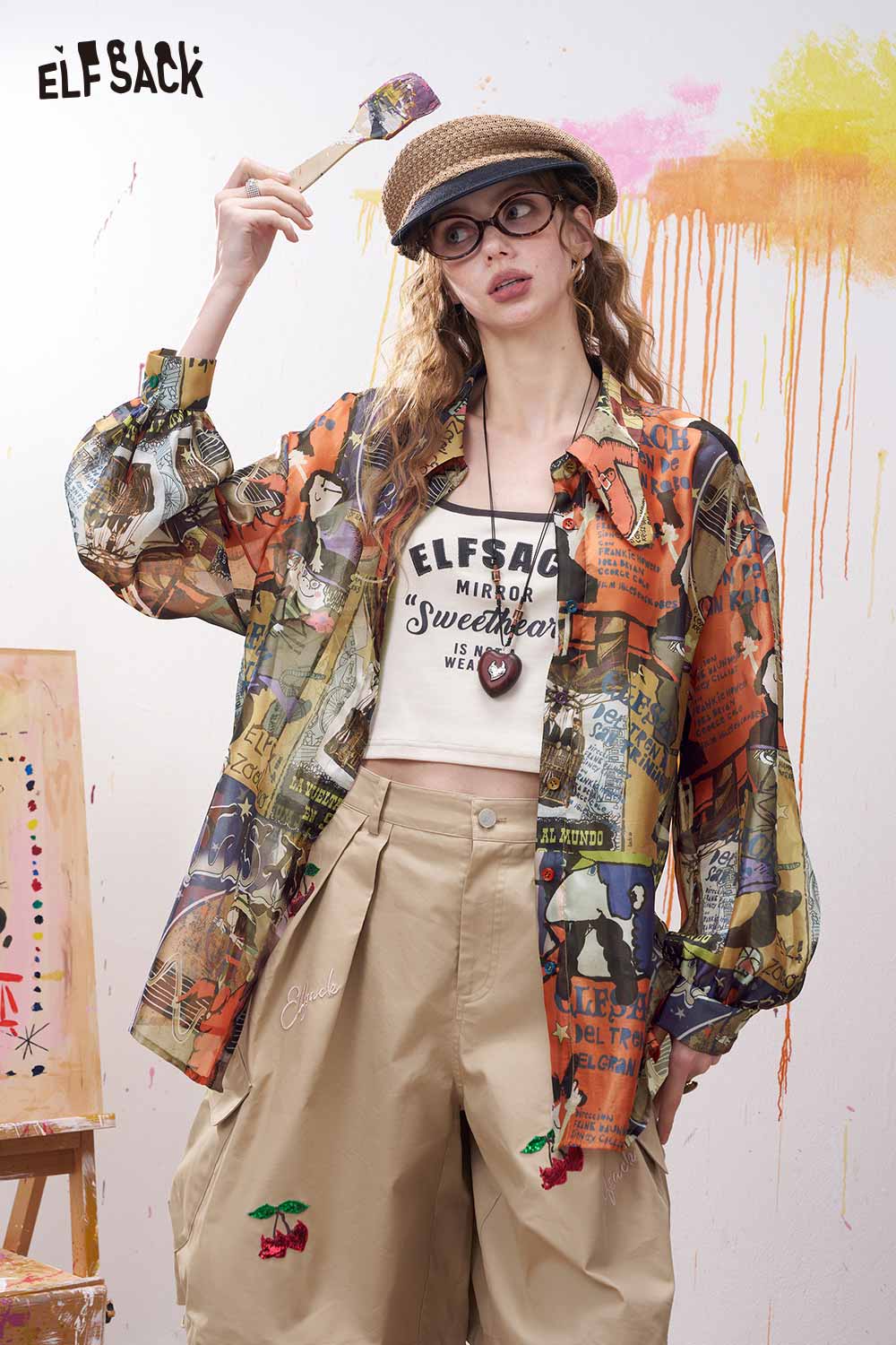 Oversized Novelty Print Shirt with Bow Tie Collar