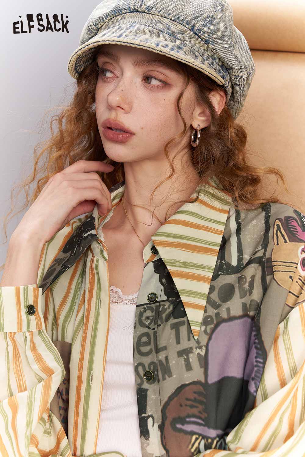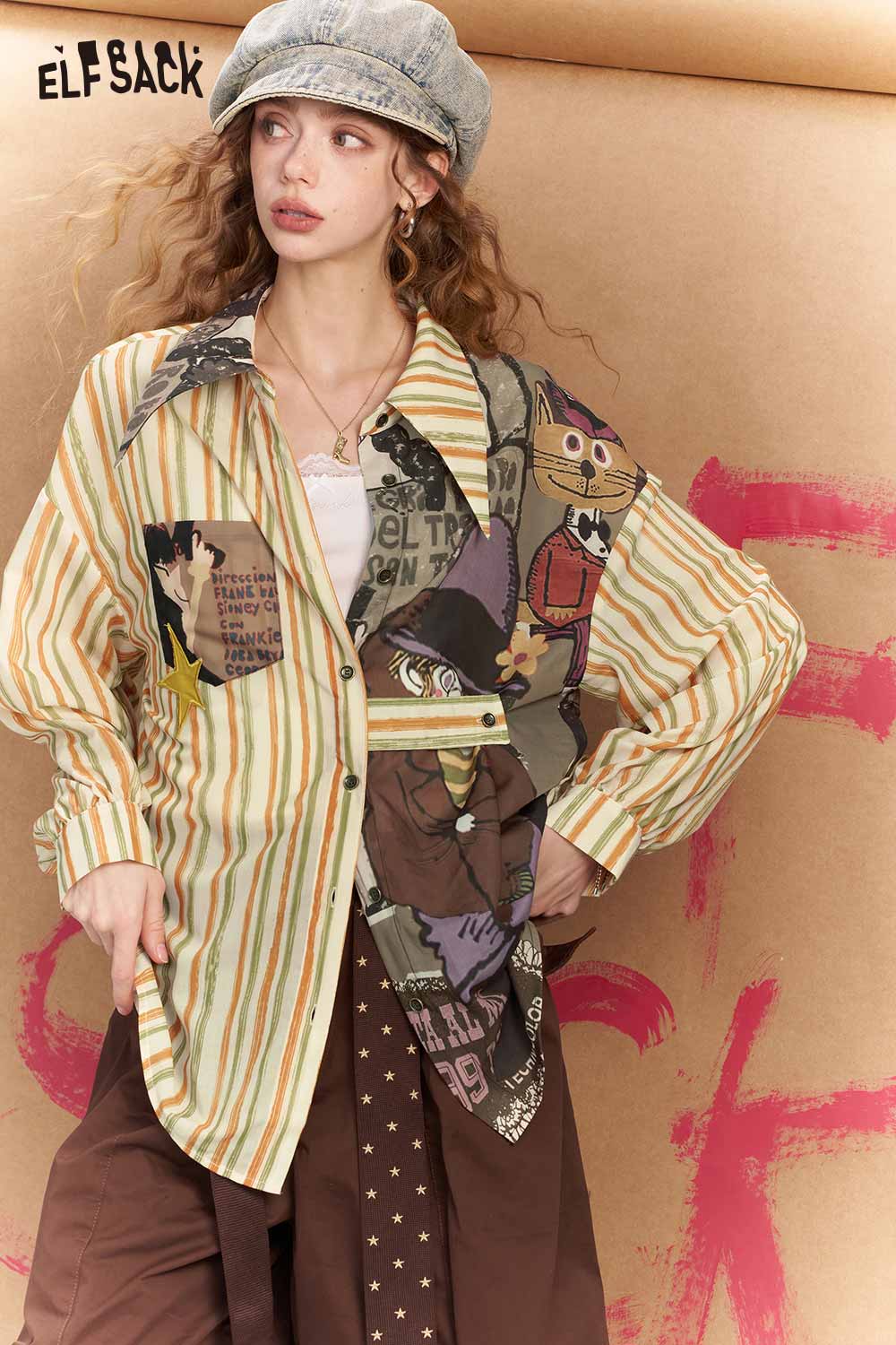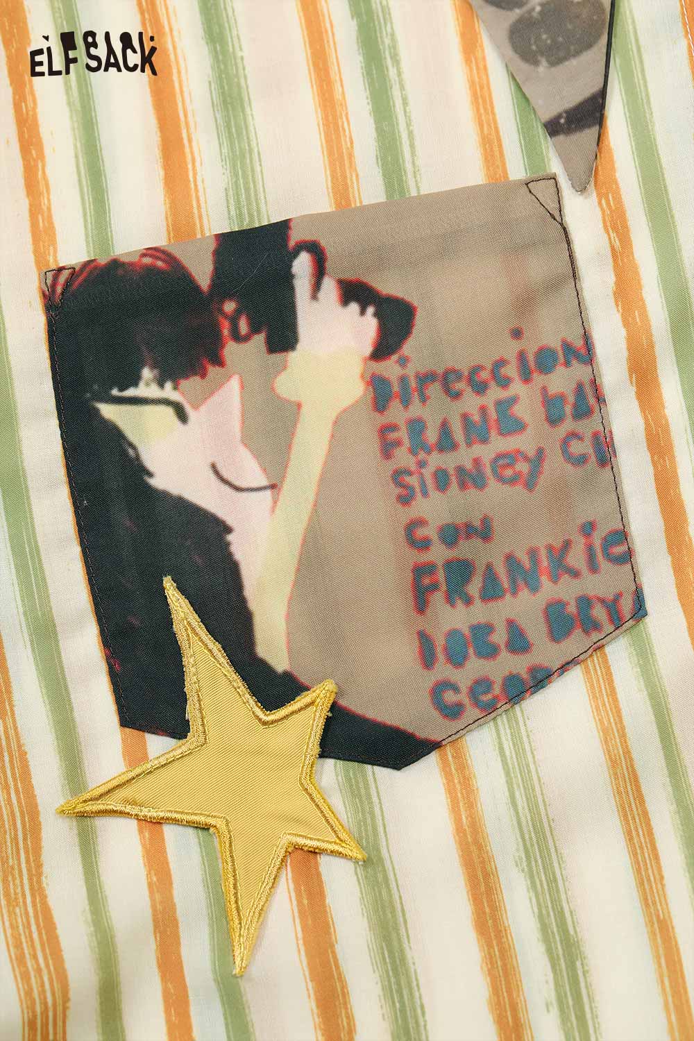 Oversized Novelty Print Shirt with Star Patch Embroidery