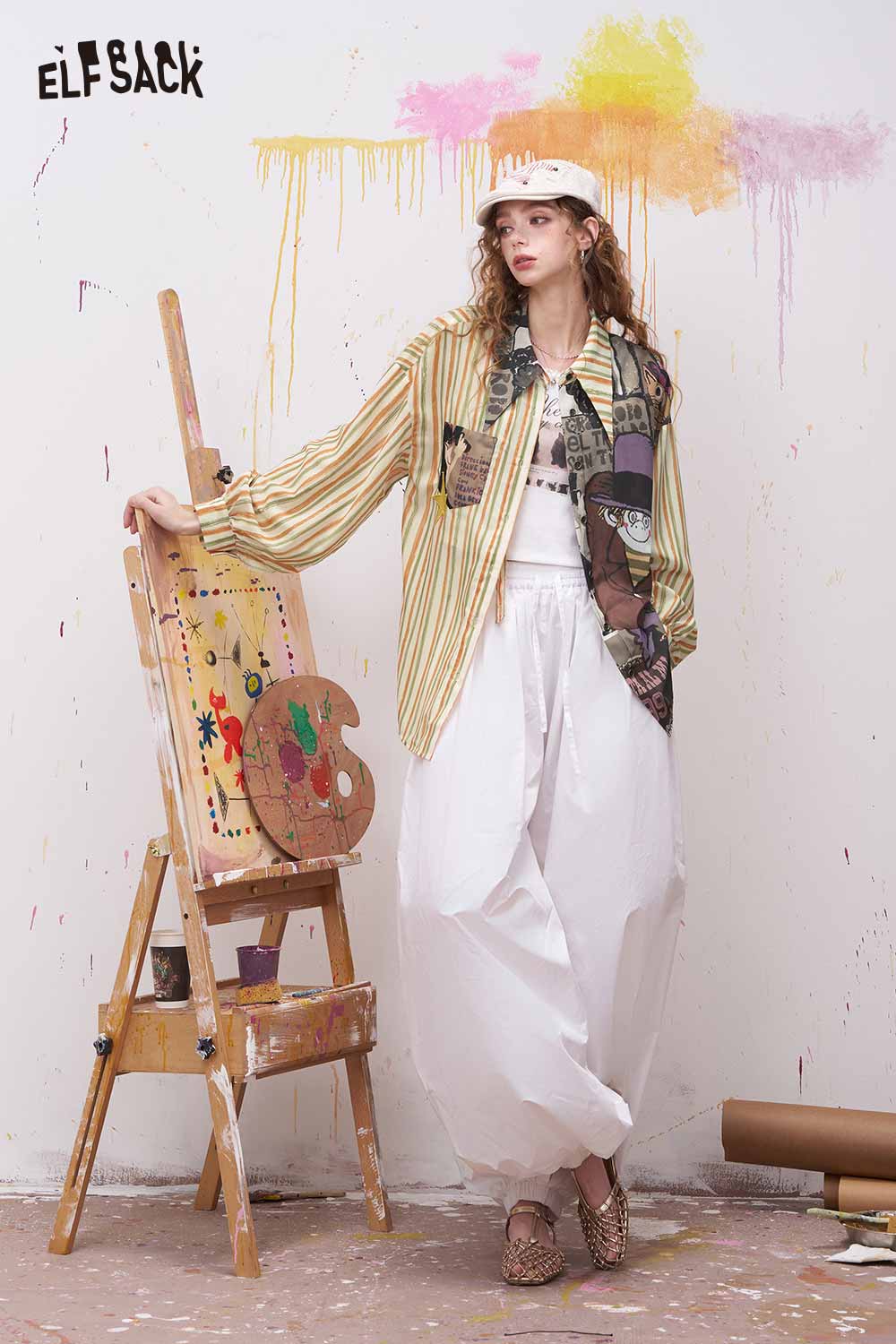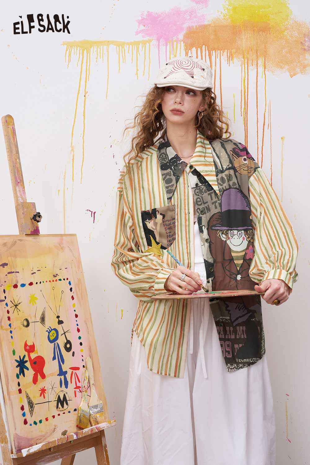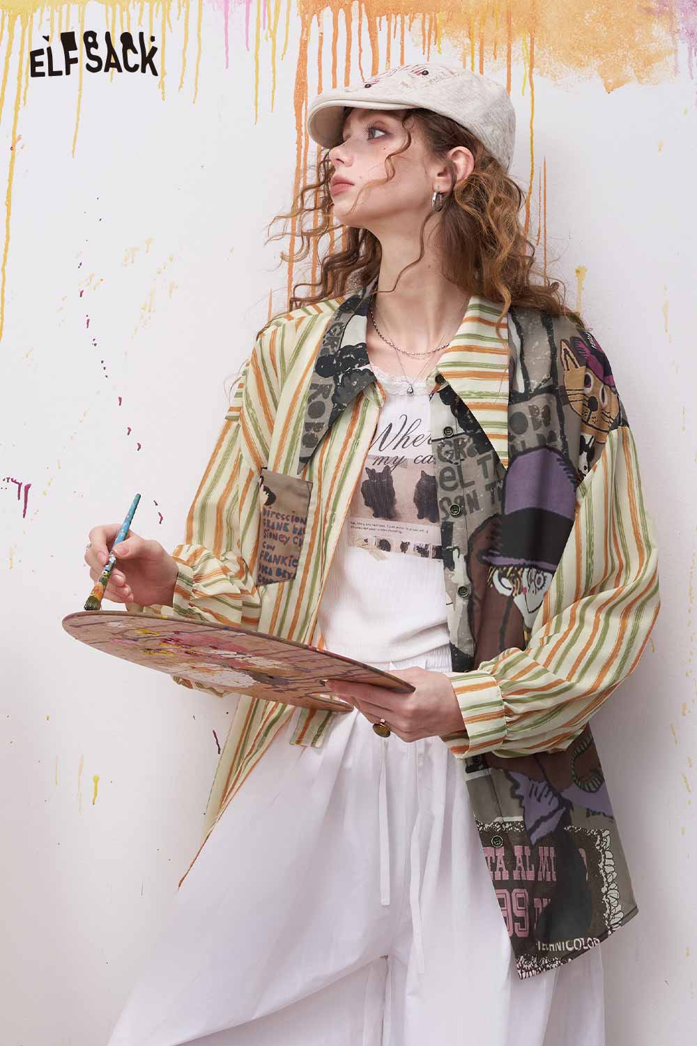 Oversized Novelty Print Shirt with Star Patch Embroidery