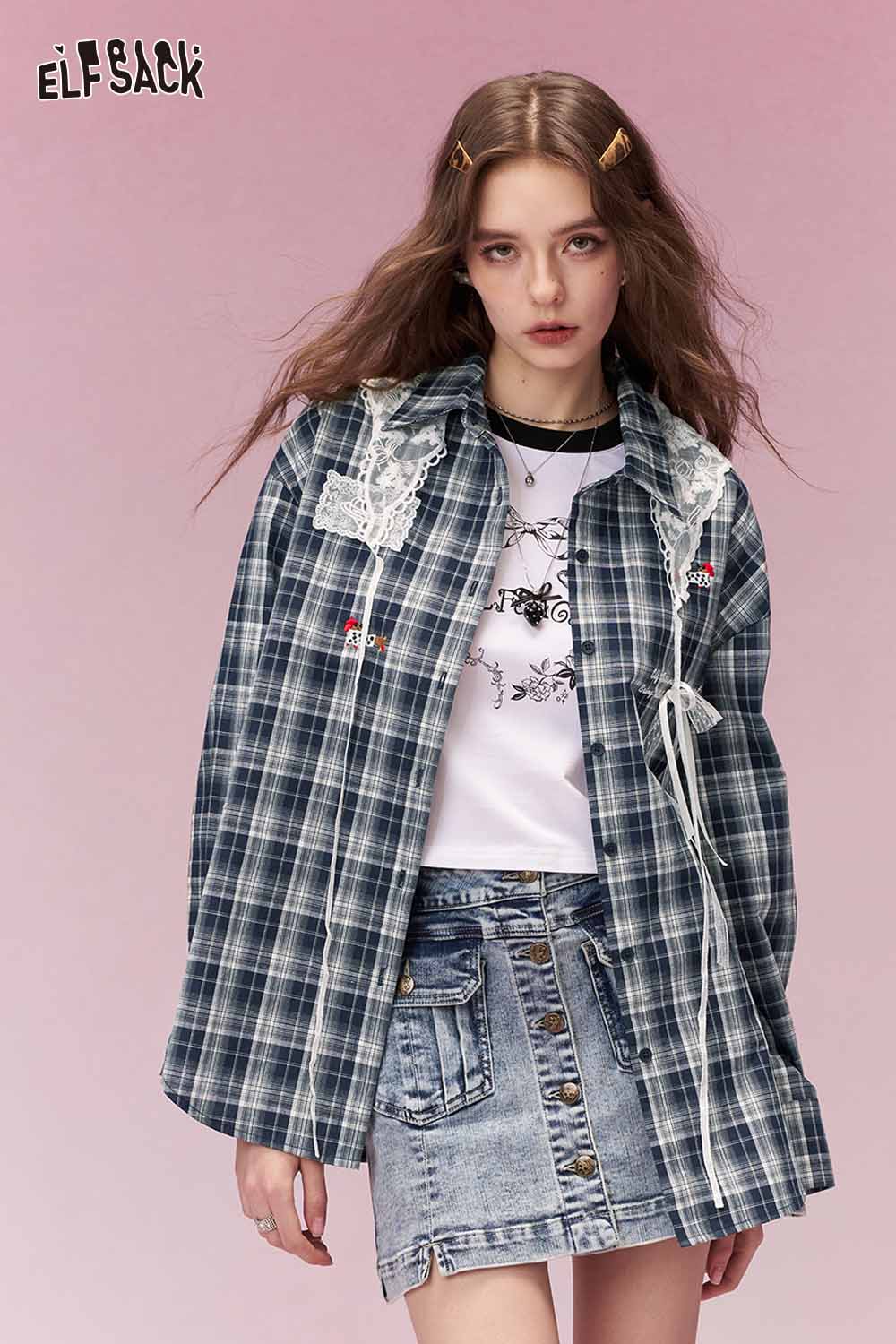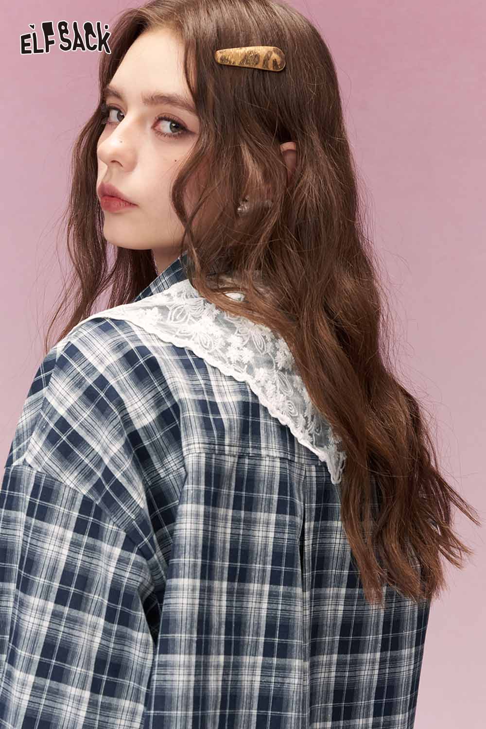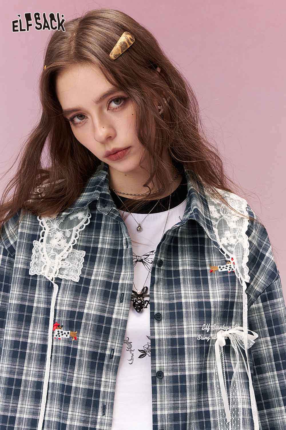 Vintage Girly Lace Insert Checkered Loose Fit Long Sleeve Shirt