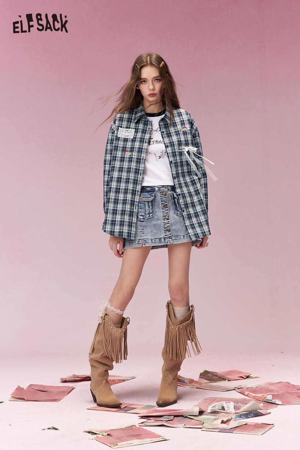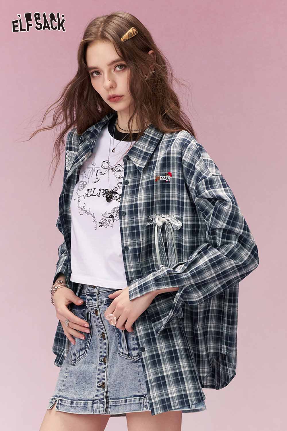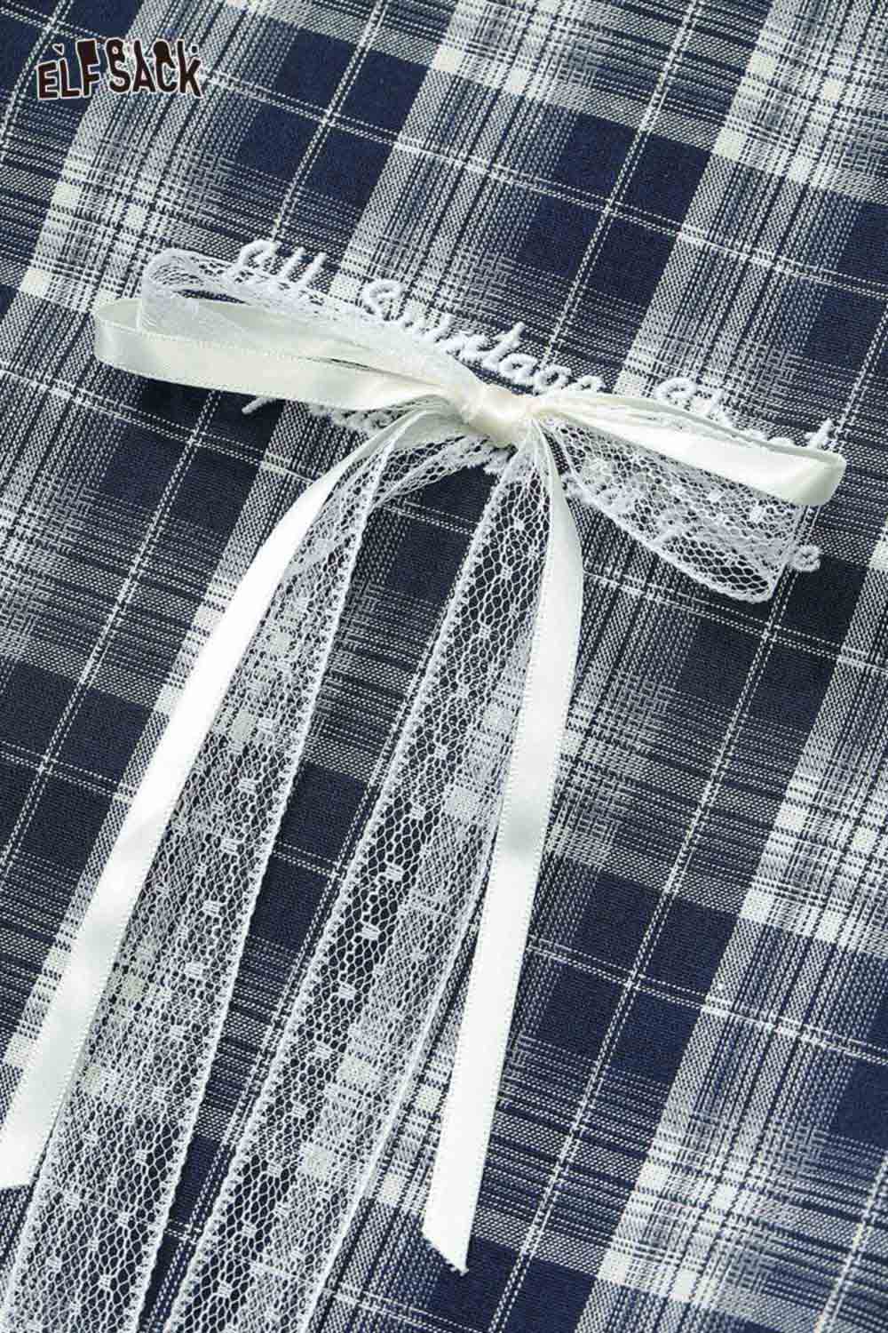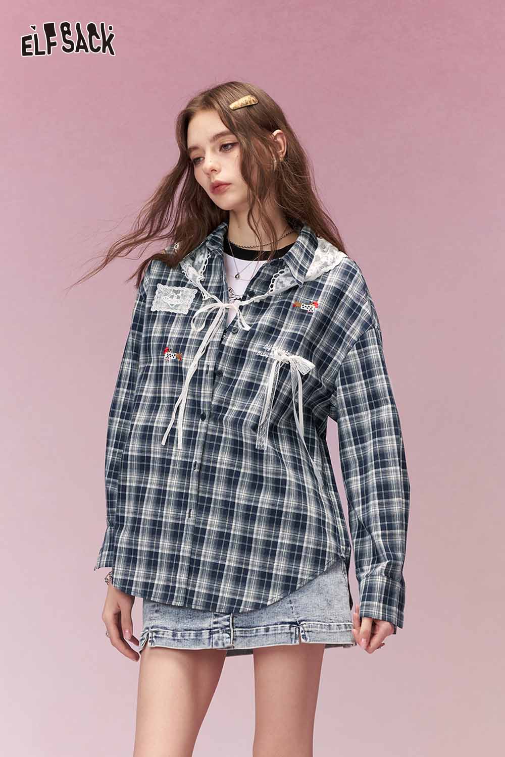 Vintage Girly Lace Insert Checkered Loose Fit Long Sleeve Shirt