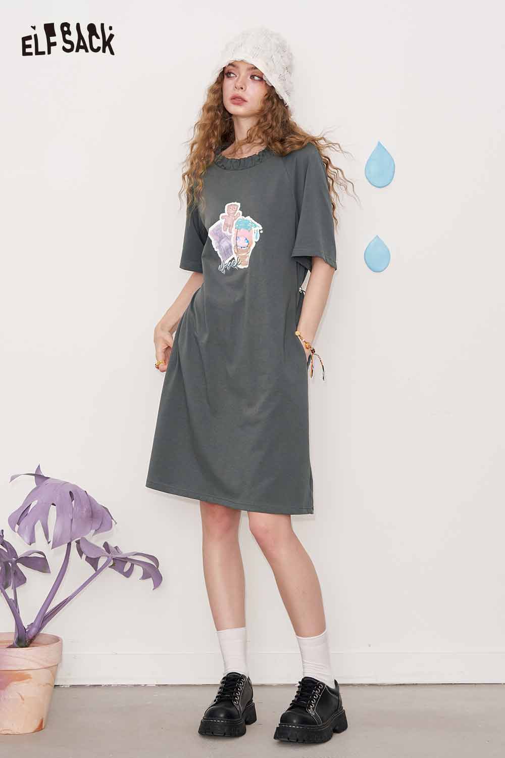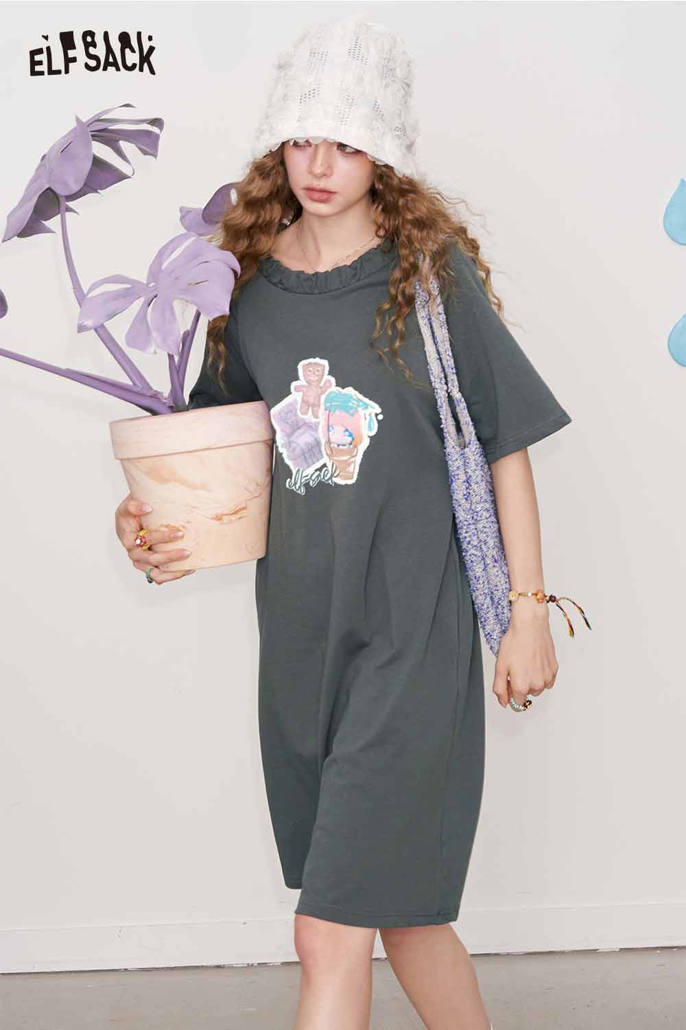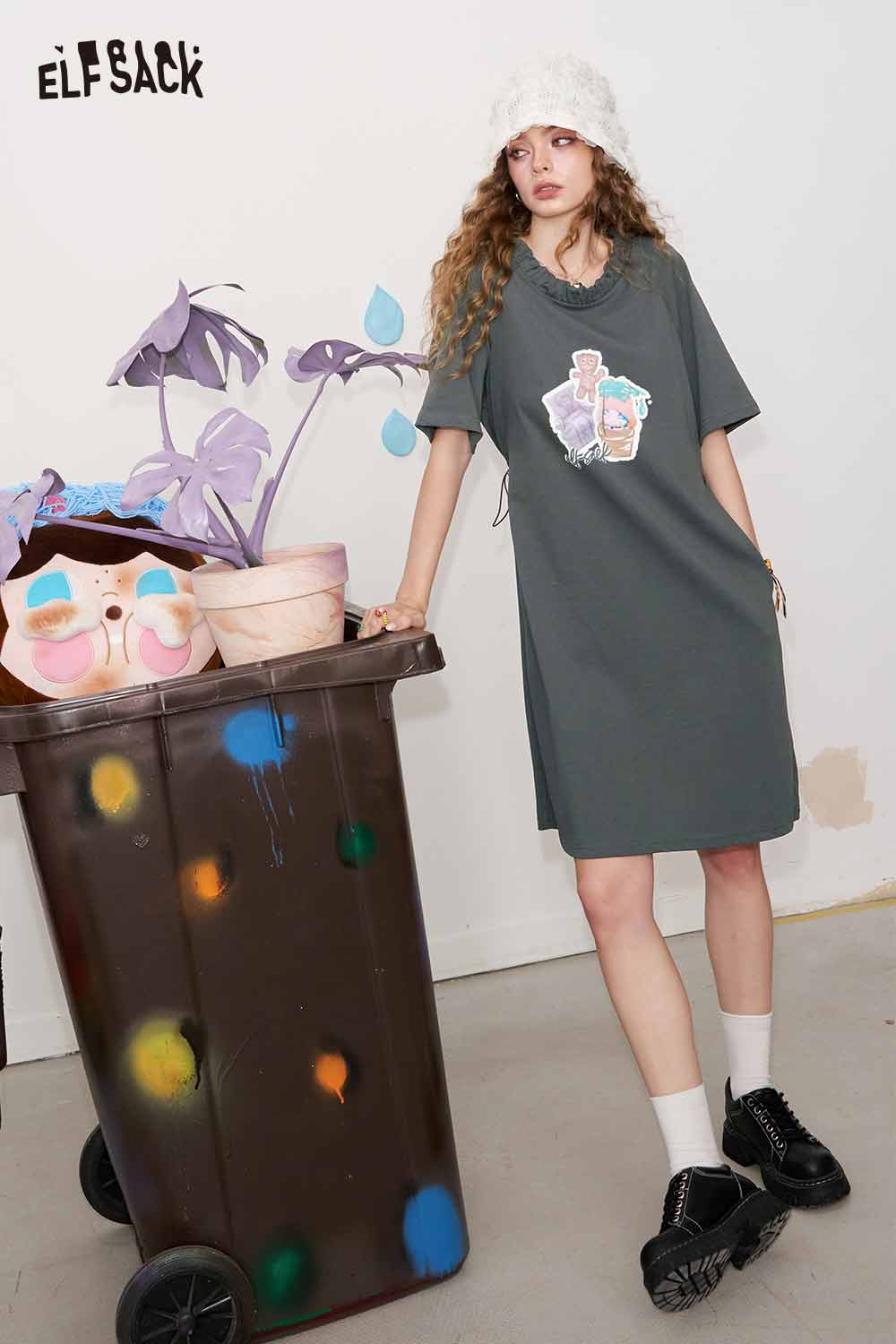 Cotton Graphic Print Casual T-shirt Dress Drawstring Waist Short Dress