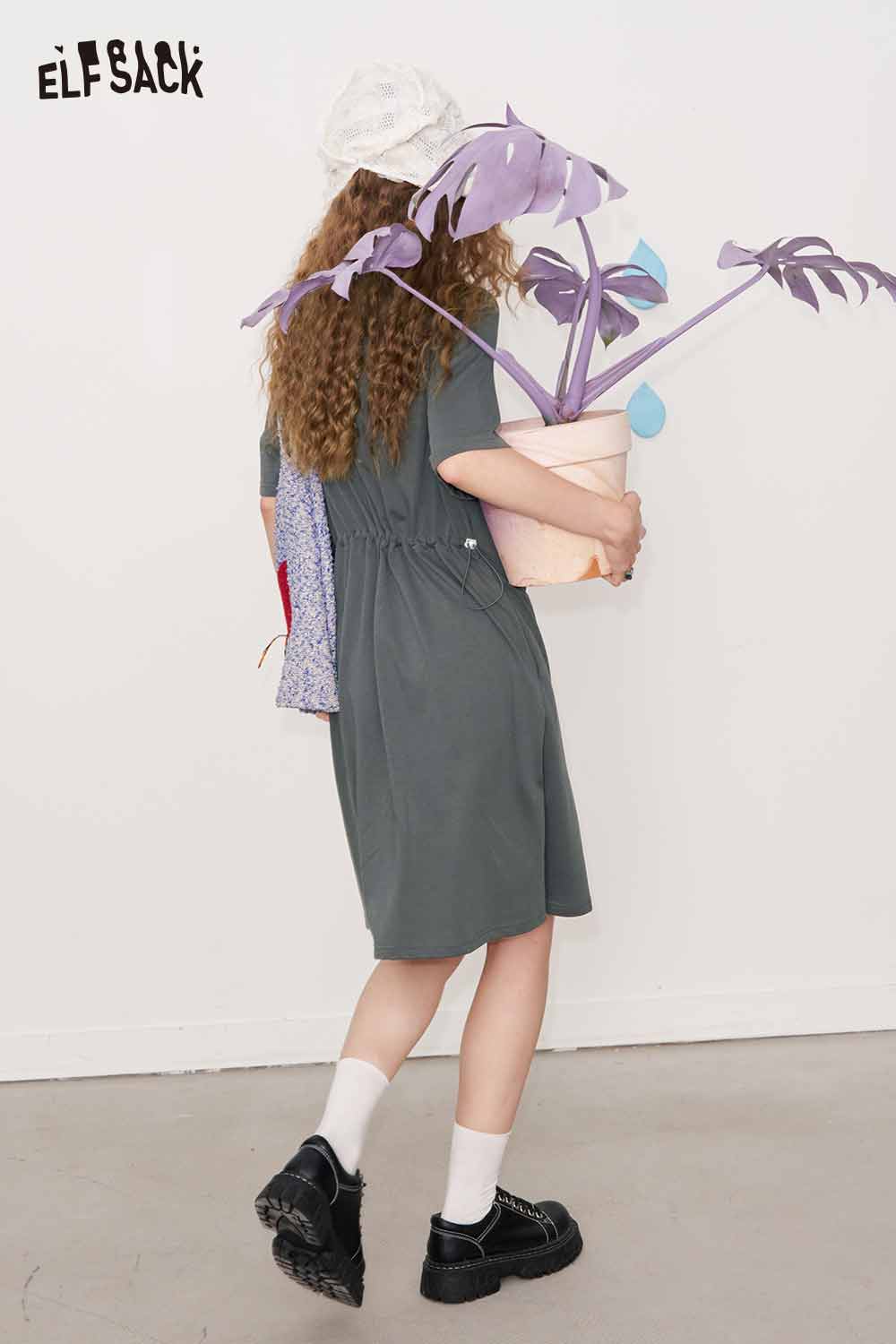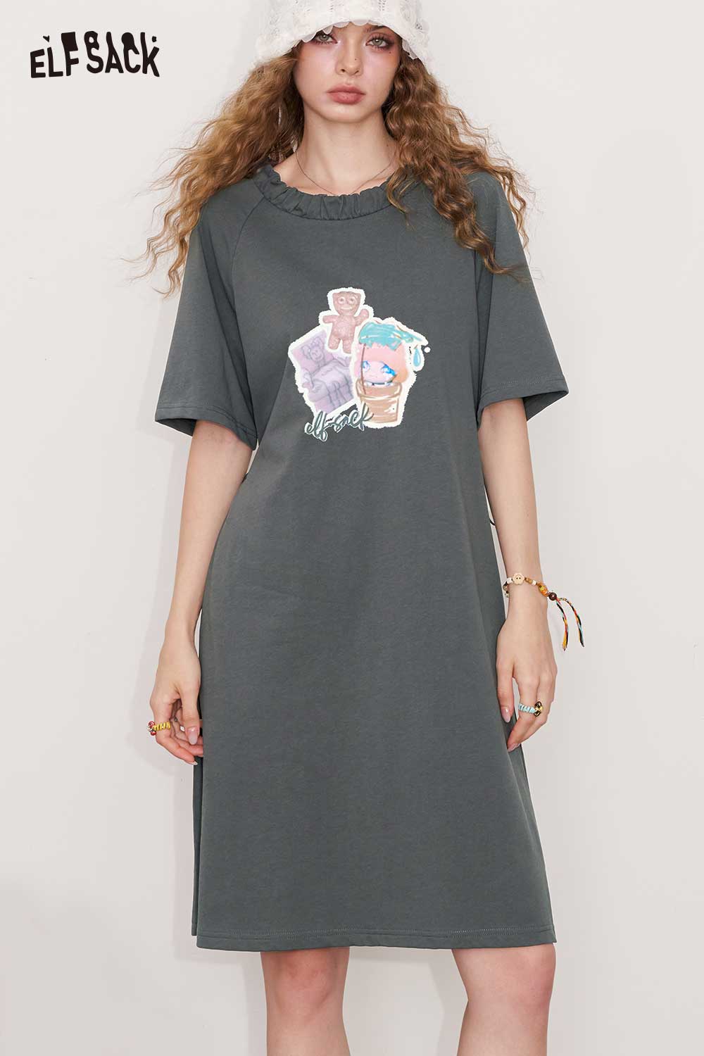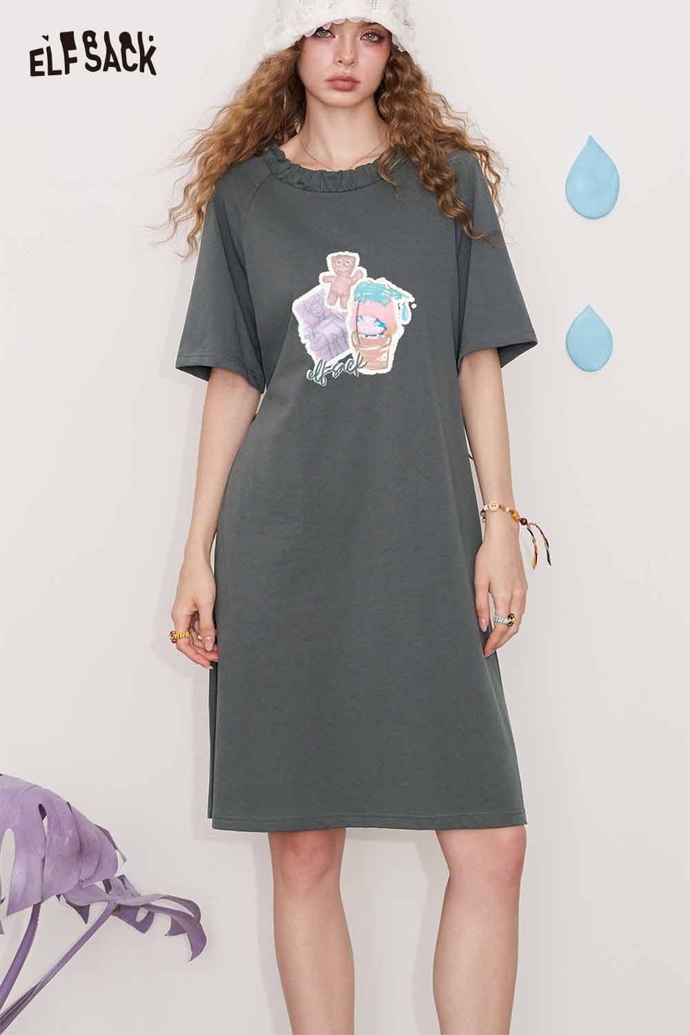 Cotton Graphic Print Casual T-shirt Dress Drawstring Waist Short Dress