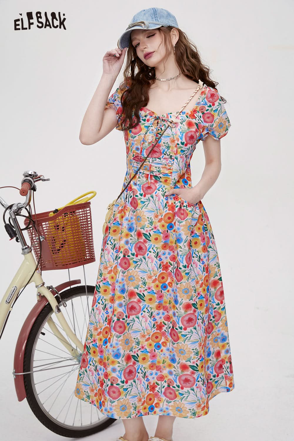 picnic travel vacation holiday soft comfortable fitted puff bubble dress princess floral fragmented flowers elastic waist
