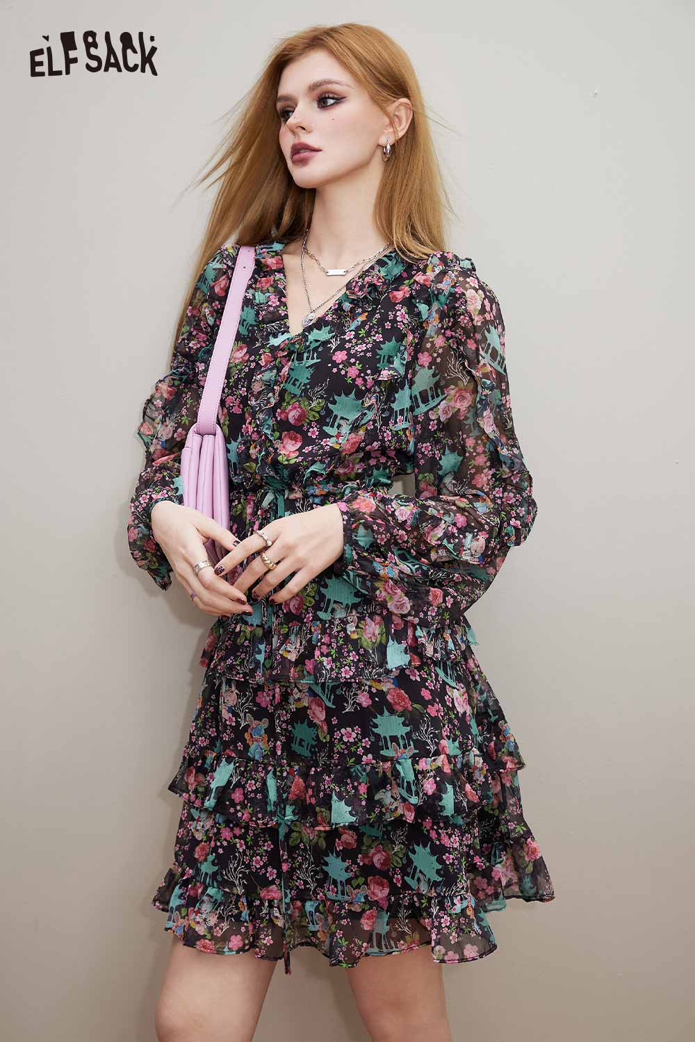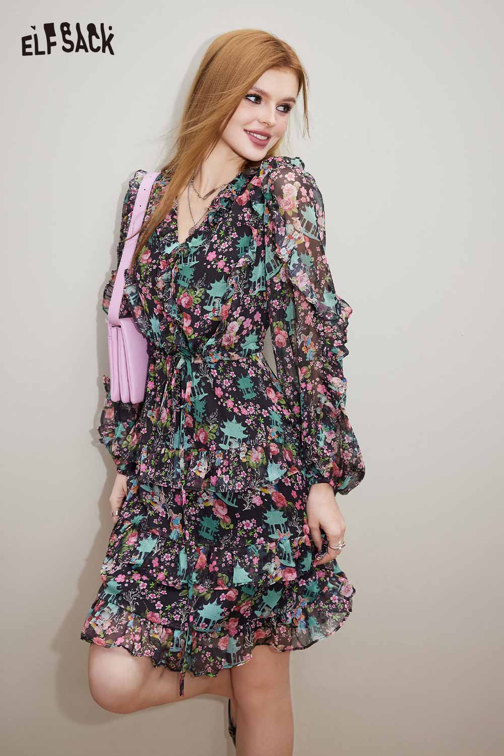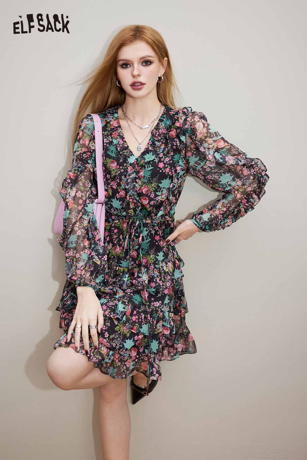 V Neck Floral Long Sleeve Waist Tie Holiday Dress