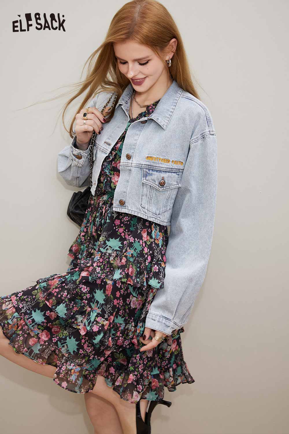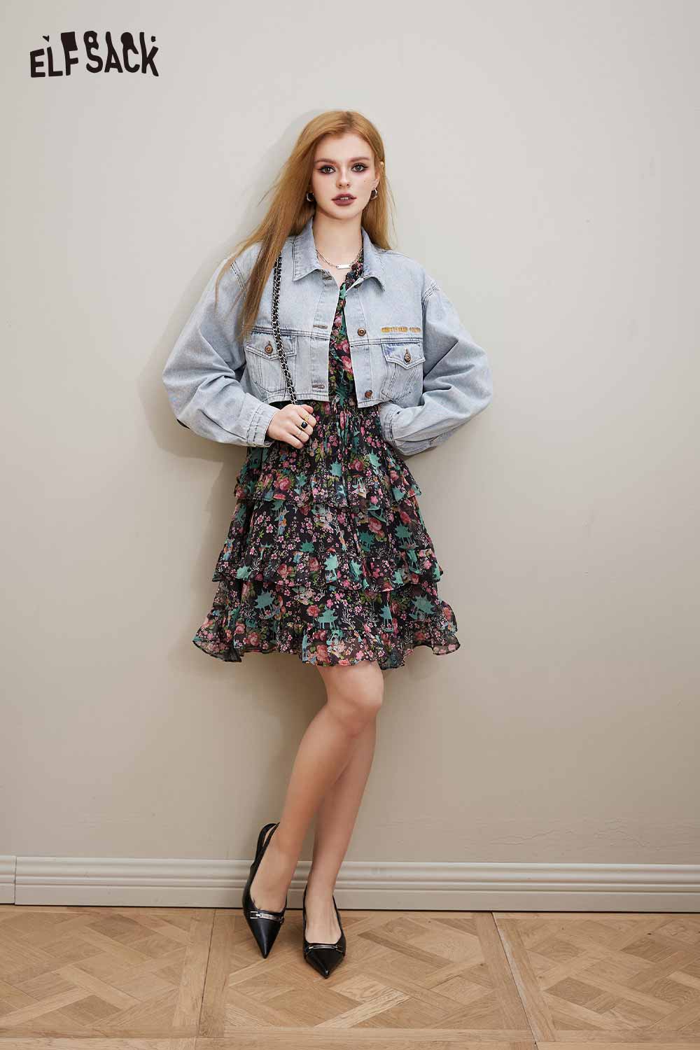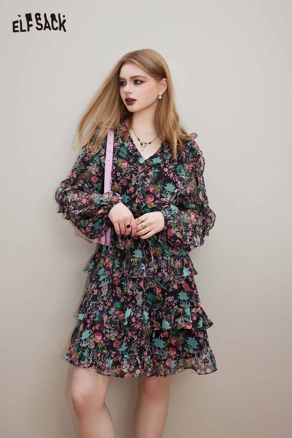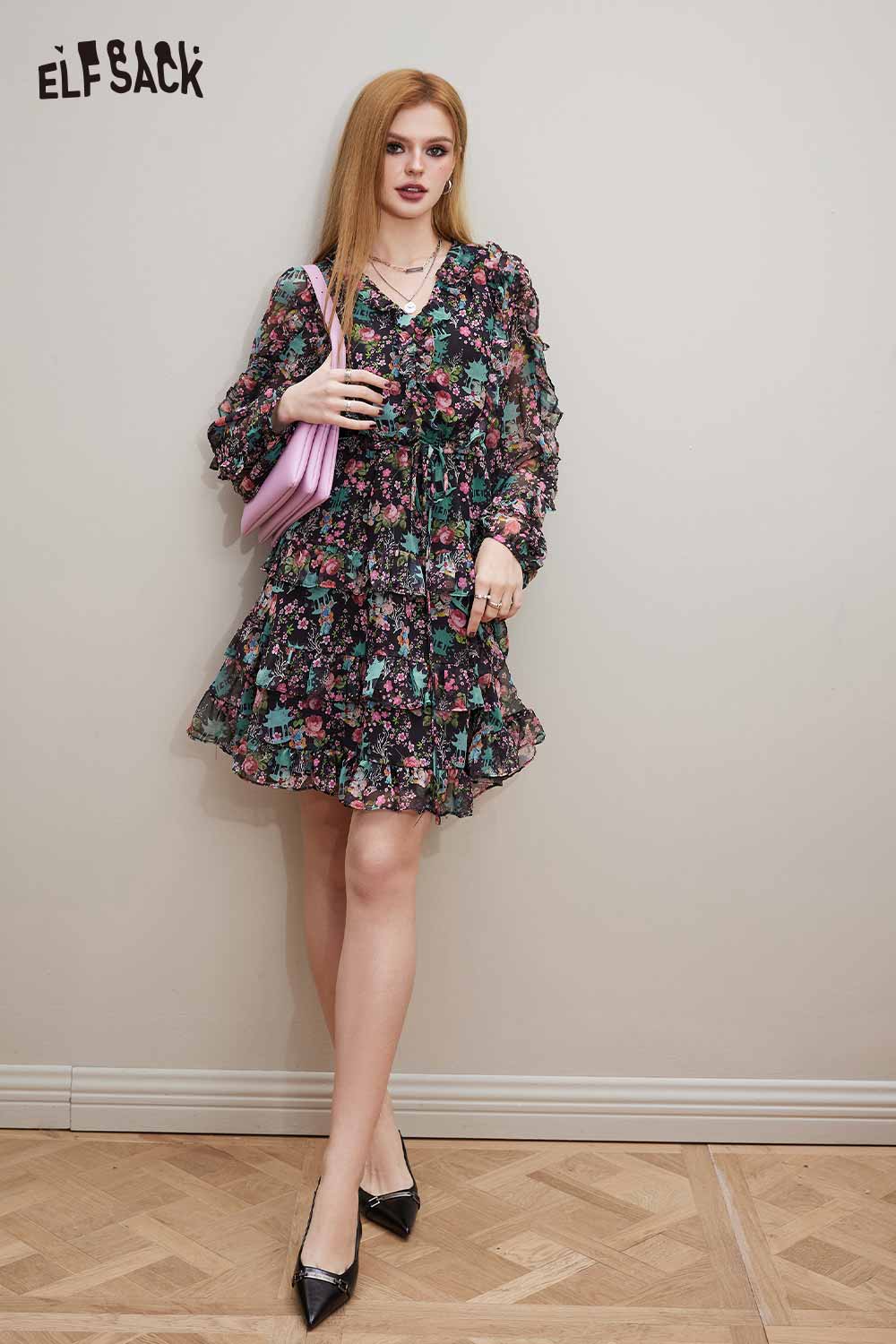 V Neck Floral Long Sleeve Waist Tie Holiday Dress