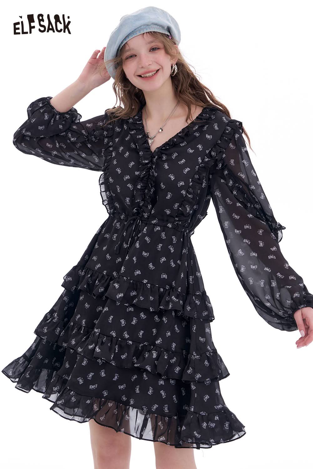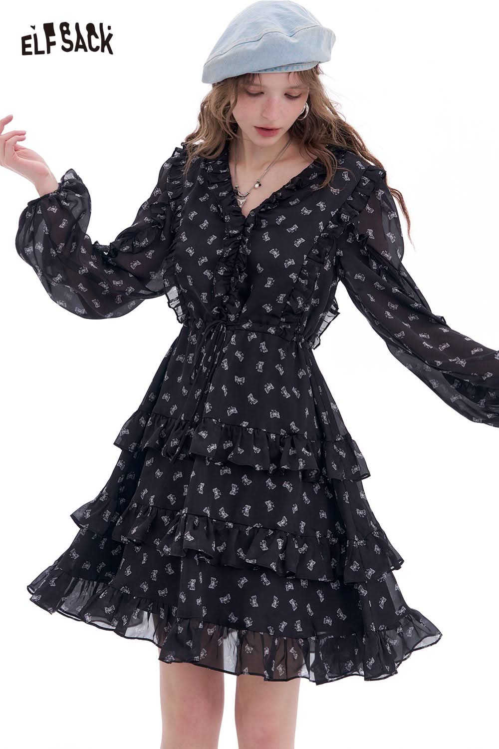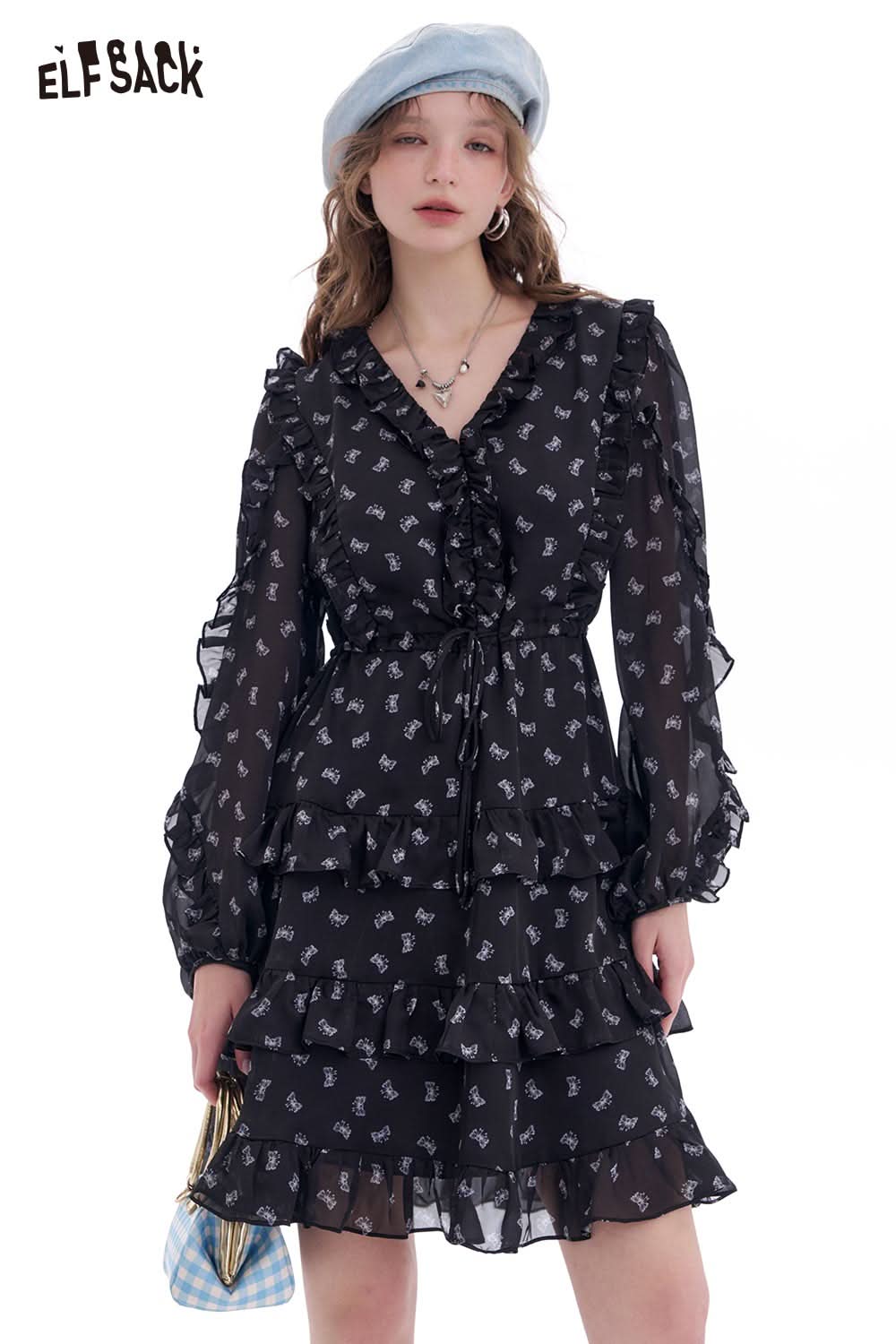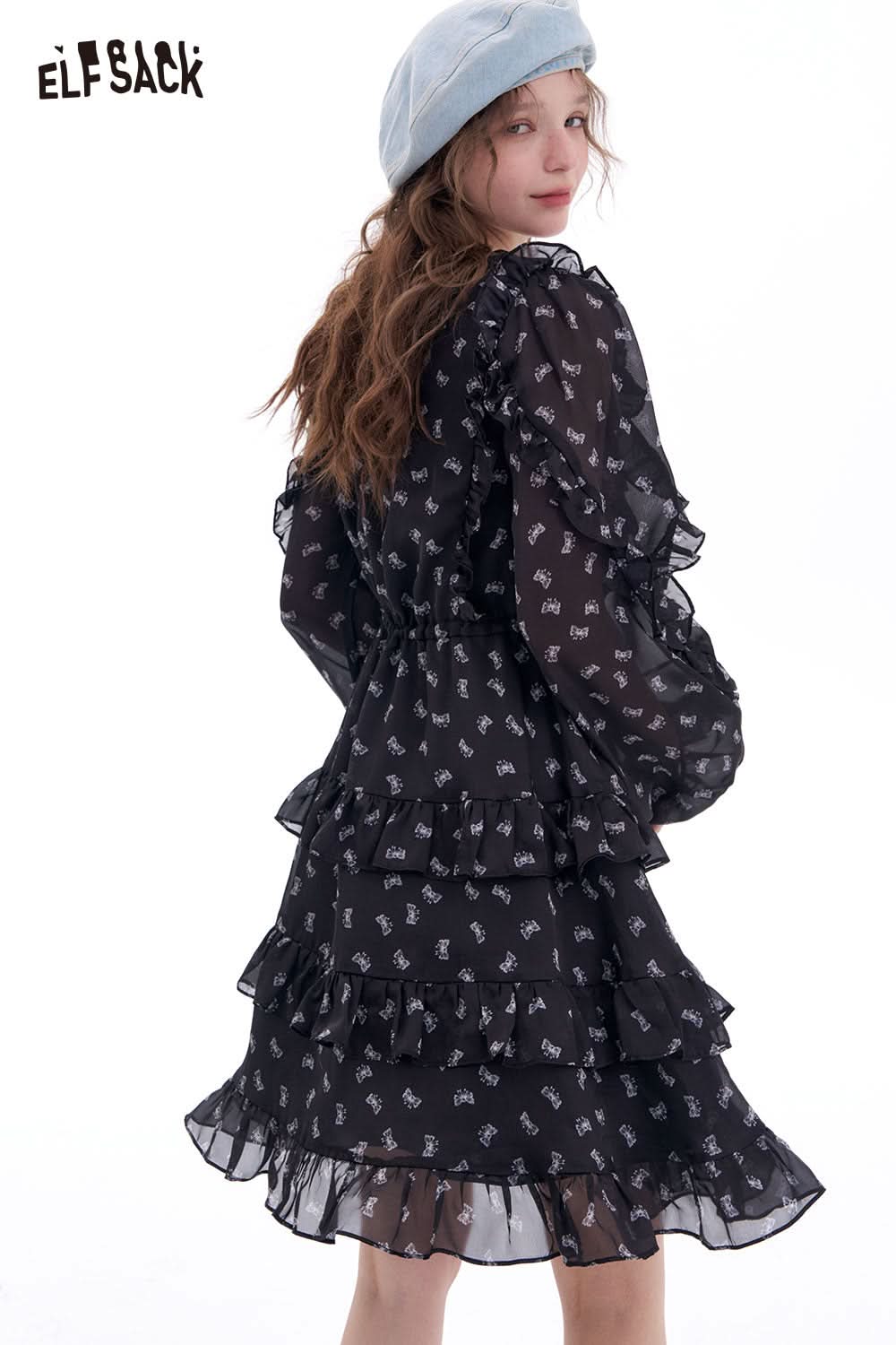 Bow All Over Print Long Sleeve Dress Autumn Cinched Waist Elegant