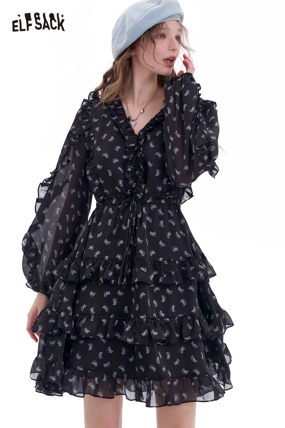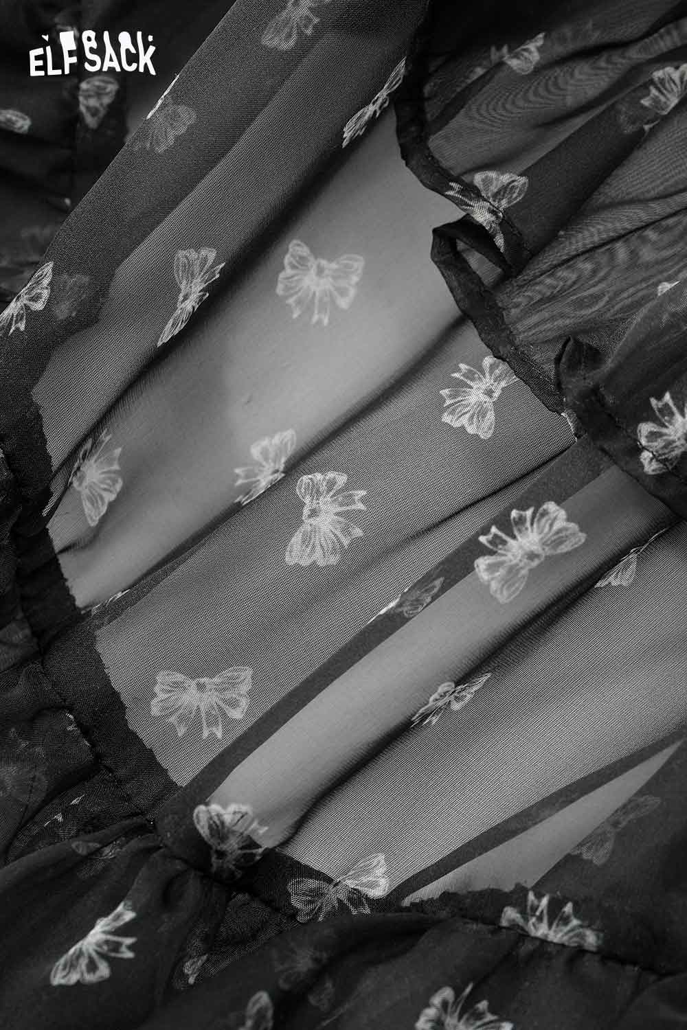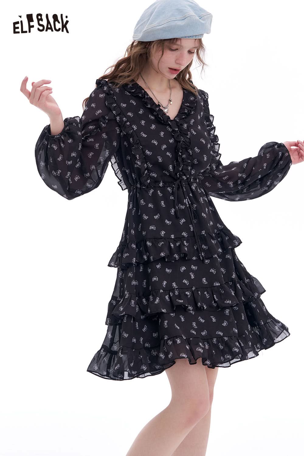 Bow All Over Print Long Sleeve Dress Autumn Cinched Waist Elegant