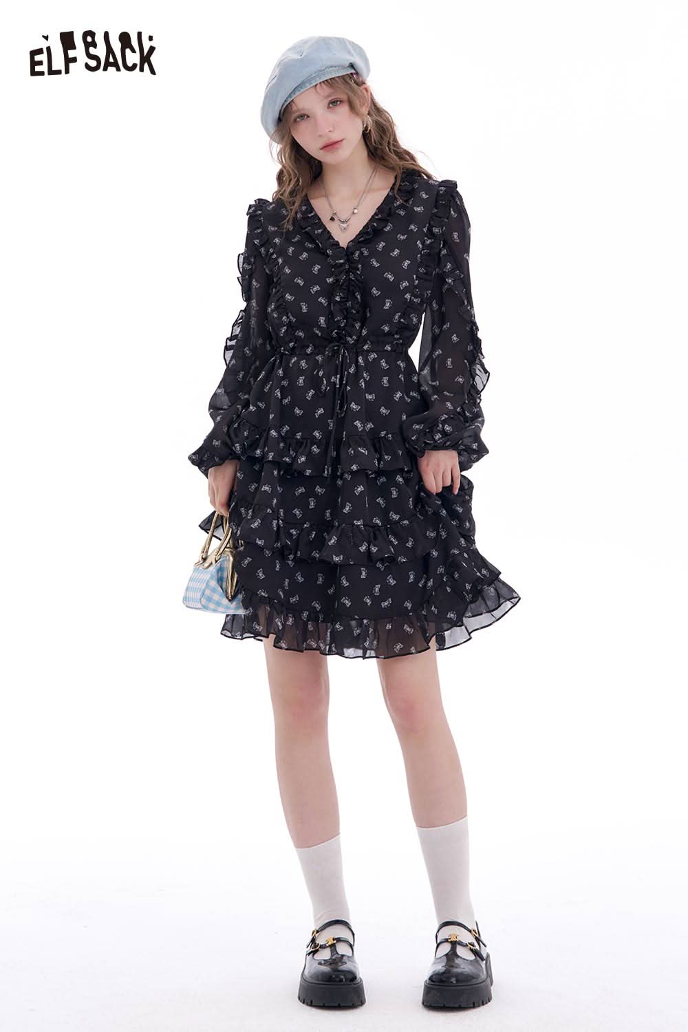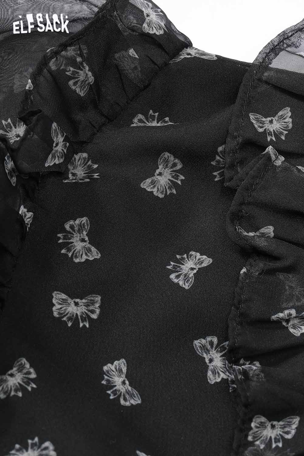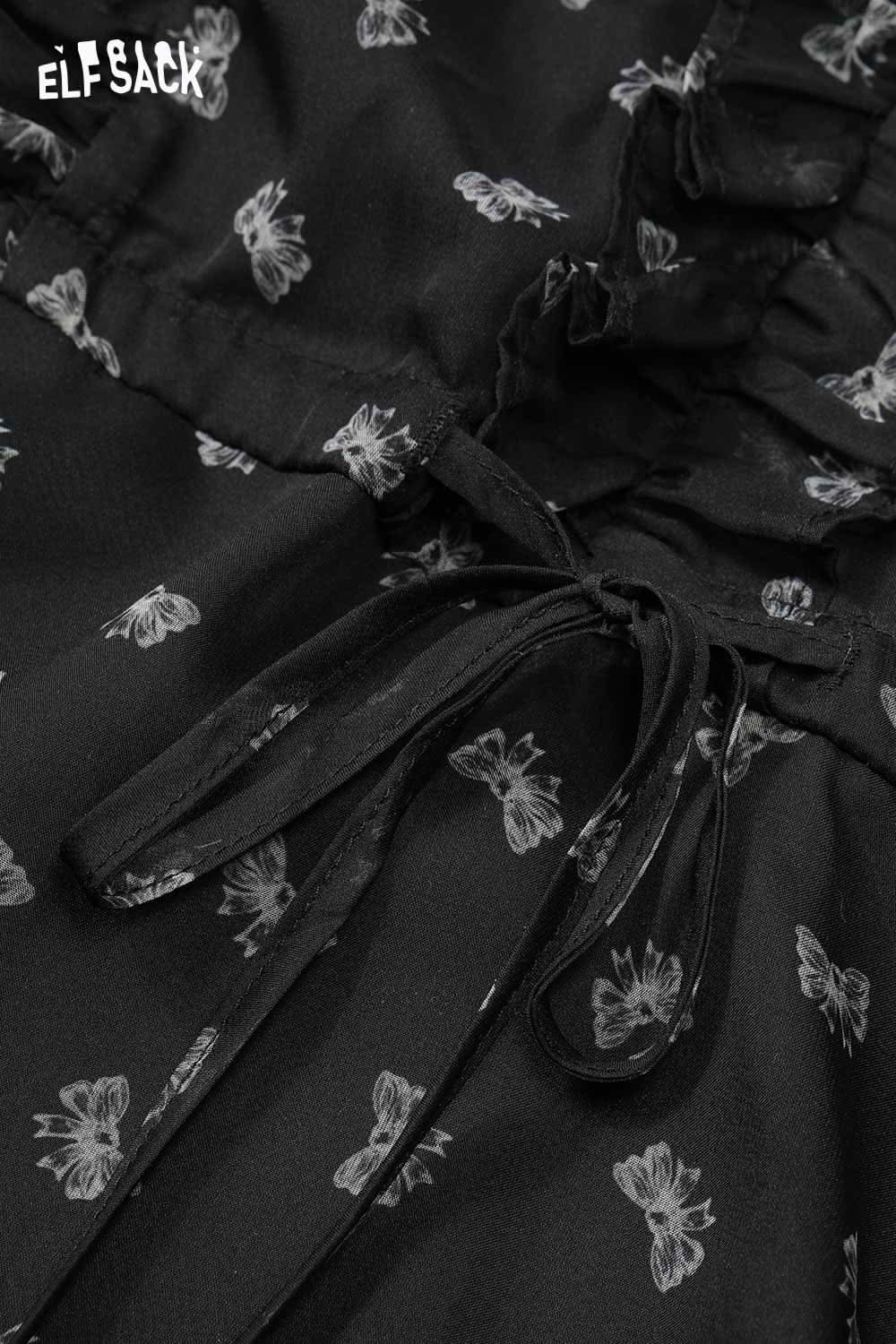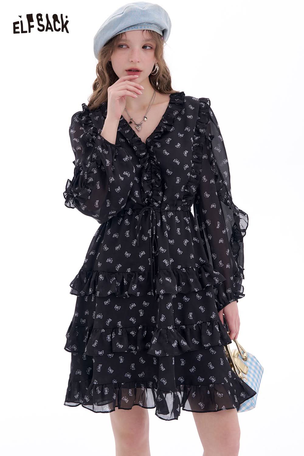 Bow All Over Print Long Sleeve Dress Autumn Cinched Waist Elegant