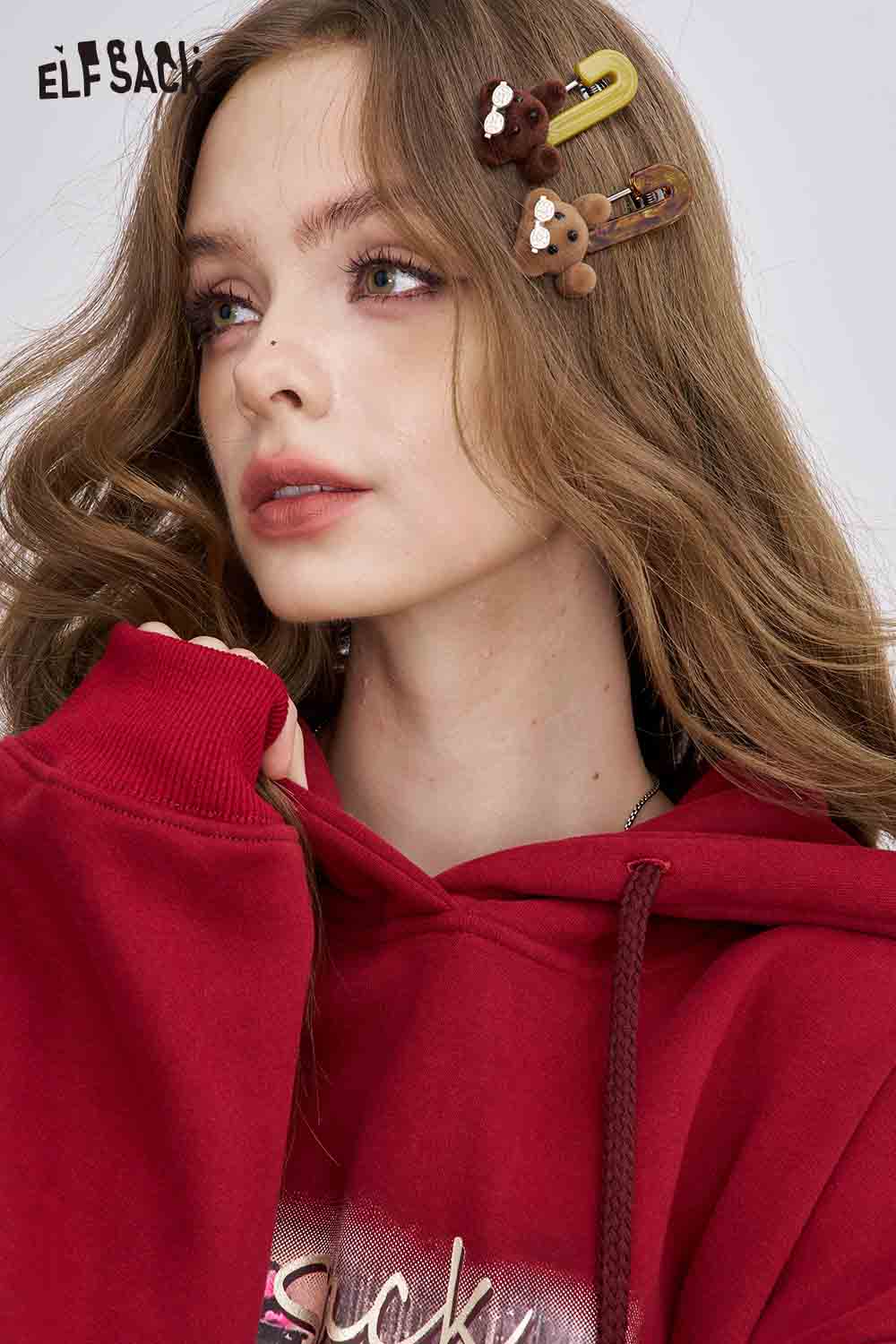 ELFSACK teddy bear hair clips showcased with a model wearing a red hoodie and stylish outfit