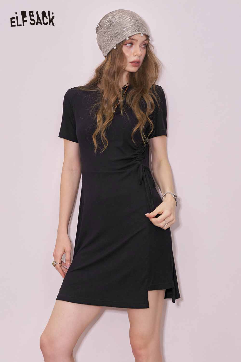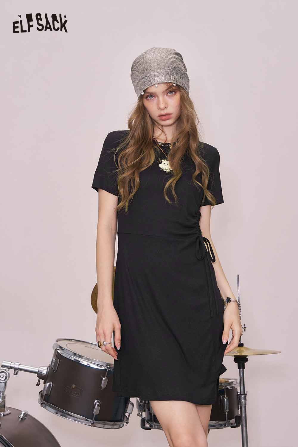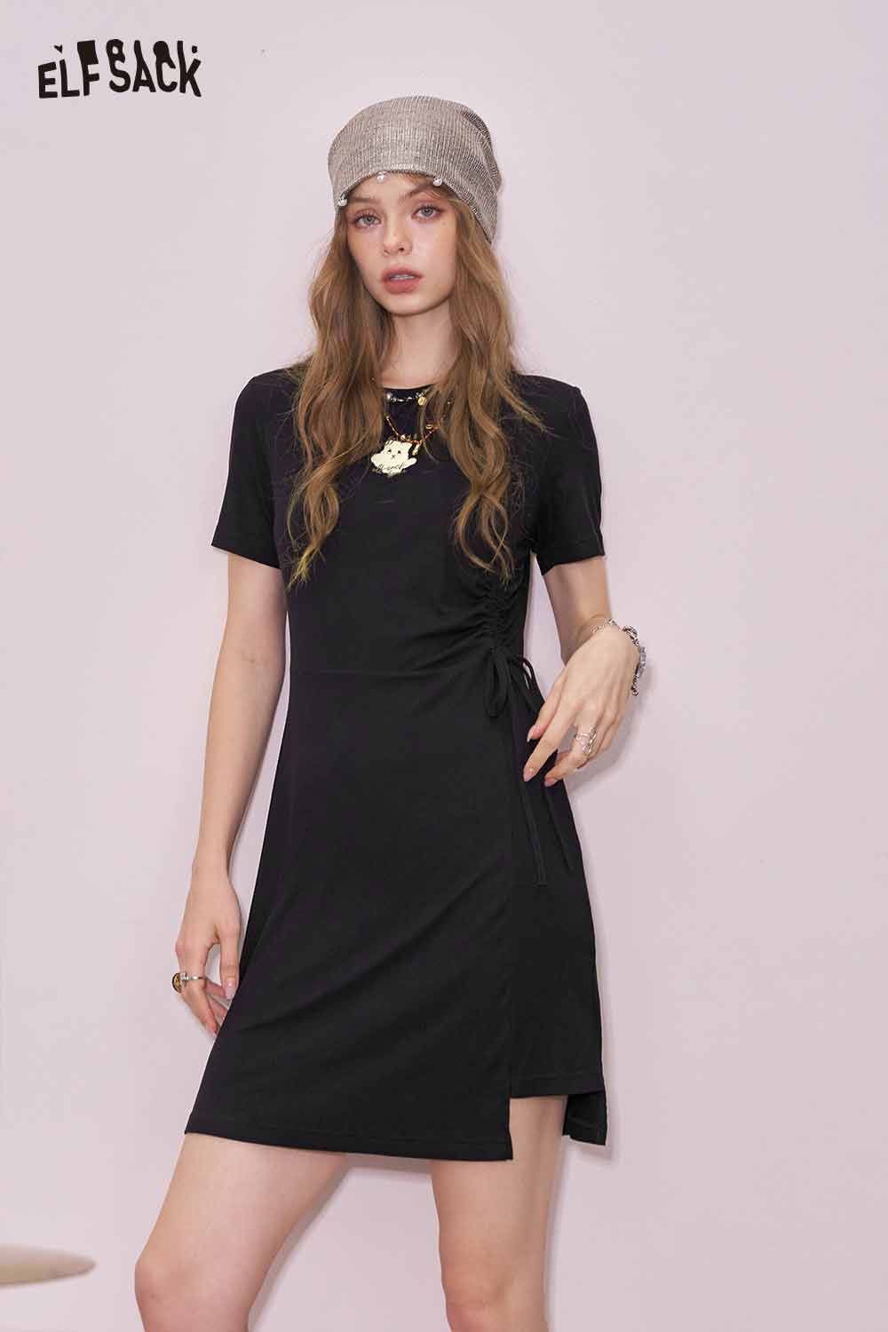 Cute Black Graphic Shirred Short Sleeve Tshirt Slim Dress