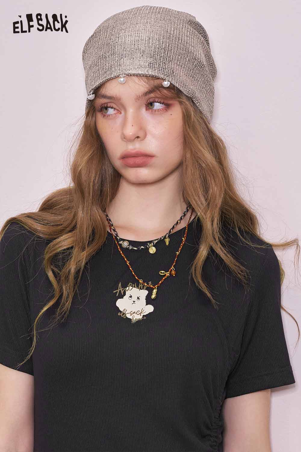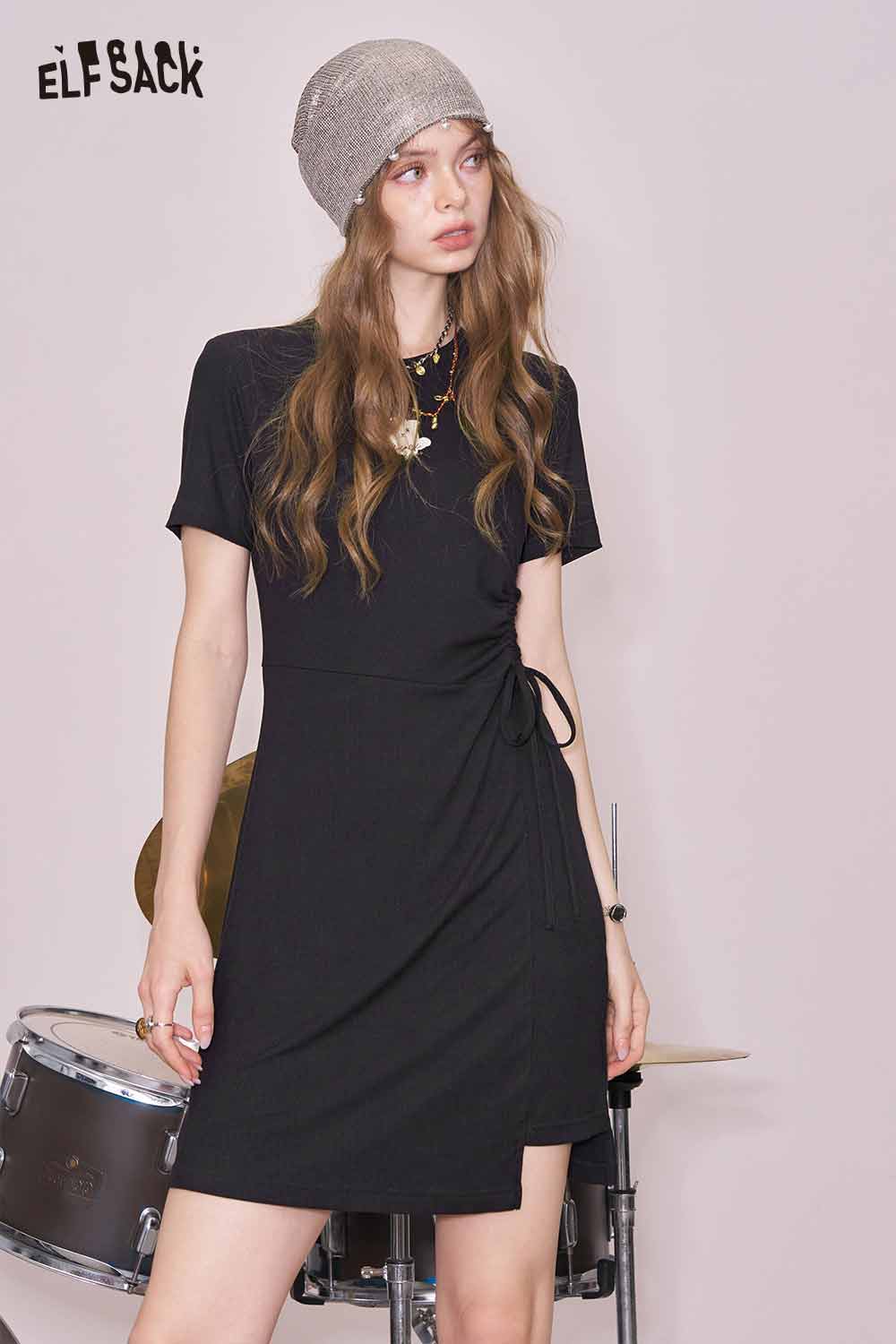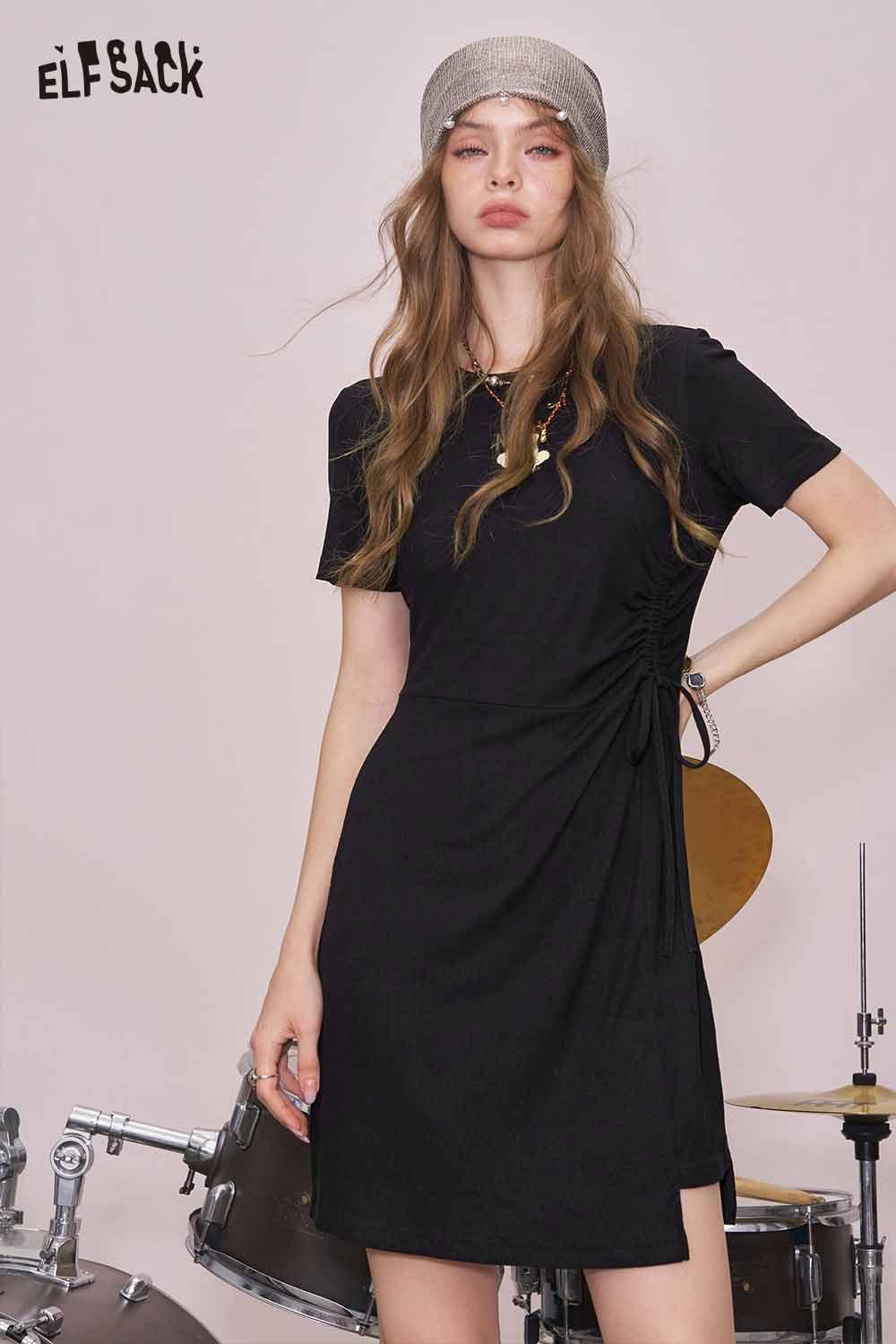 Cute Black Graphic Shirred Short Sleeve Tshirt Slim Dress