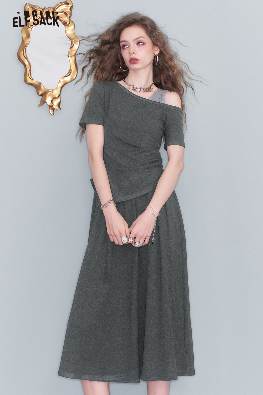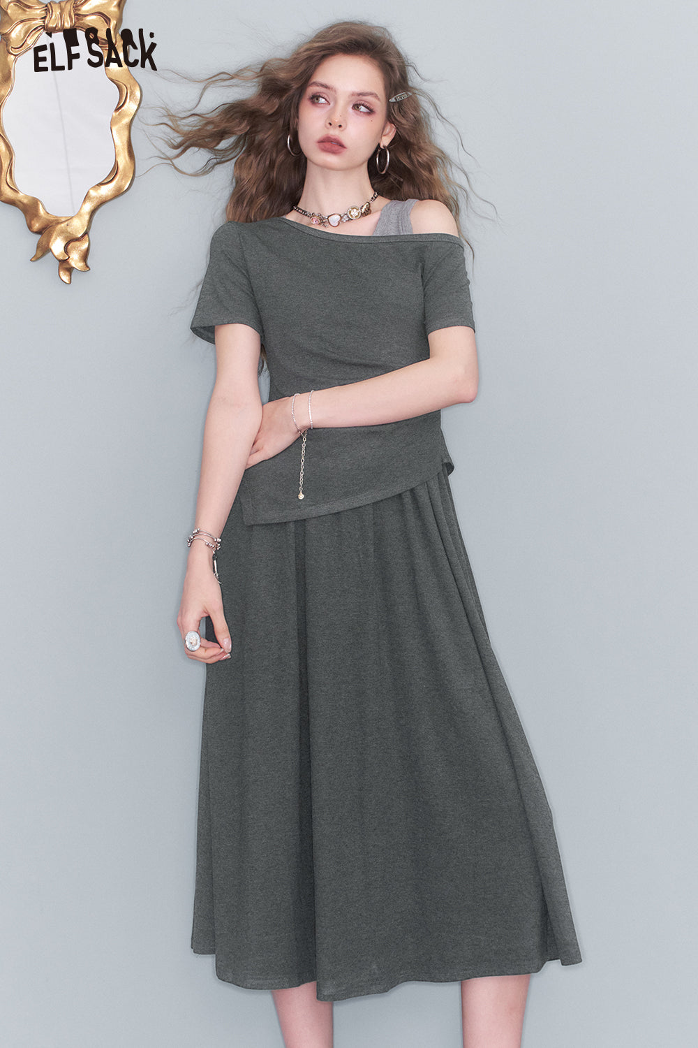 ELFSACK asymmetric neckline midi dress paired with a stylish vest and trendy accessories