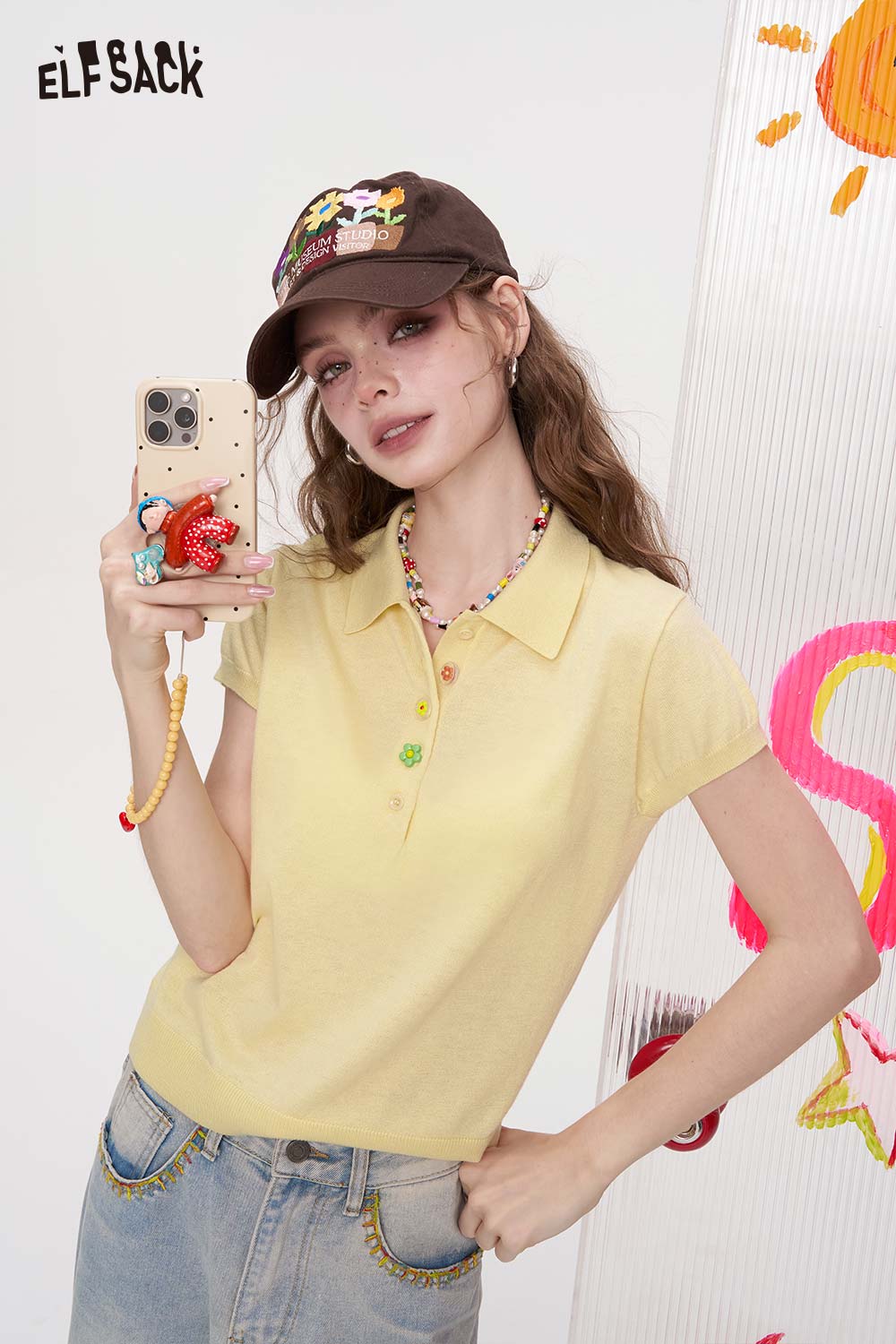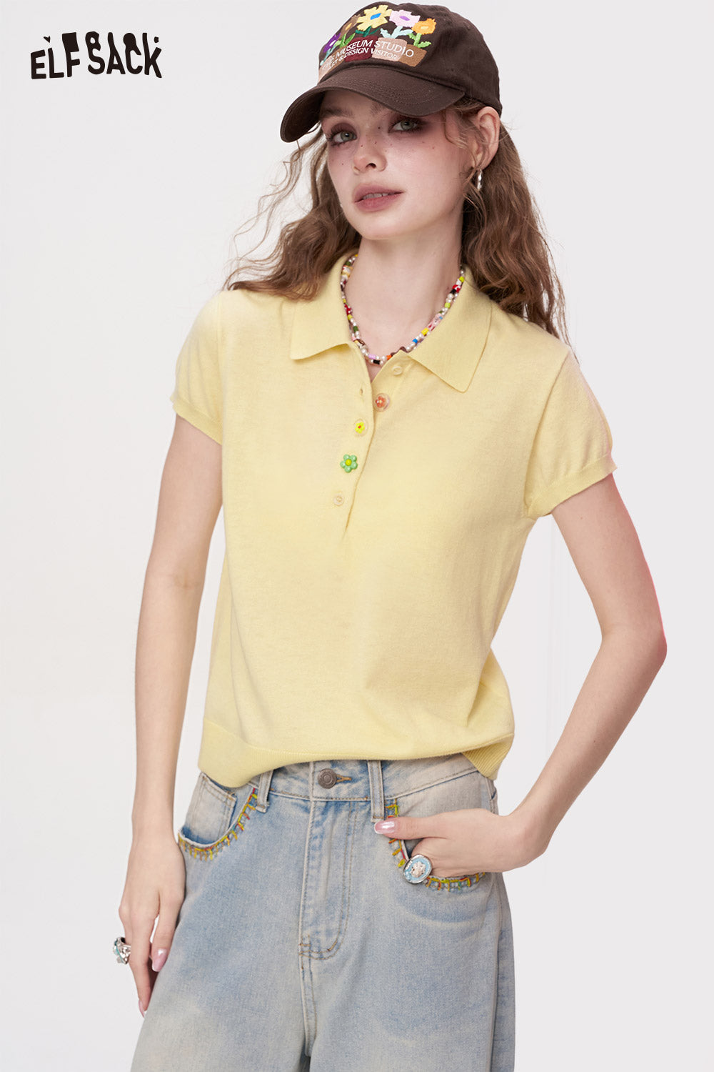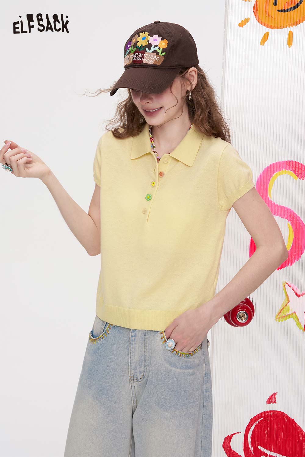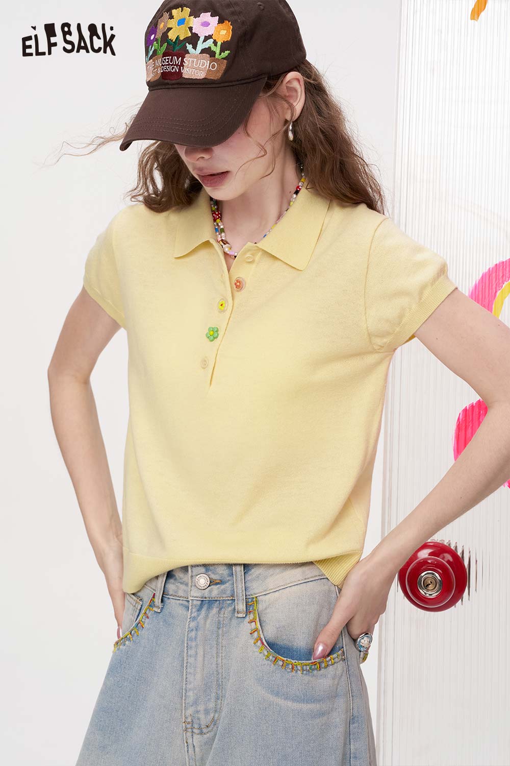 Casual Solid Polo Collar Color Button Short Sleeve Knitwear