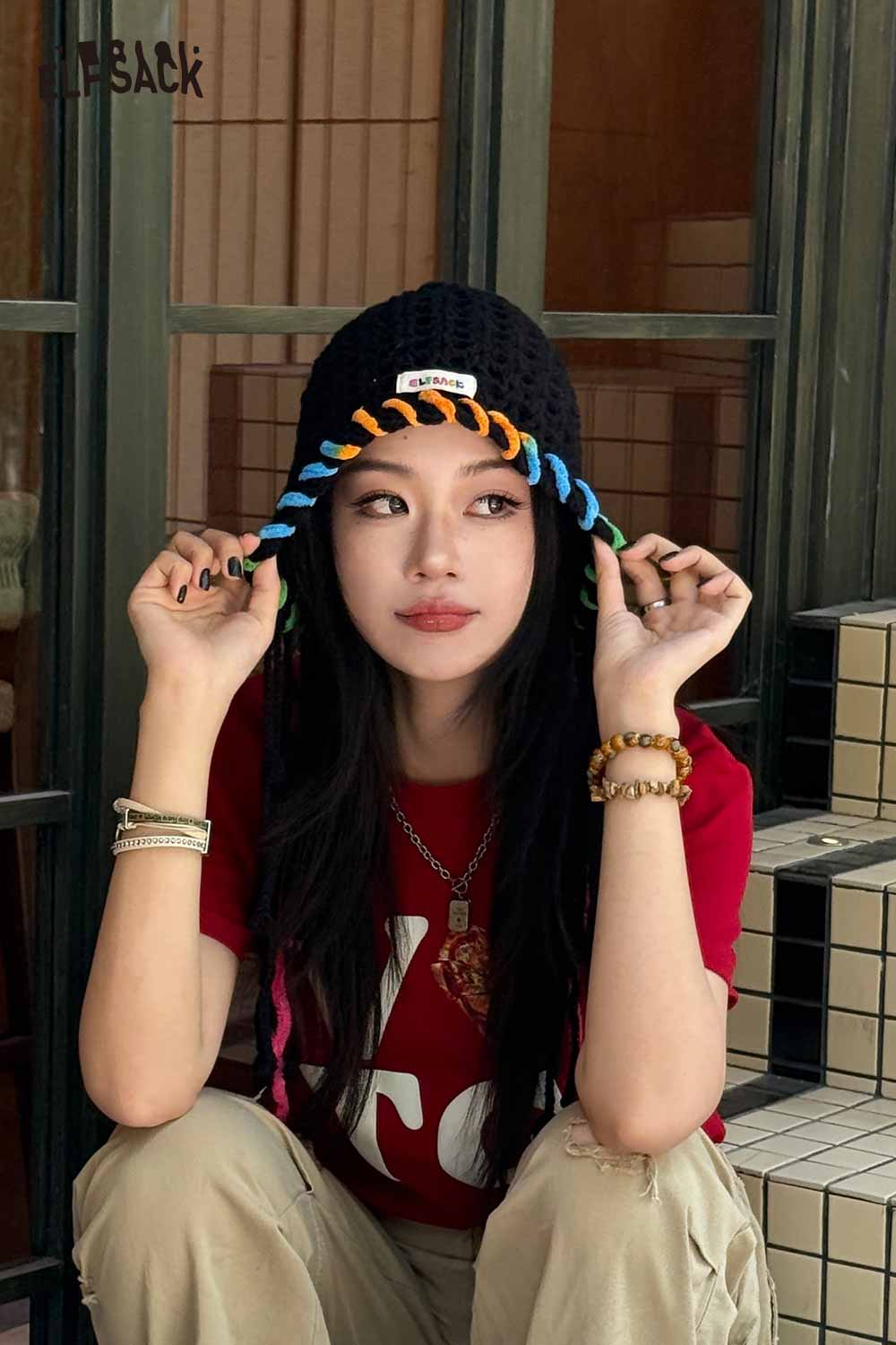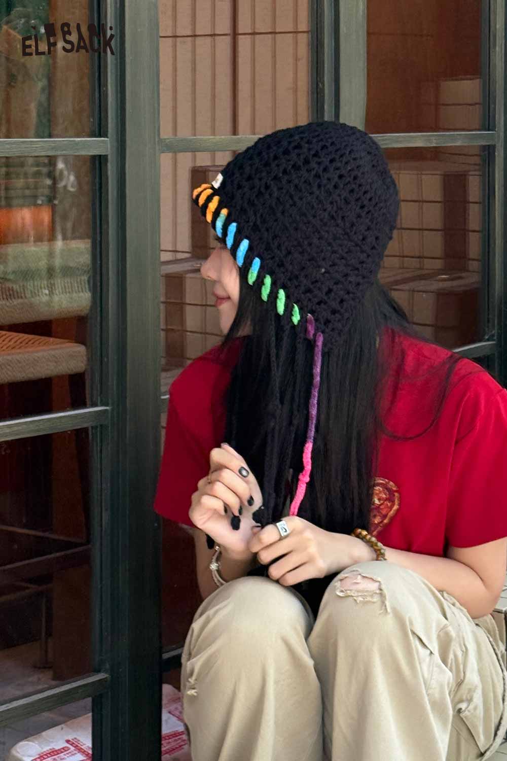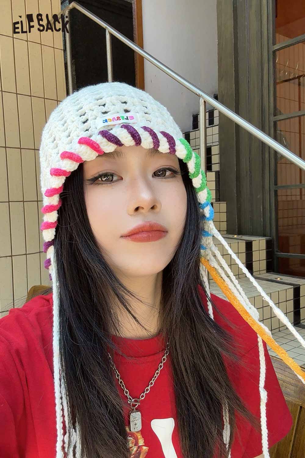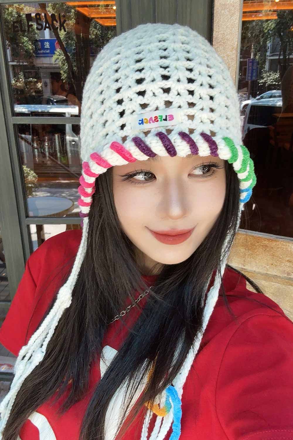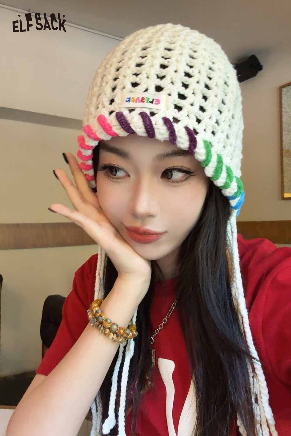 Cotton Knit Braided Tassel Color Block Cute Openwork Crochet Beanie