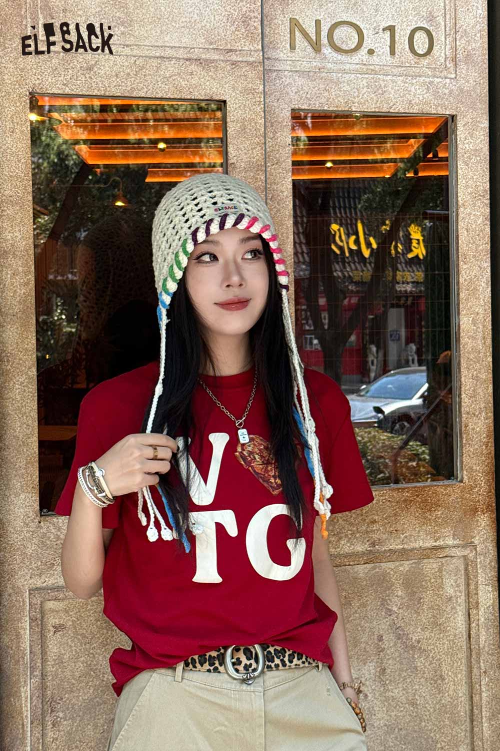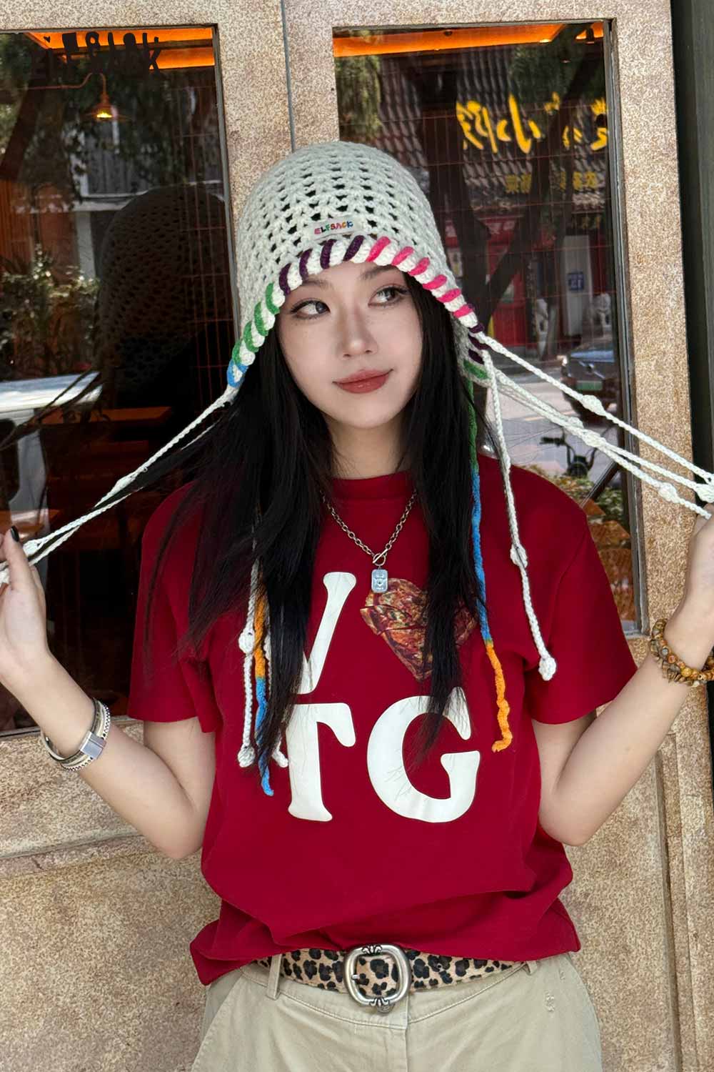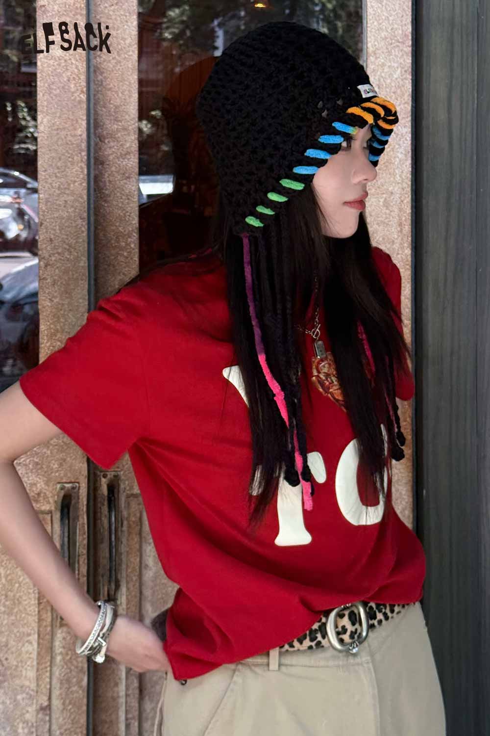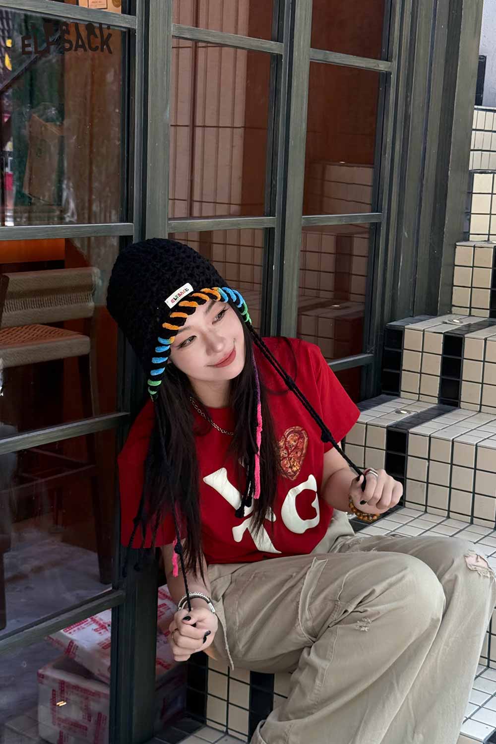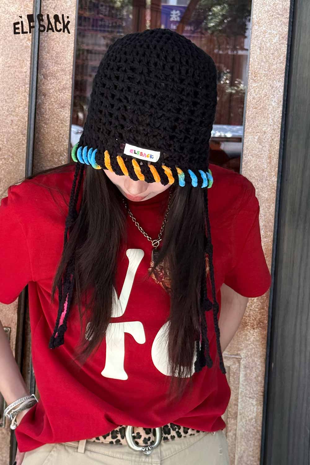 Cotton Knit Braided Tassel Color Block Cute Openwork Crochet Beanie