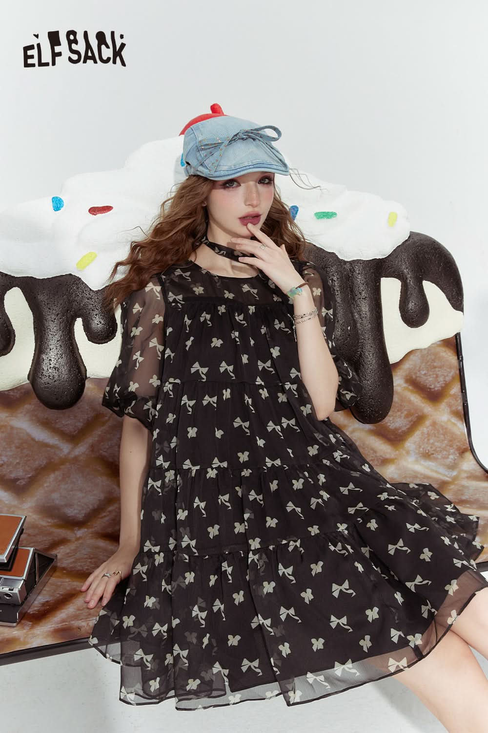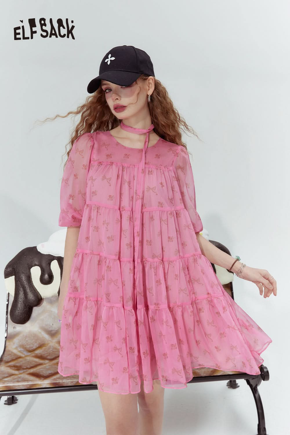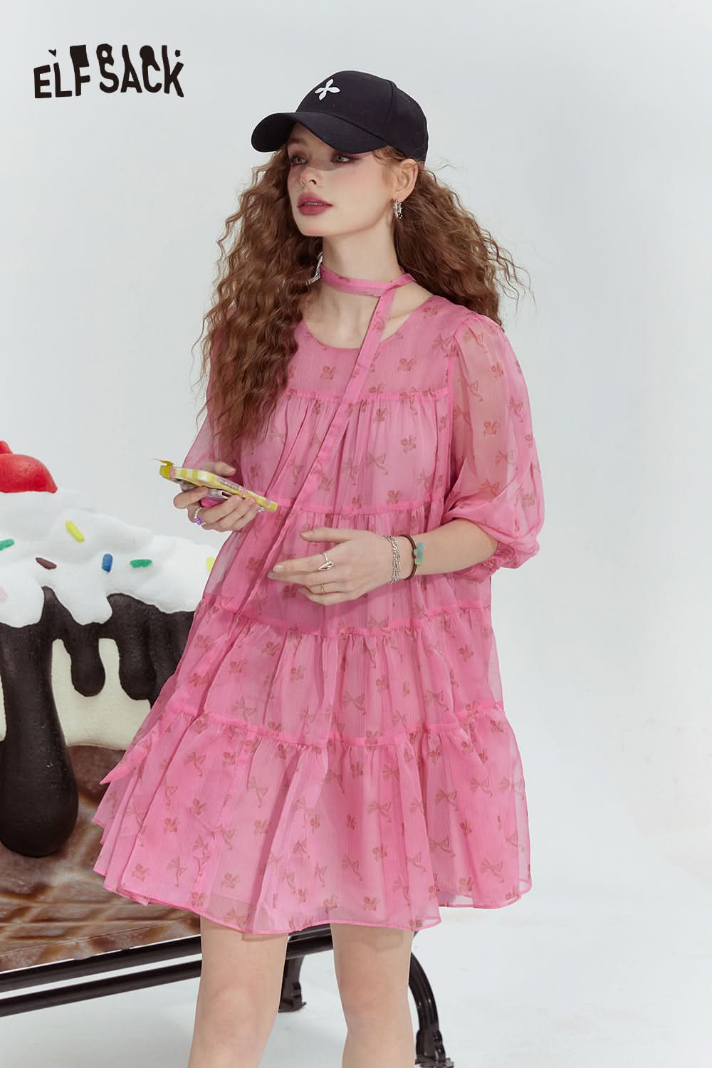 Pink Bow Cute Princess Style Cake Print Chiffon Dress