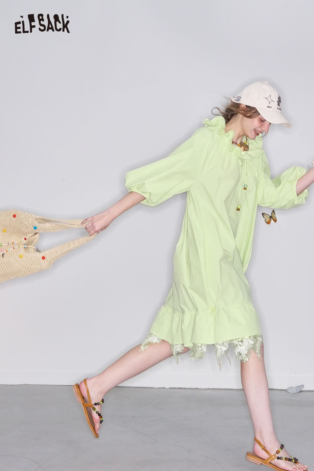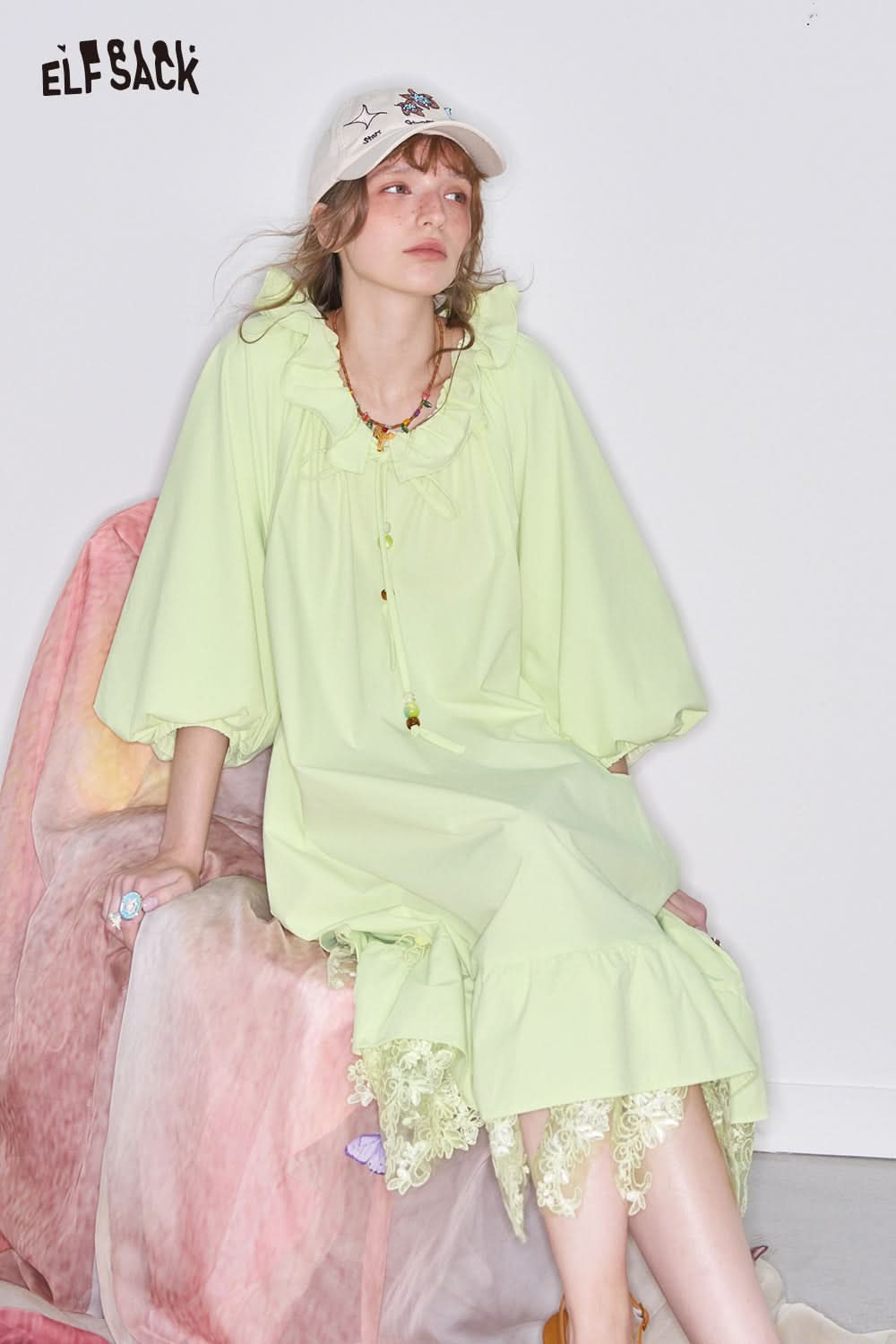 Y2K Sweet Lace Stitching Dress Women Lantern Sleeve Oversize Dress