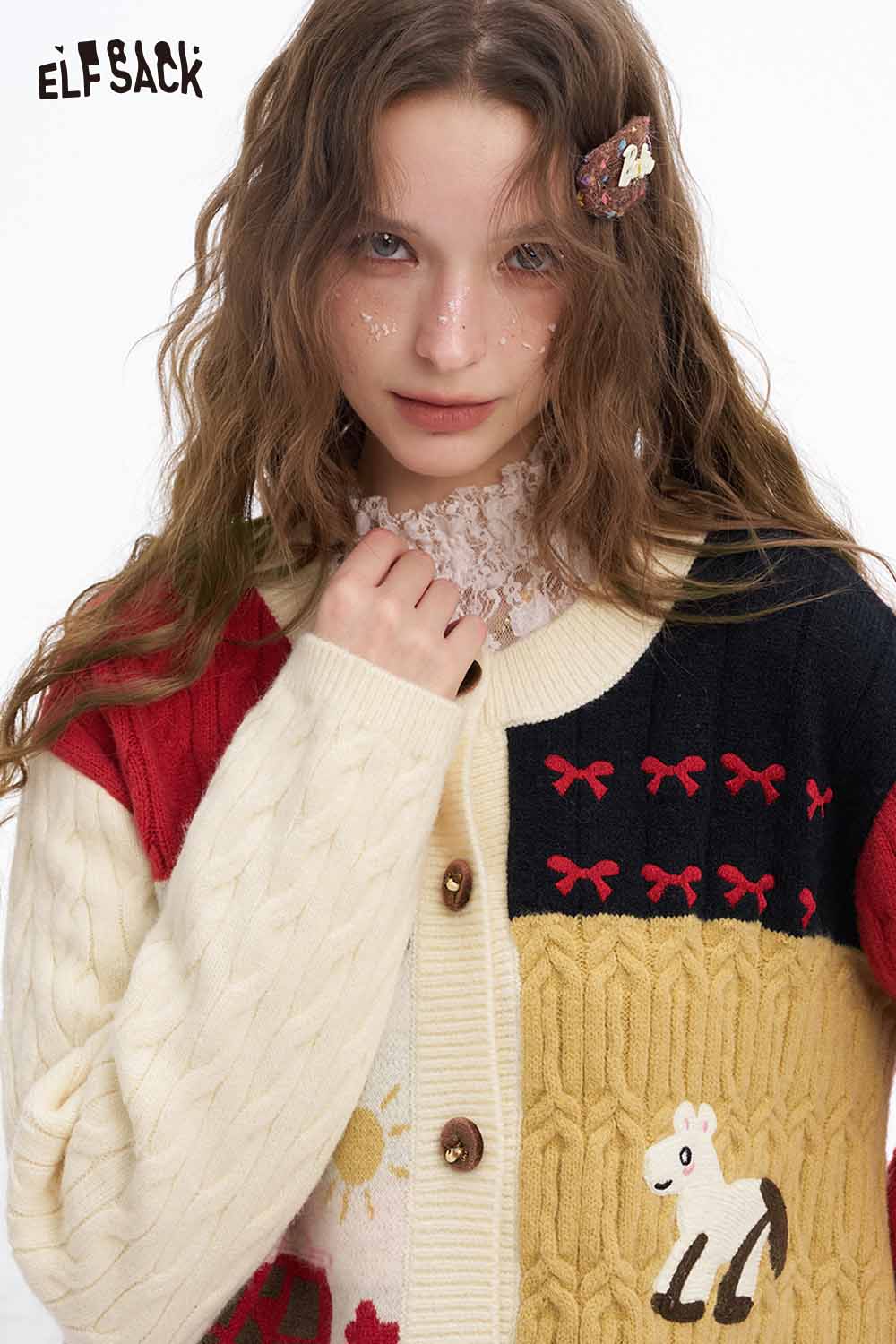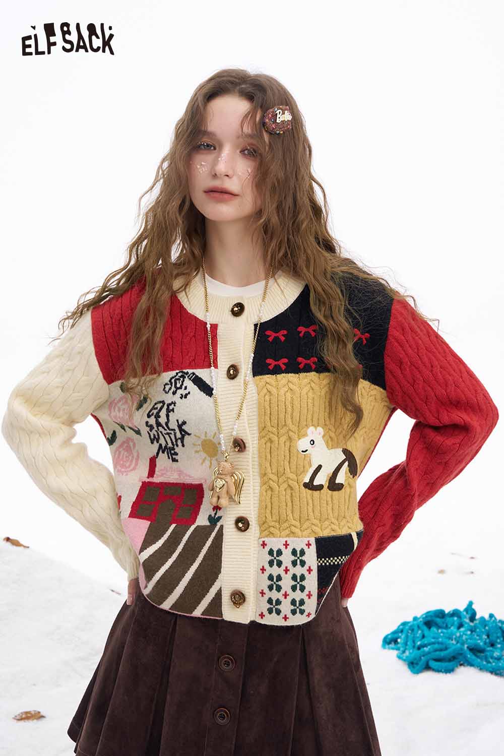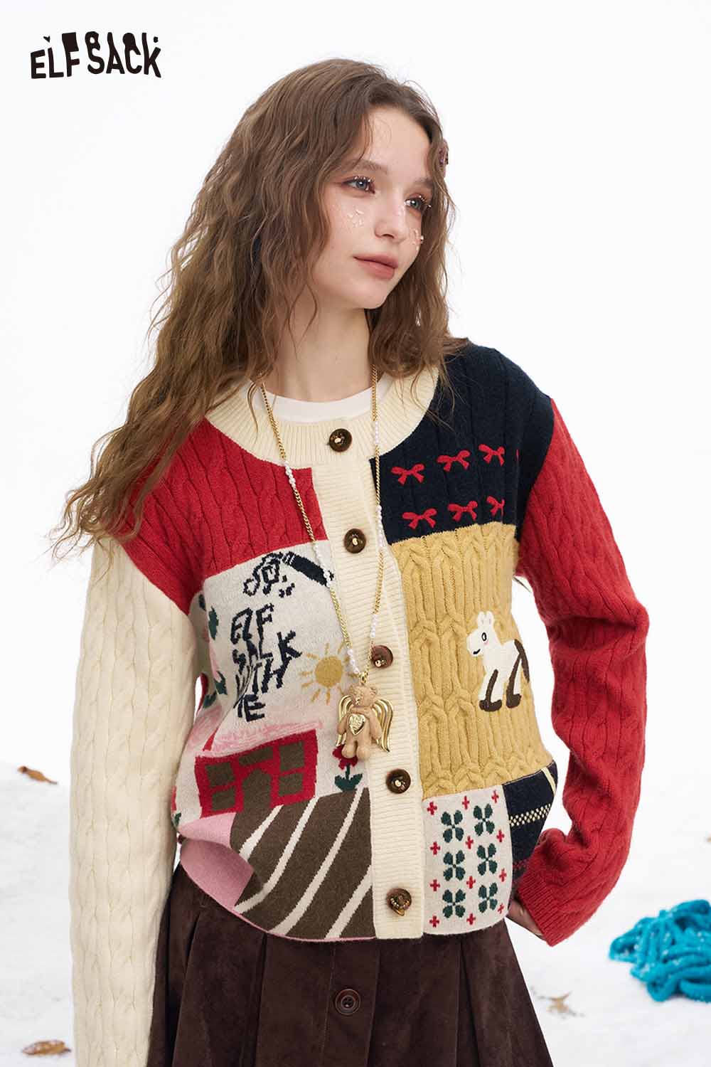 Cute Graphic Patchwork Slim Fit Button Cardigan