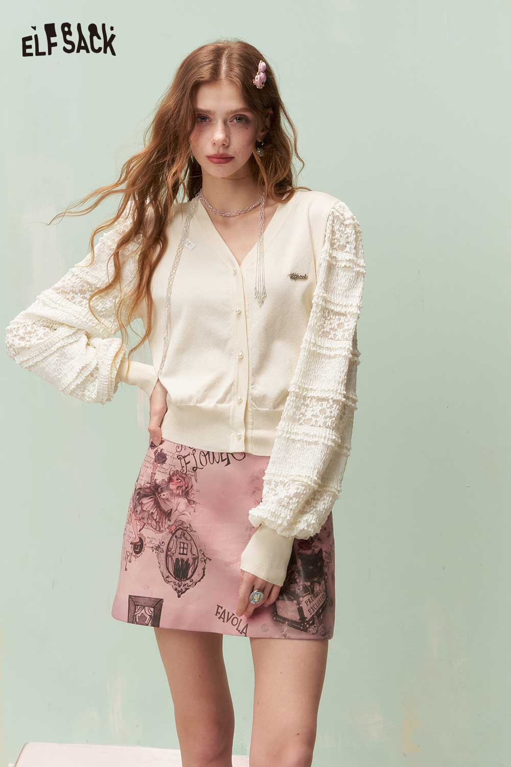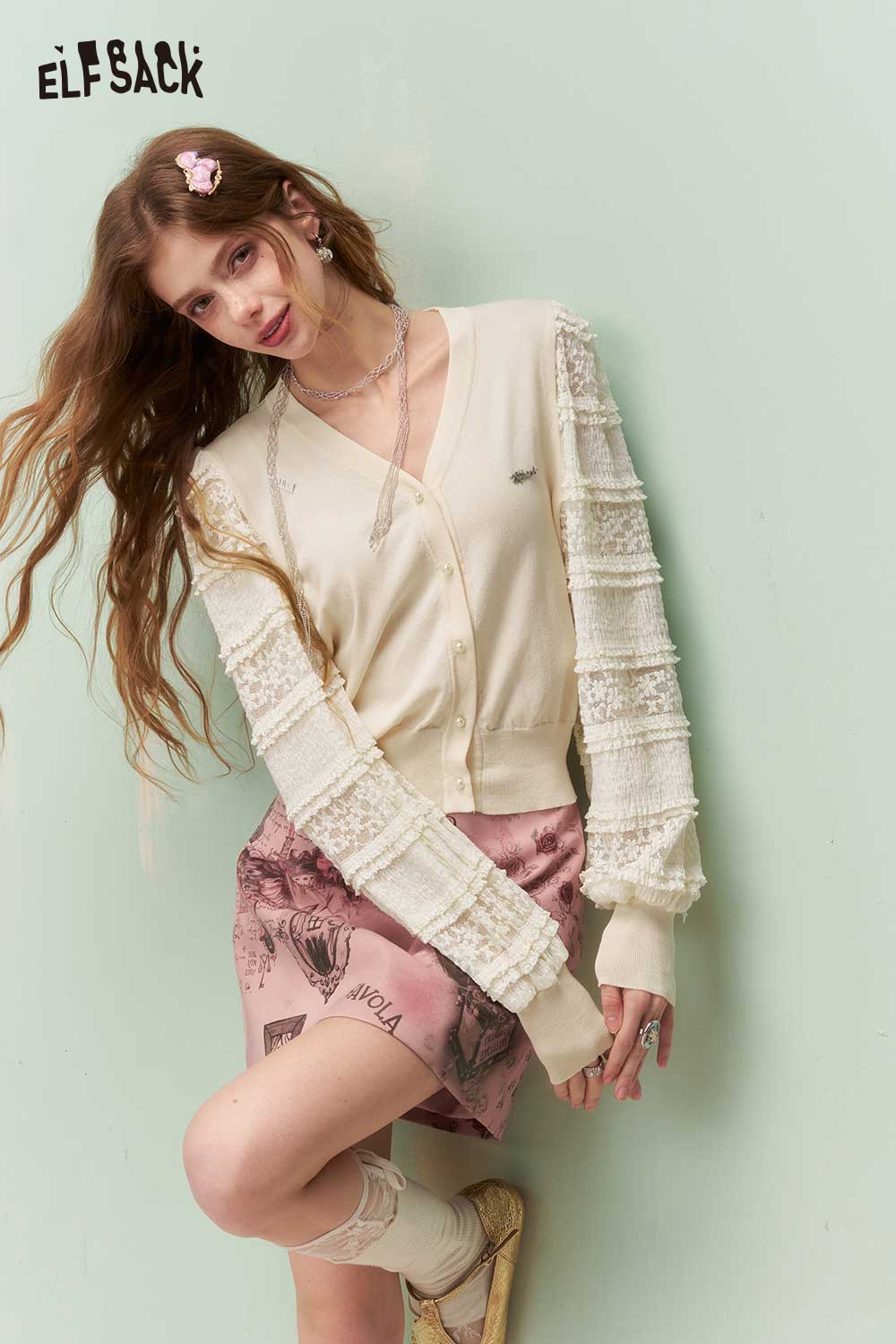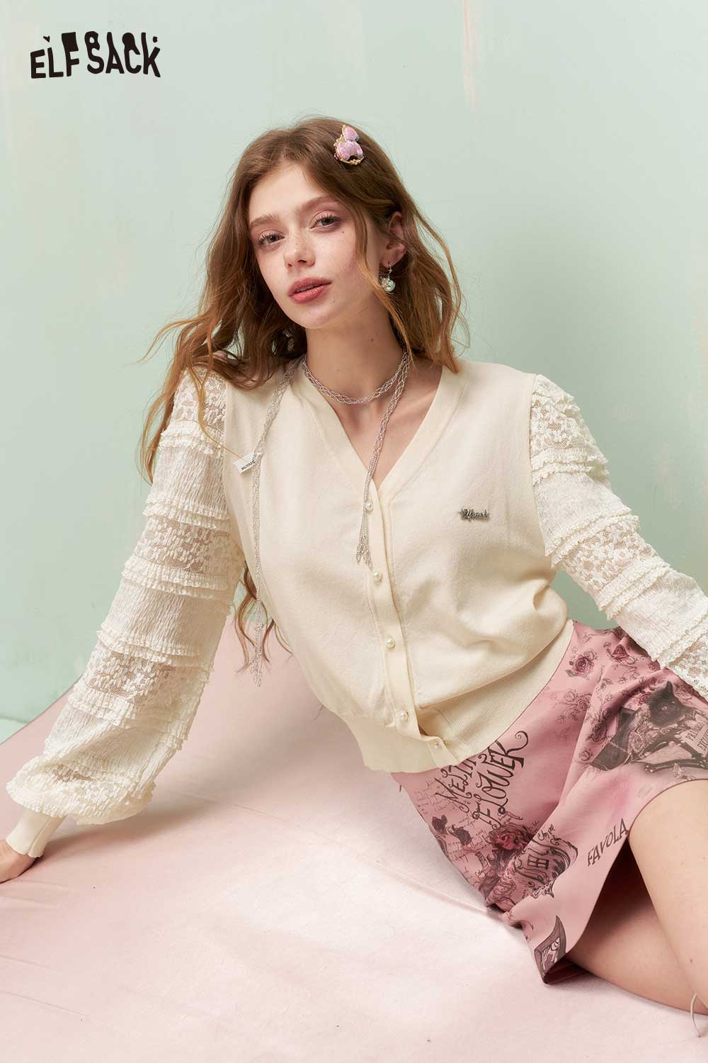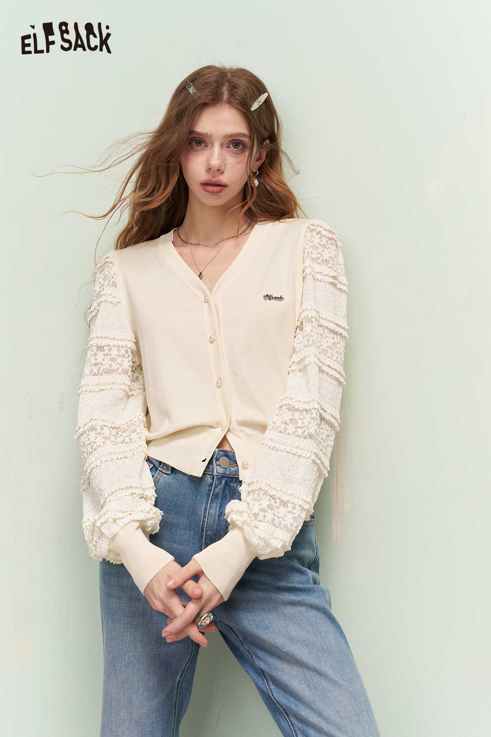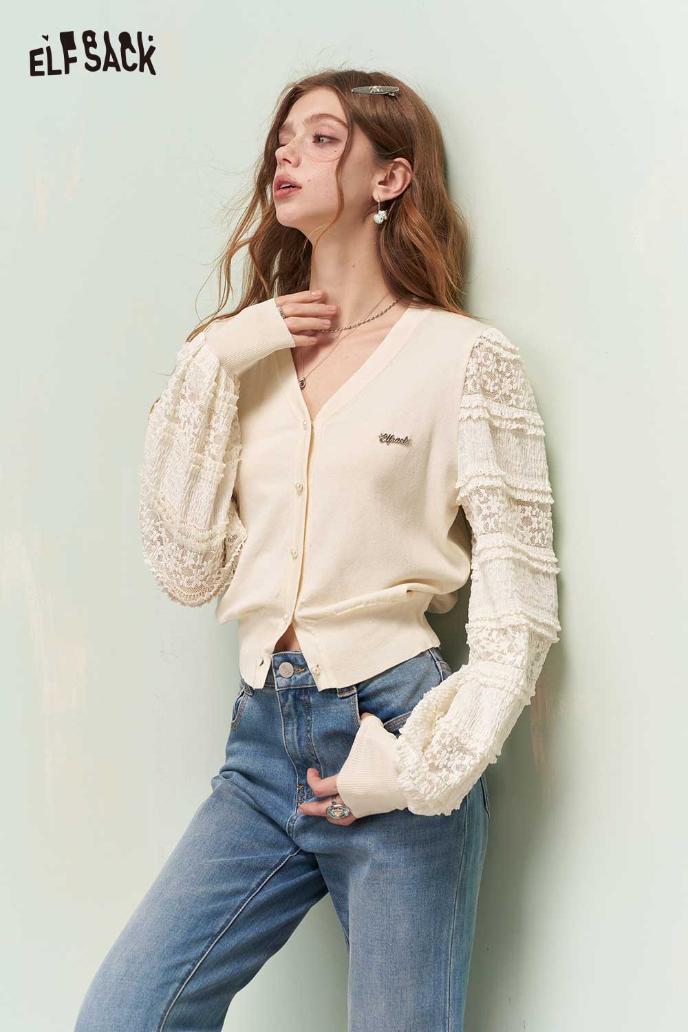 Romantic Cropped Knit Cardigan with Elegant Lace Sleeves