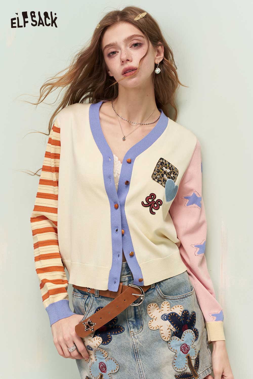 Asymmetrical Knit Cardigan with Patch Embroidery & Jacquard Sleeves