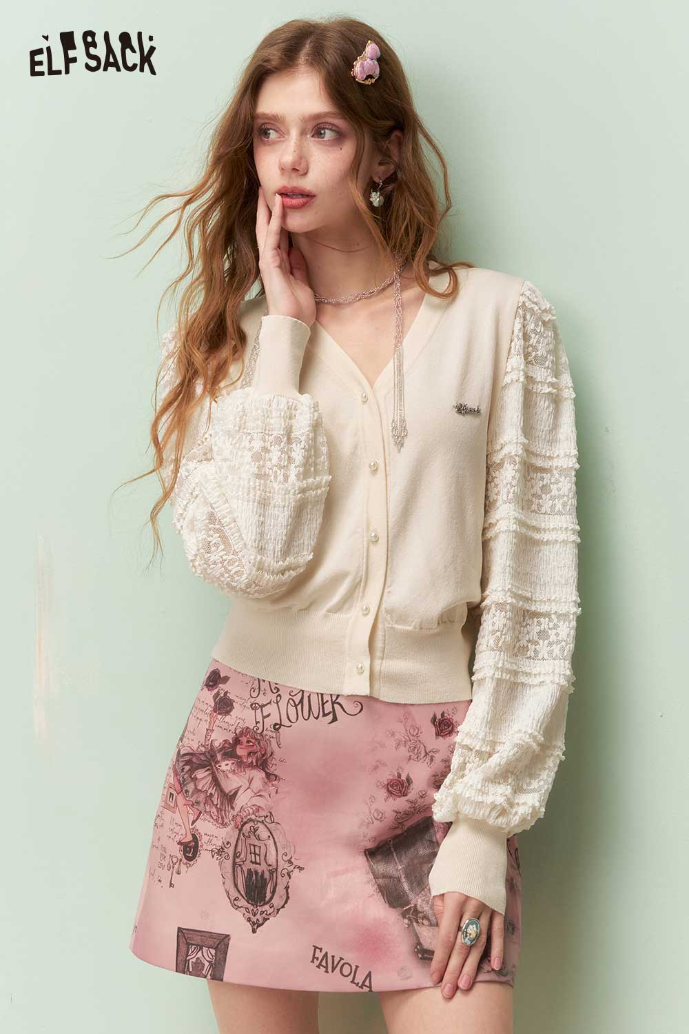 Romantic Cropped Knit Cardigan with Elegant Lace Sleeves