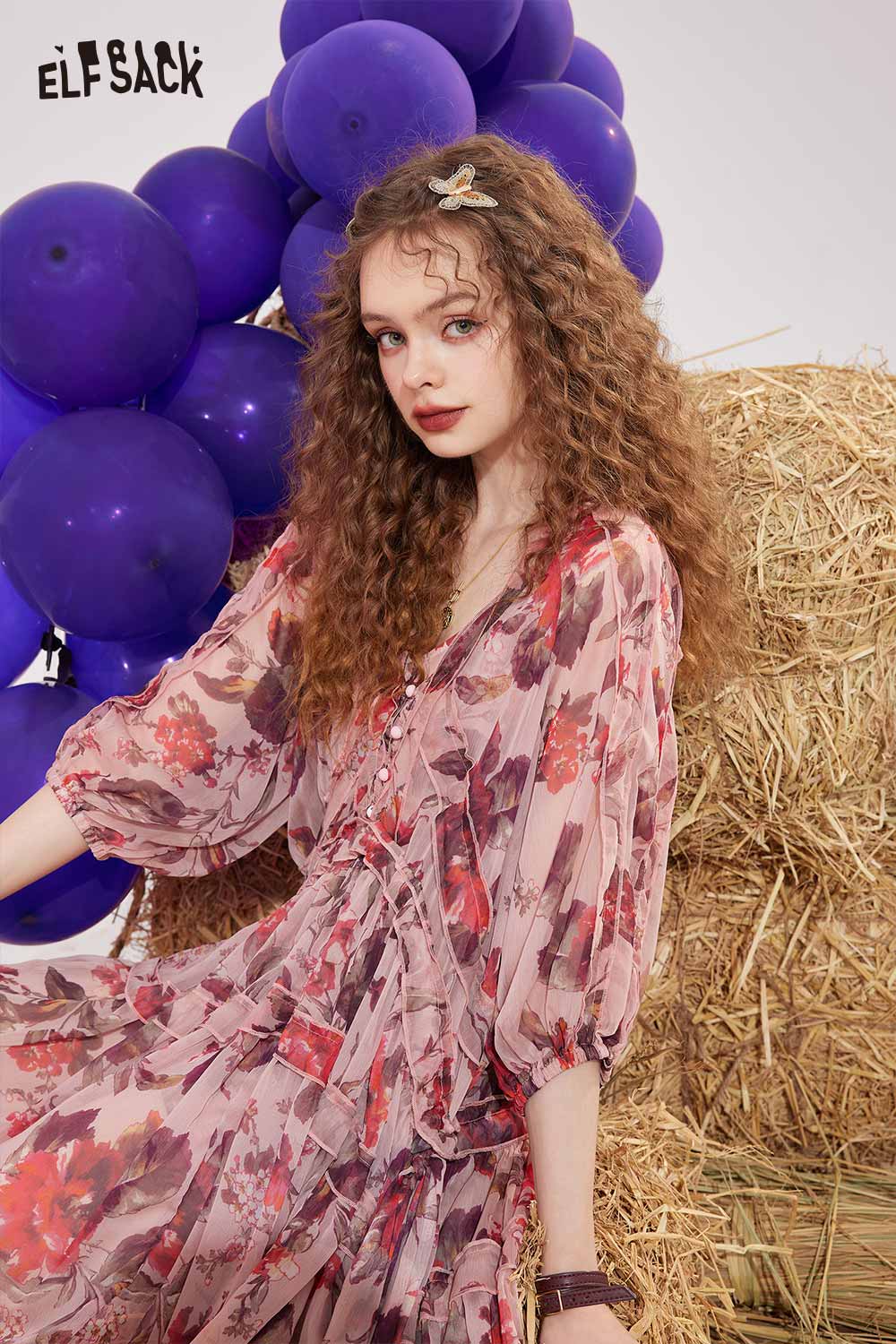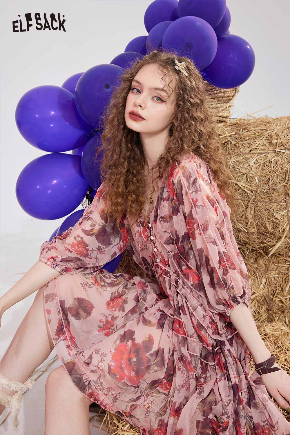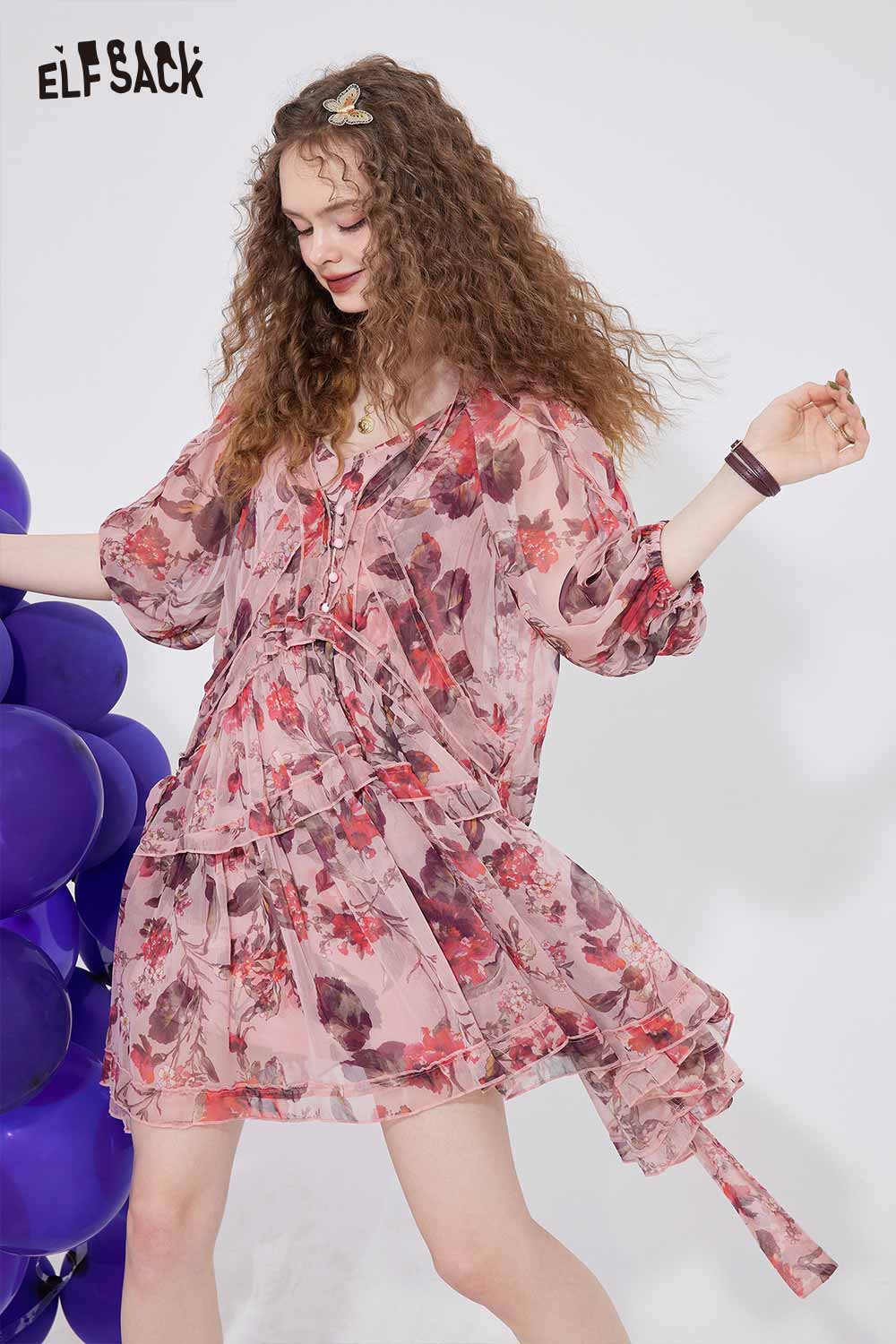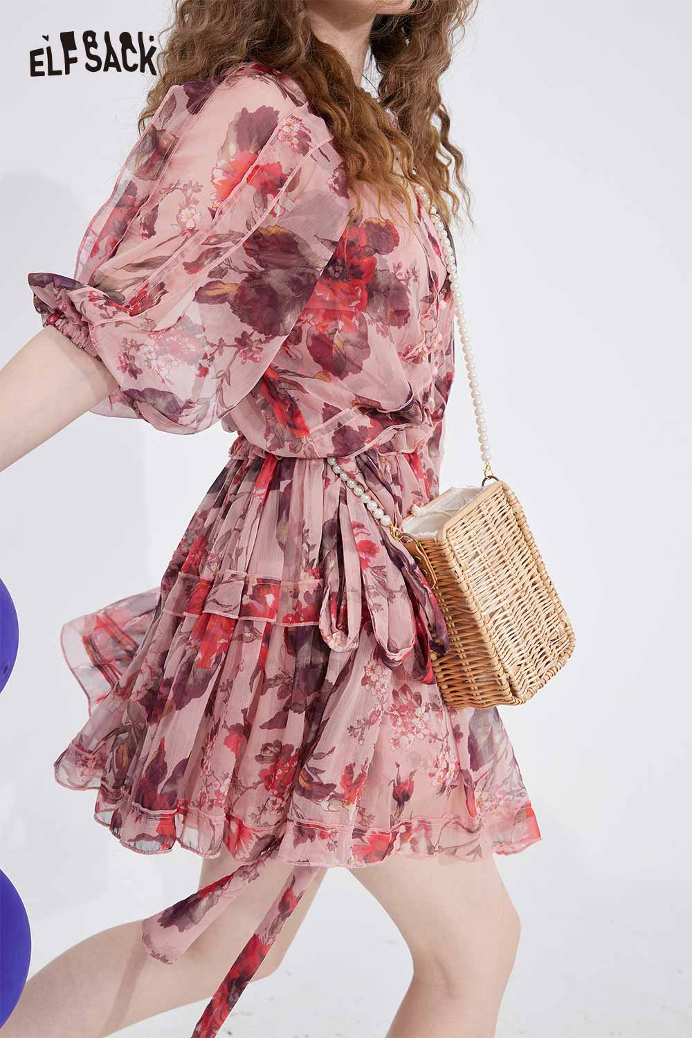 Floral Chiffon V Neck Waist Tie Dress
